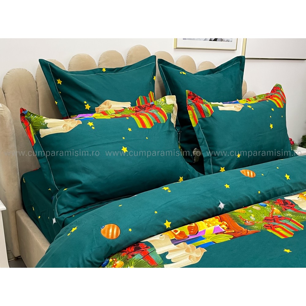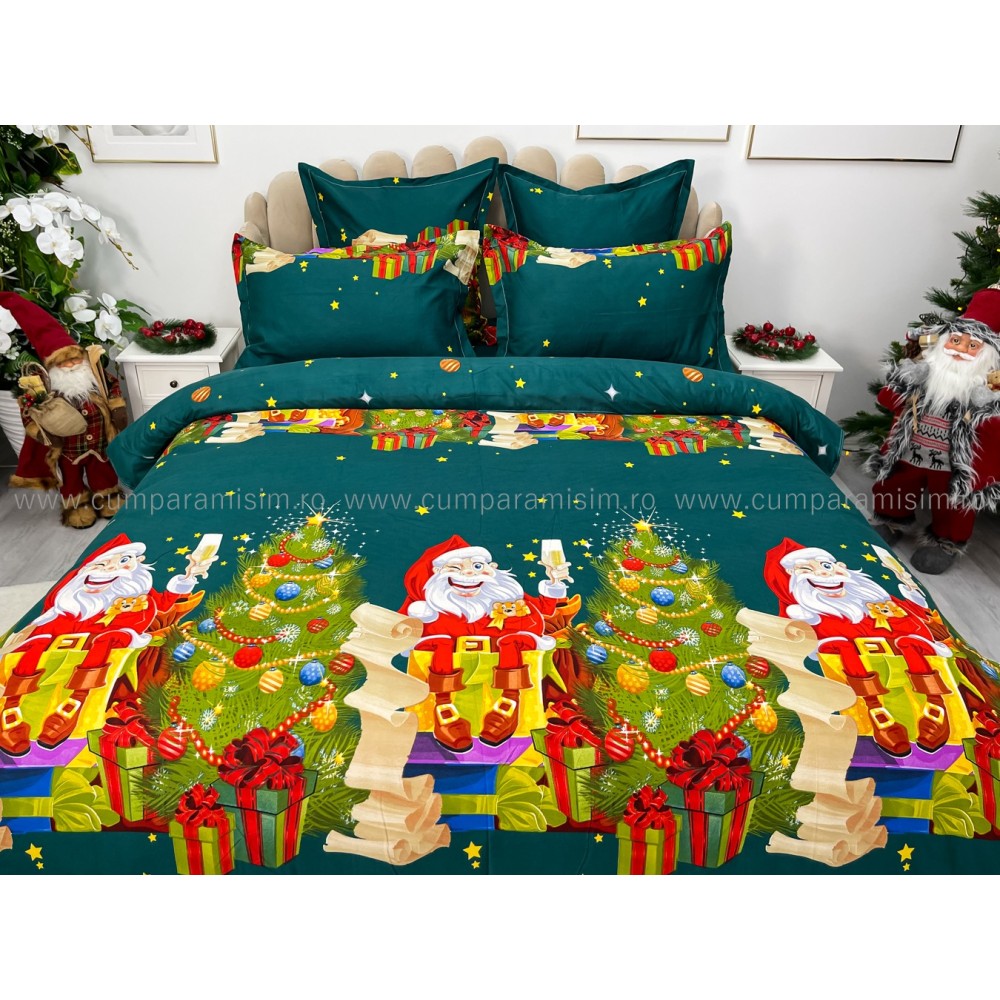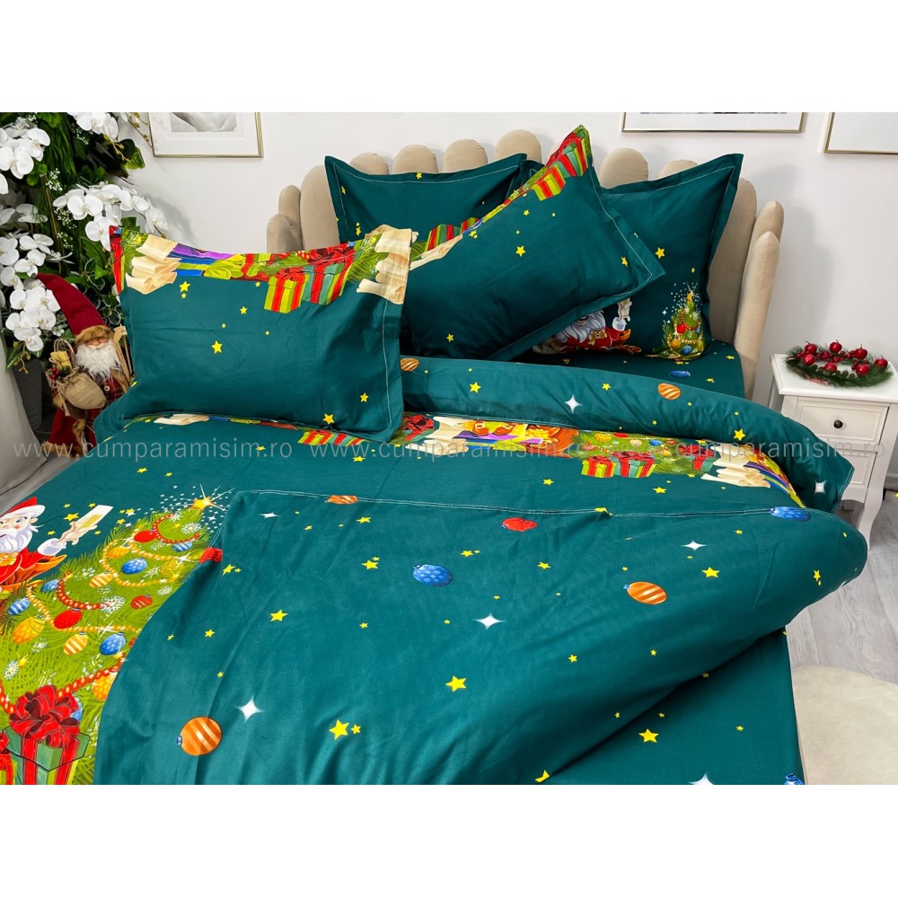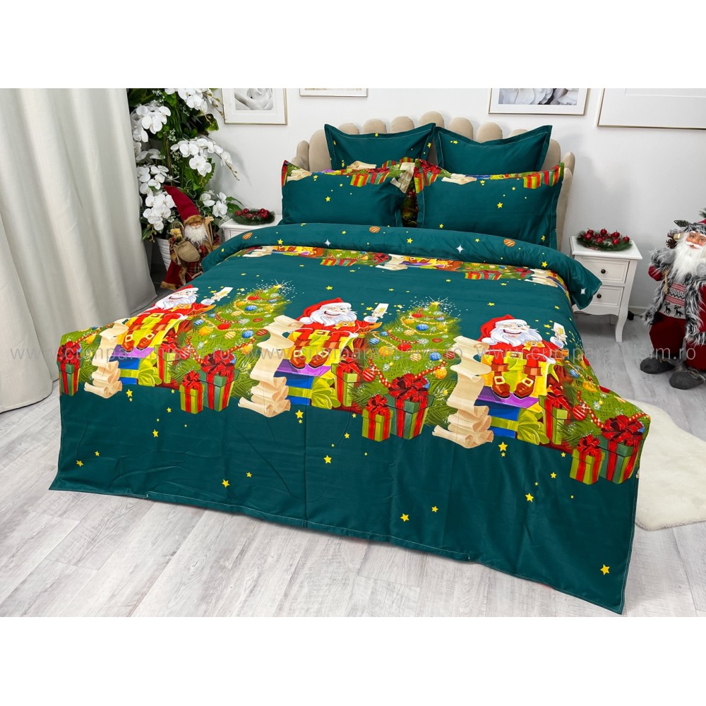 Lenjerie pat dublu, FINET, 6 piese, Craciun, Jojo Home, Verde-Multicolor, Mos Craciun, brazi, cadouri, cod produs: JOM15