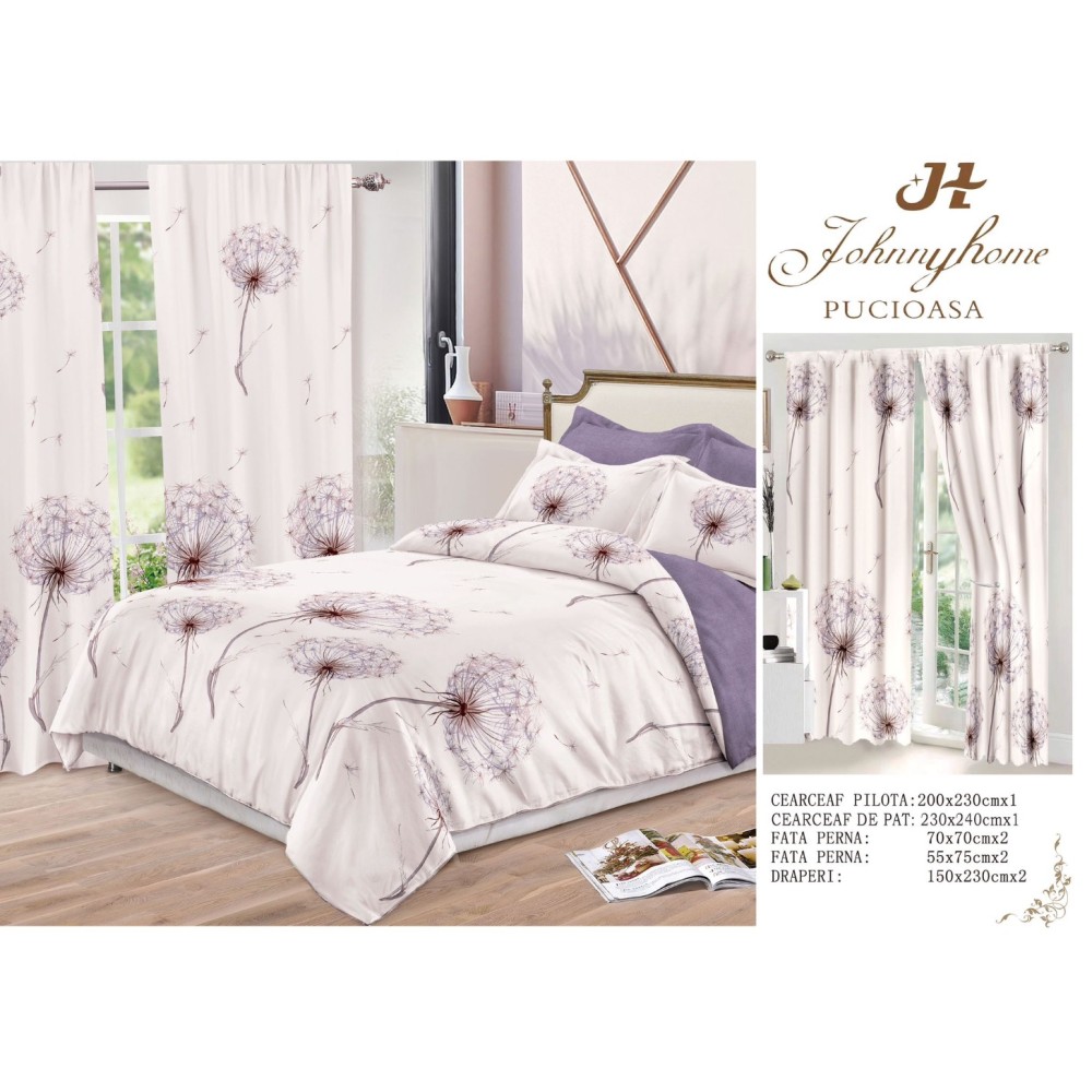 Lenjerie pat dublu, FINET, 8 piese, cu 2 DRAPERII INCLUSE, Bej, papadii, Johny Home Pucioasa, cod produs: SPR-S-04