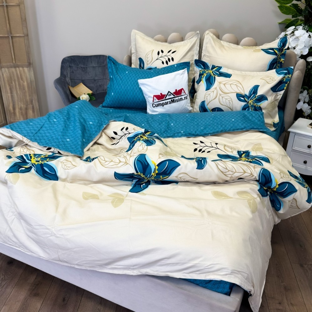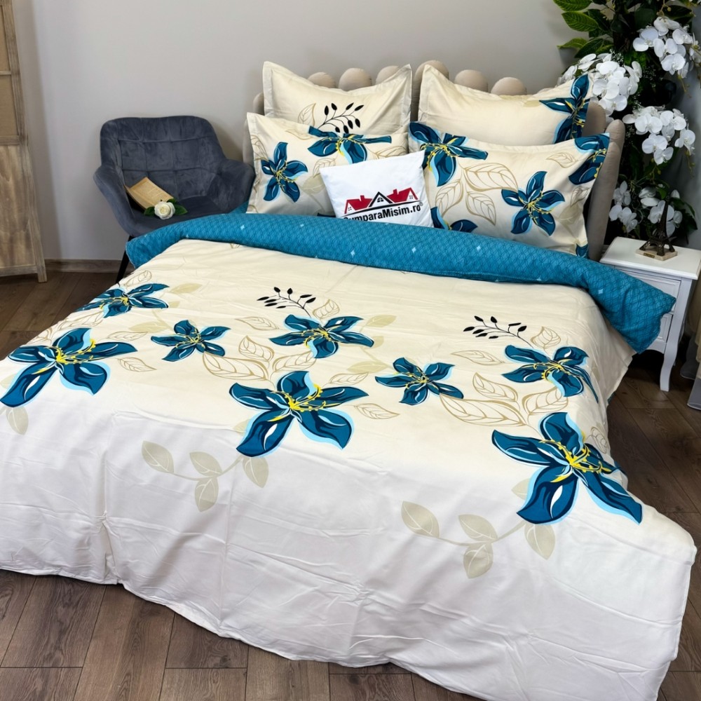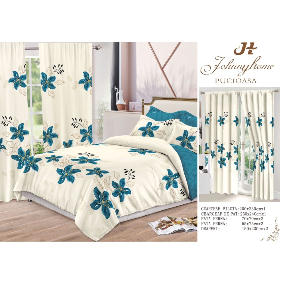 Lenjerie pat dublu, FINET, 8 piese, cu 2 DRAPERII INCLUSE, Crem, flori, Johny Home Pucioasa, cod produs: SPR-S-03