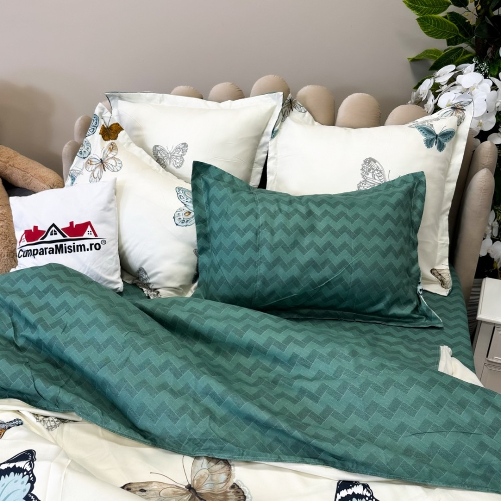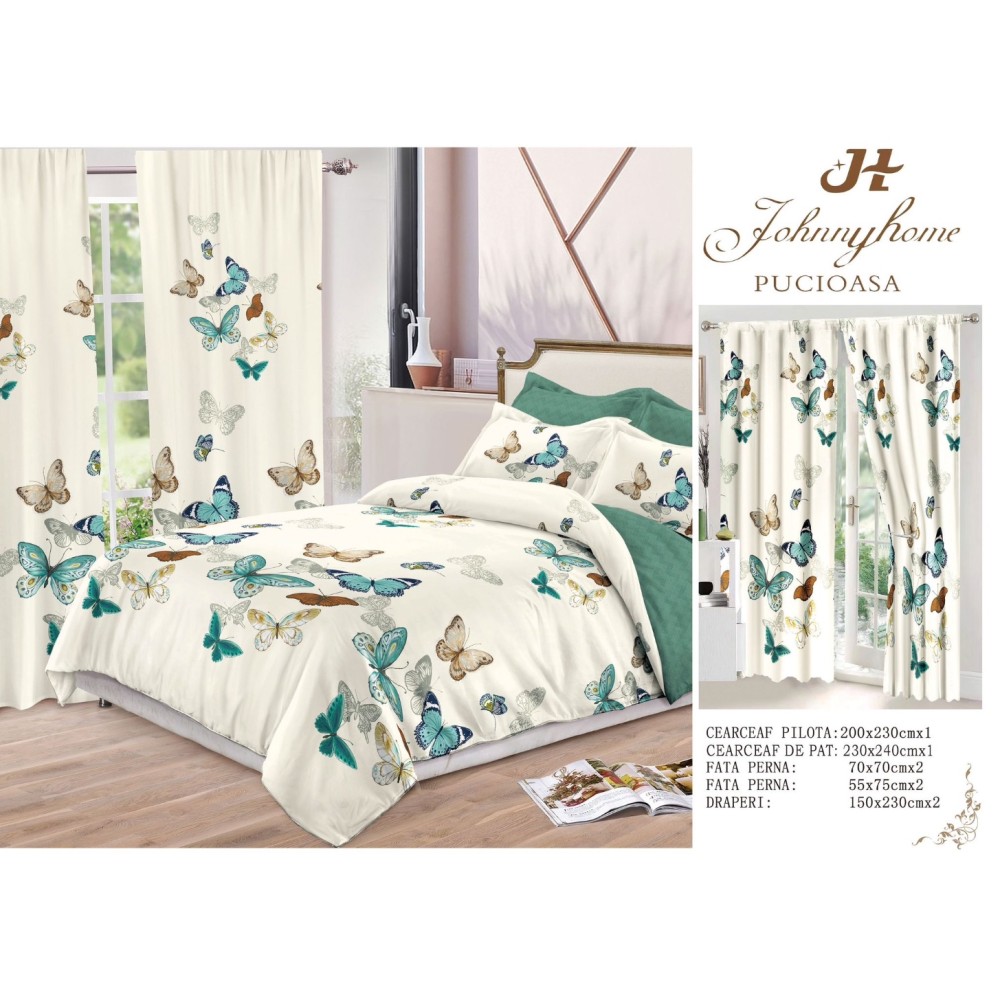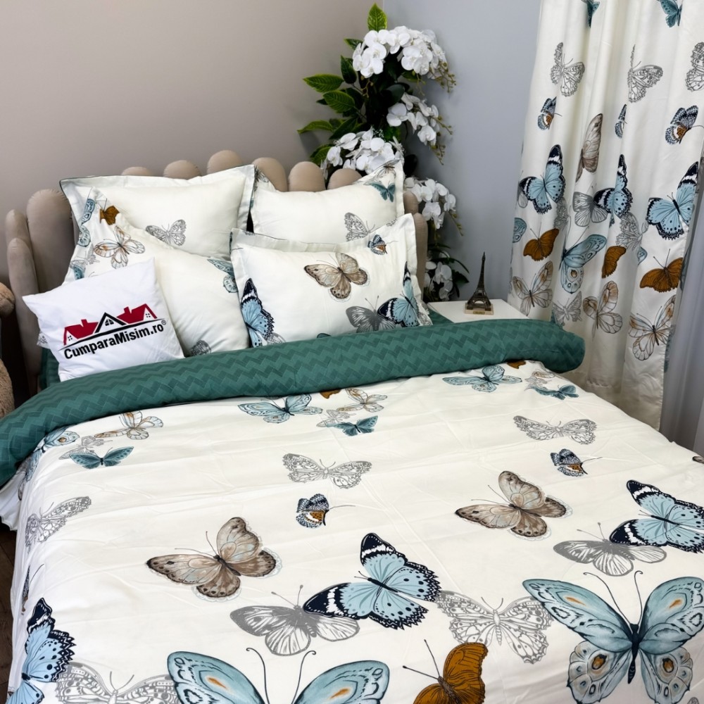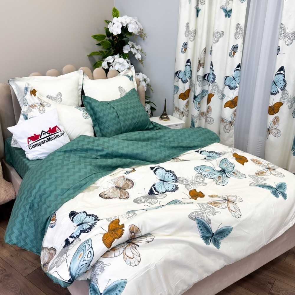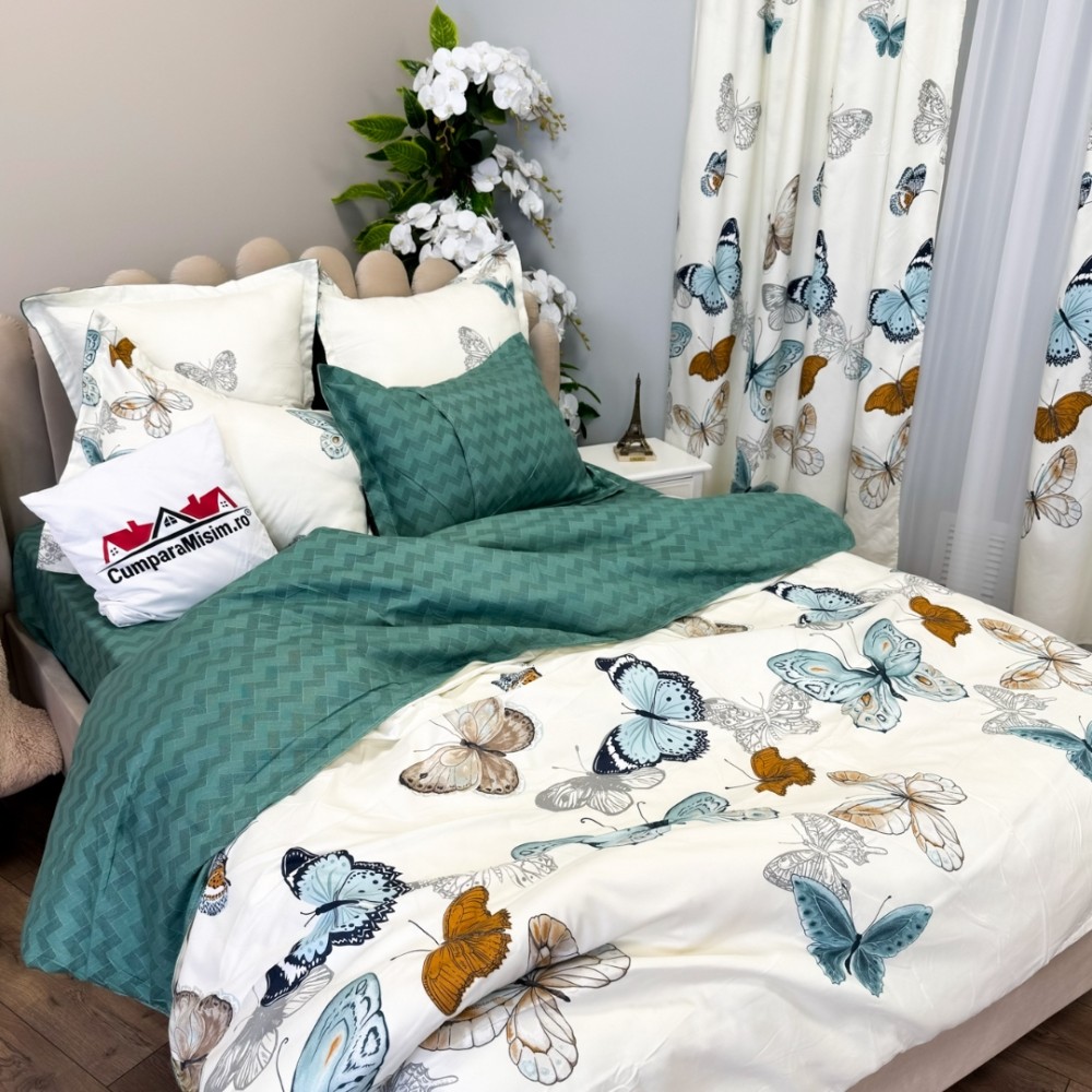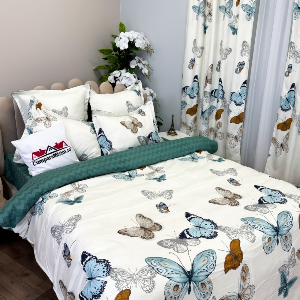 Set lenjerie de pat din bumbac finet, 8 piese, cu draperii incluse – Model fluturi