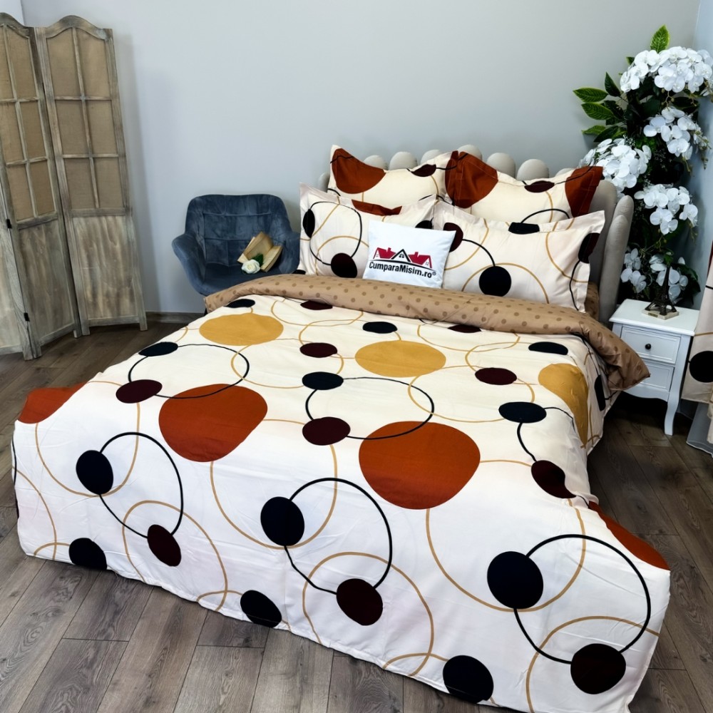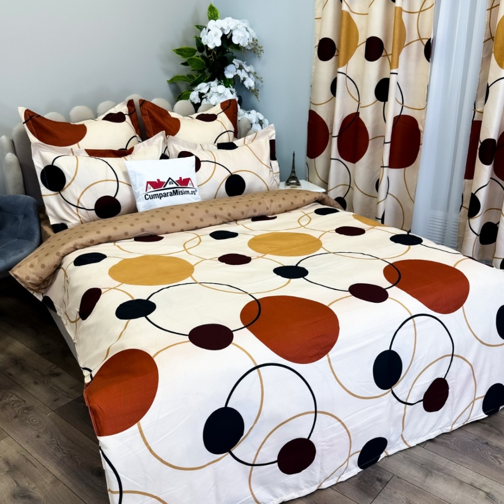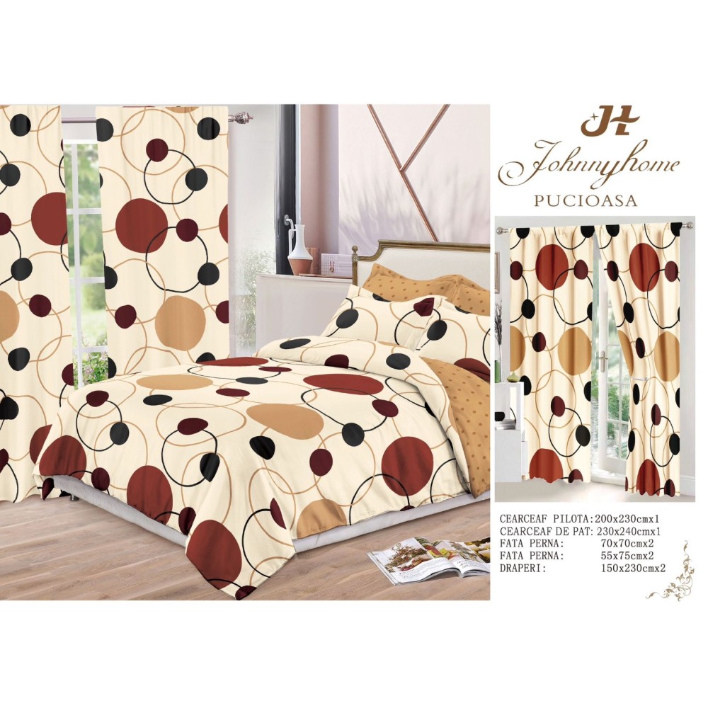 Lenjerie pat dublu, FINET, 8 piese, cu 2 DRAPERII INCLUSE, Crem, Maro, cercuri, buline, Johny Home Pucioasa, cod produs: SPR-S-08
