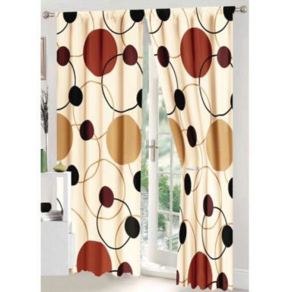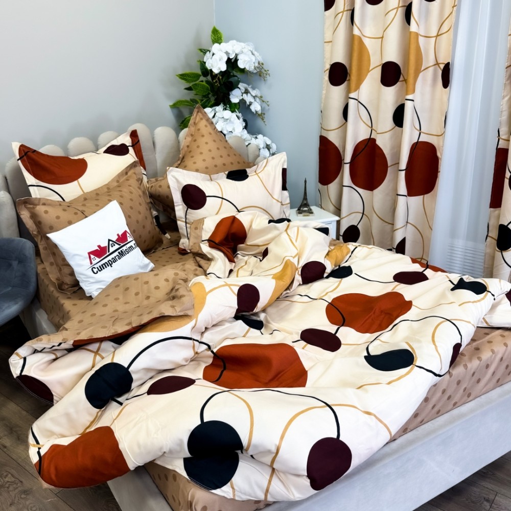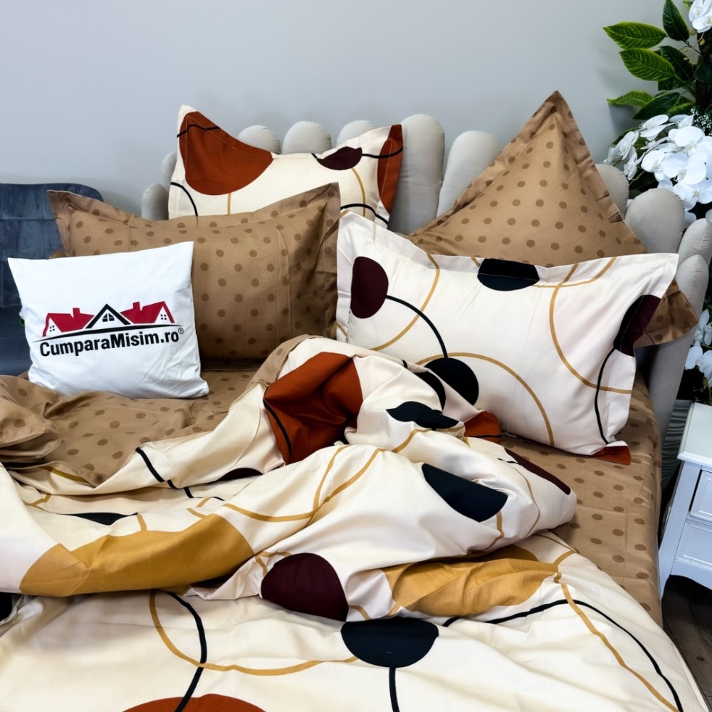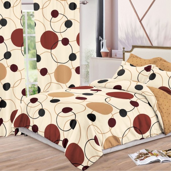Lenjerie pat dublu, FINET, 8 piese, cu 2 DRAPERII INCLUSE, Crem, Maro, cercuri, buline, Johny Home Pucioasa, cod produs: SPR-S-08