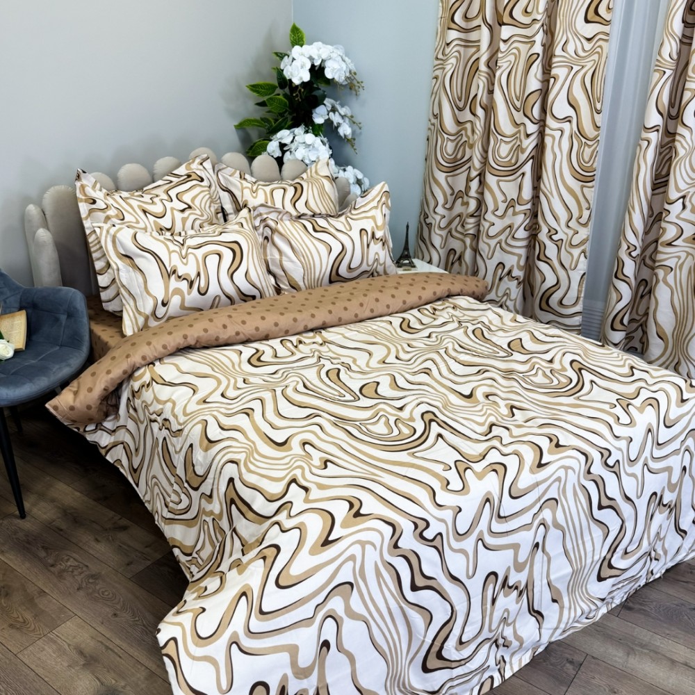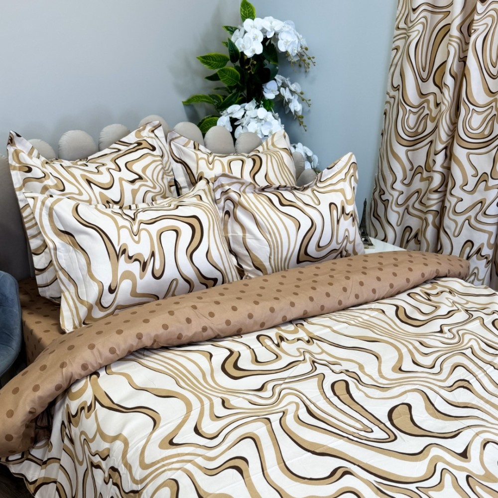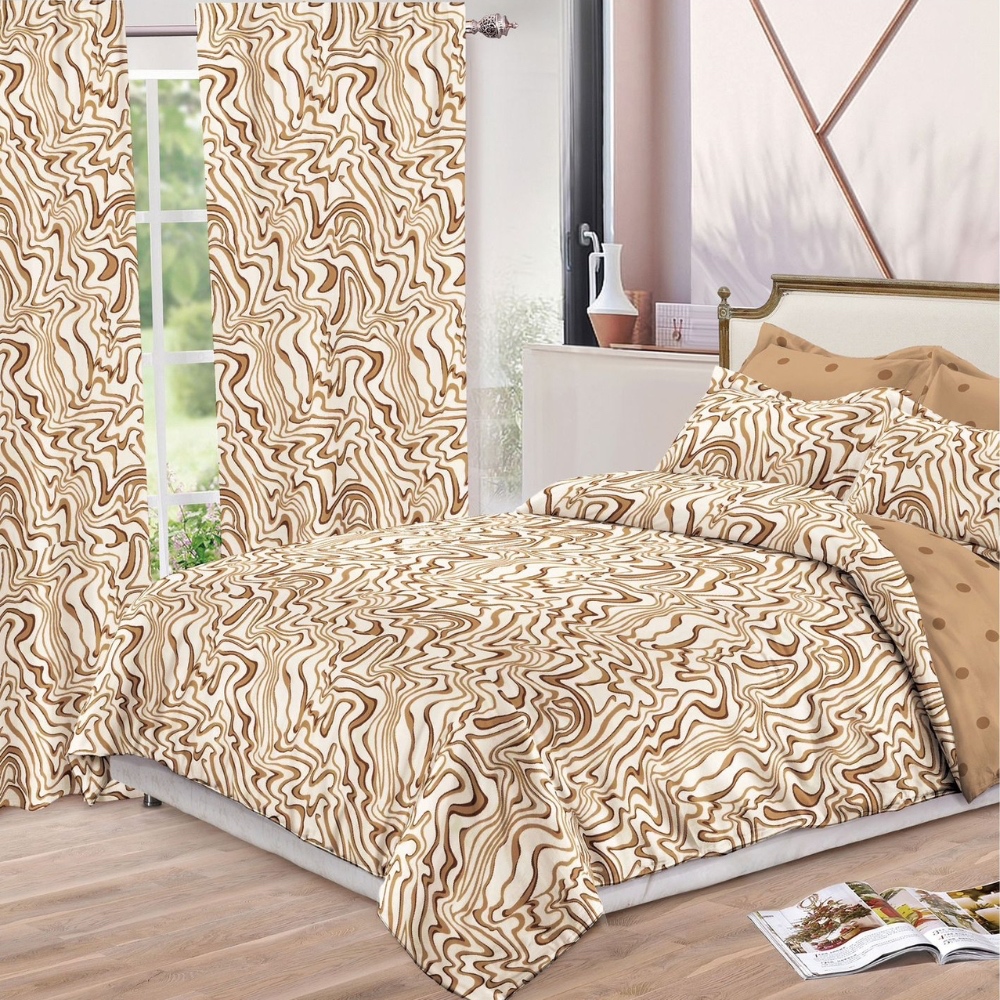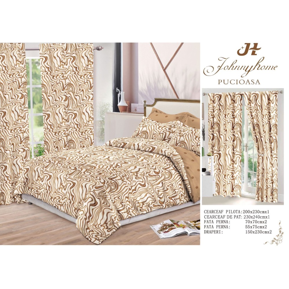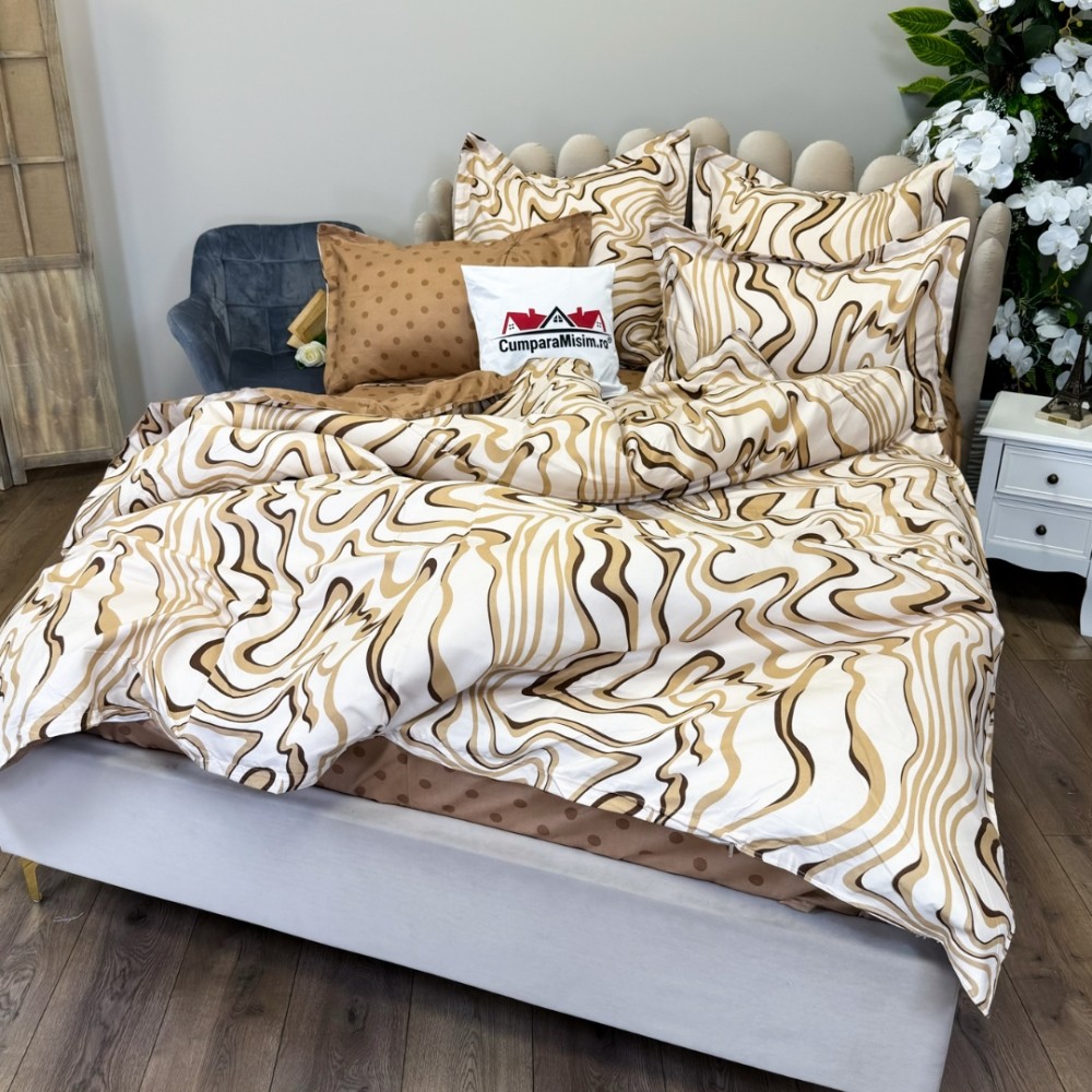 Lenjerie pat dublu, FINET, 8 piese, cu 2 DRAPERII INCLUSE, Crem, Maro, valuri, Johny Home Pucioasa, cod produs: SPR-S-12