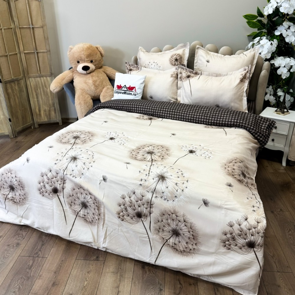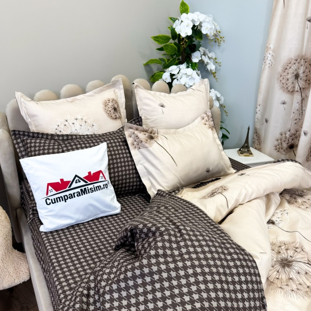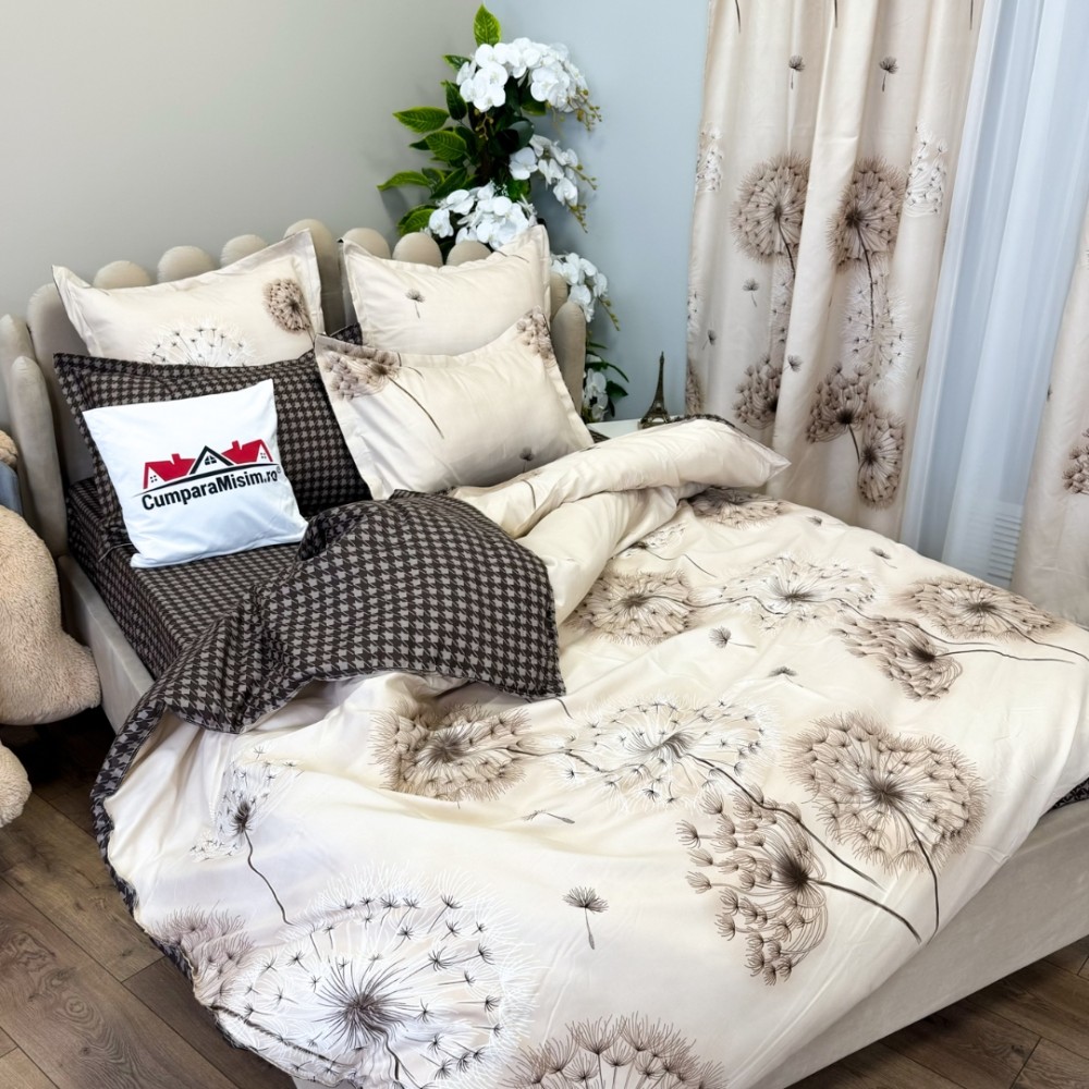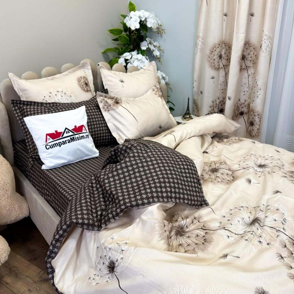 Lenjerie pat dublu, FINET, 8 piese, cu 2 DRAPERII INCLUSE, Greu, Maro, păpădii , Johny Home Pucioasa, cod produs: SPR-S-19