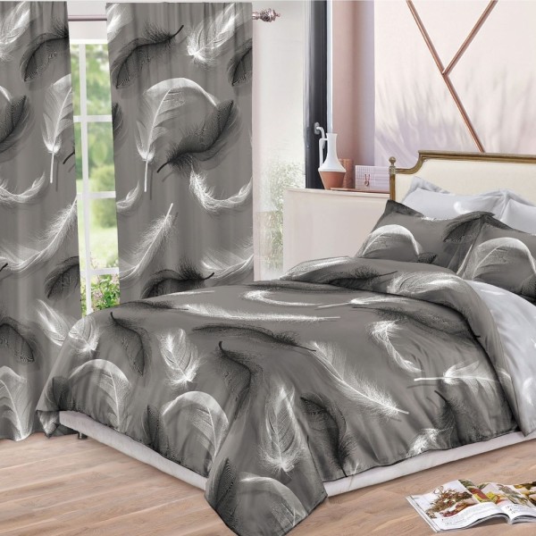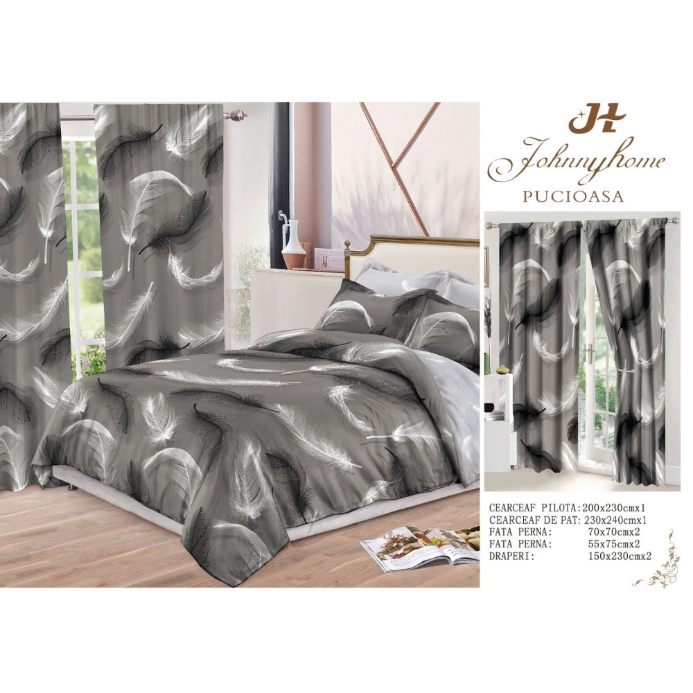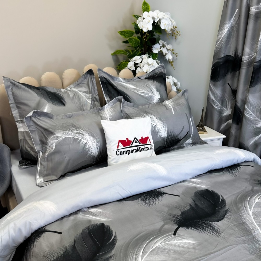 Lenjerie pat dublu, FINET, 8 piese, cu 2 DRAPERII INCLUSE, Gri, Alb, pene, Johny Home Pucioasa, cod produs: SPR-S-09