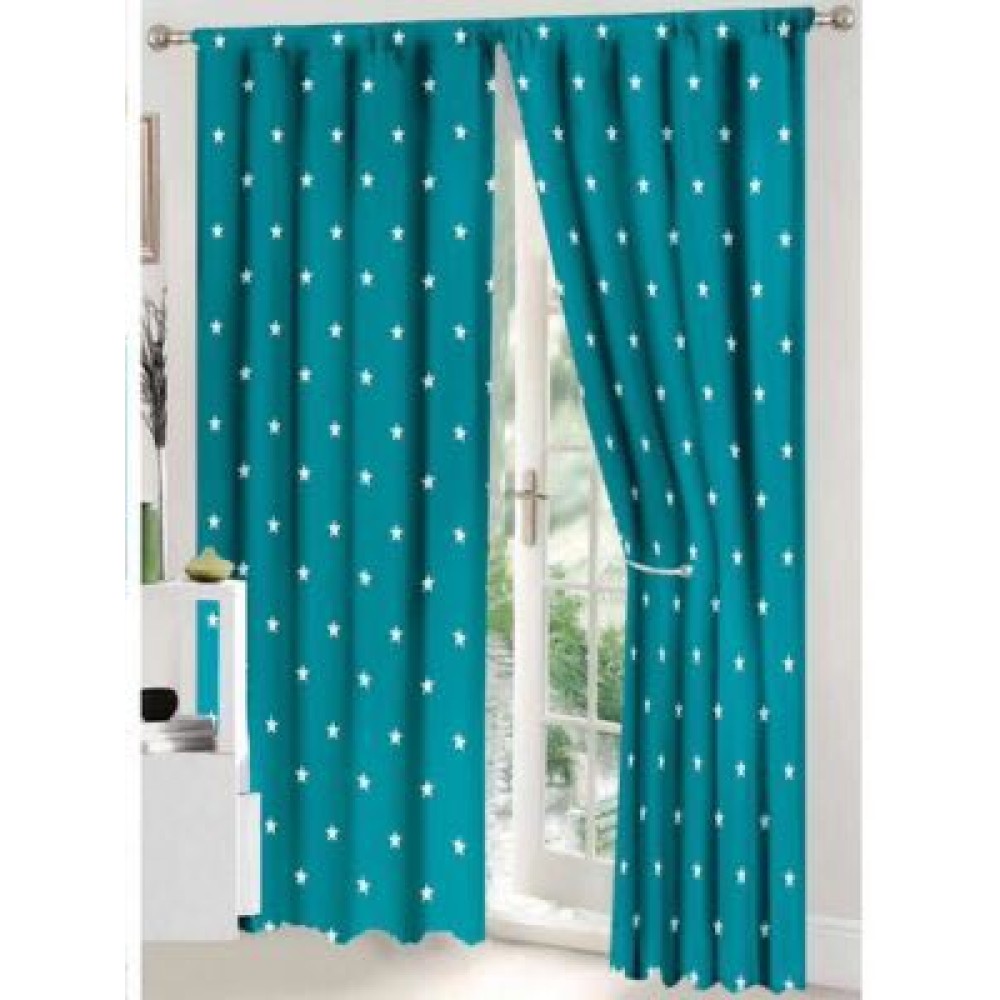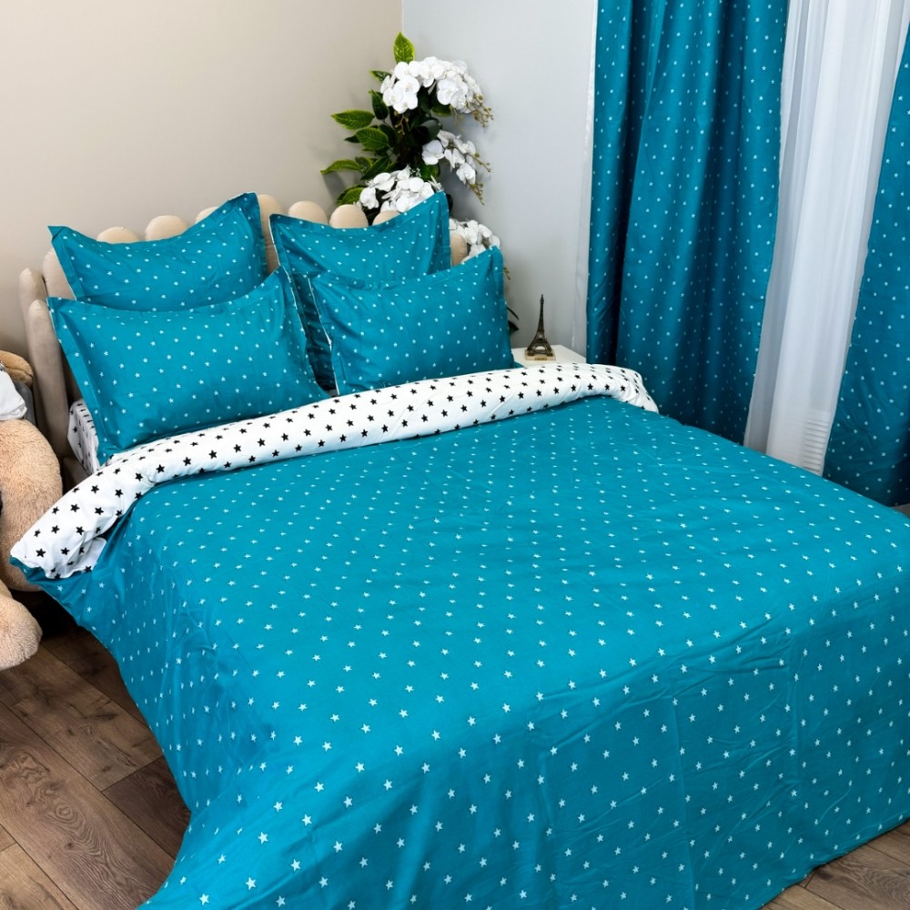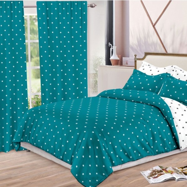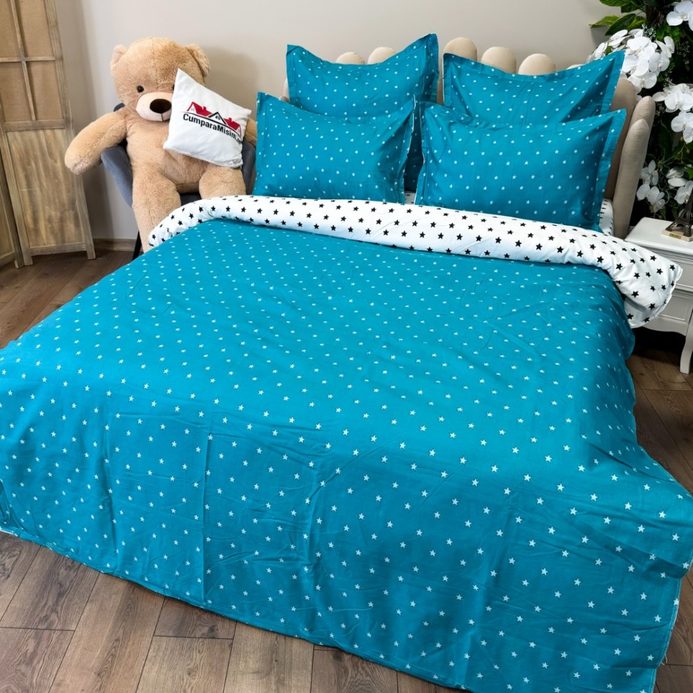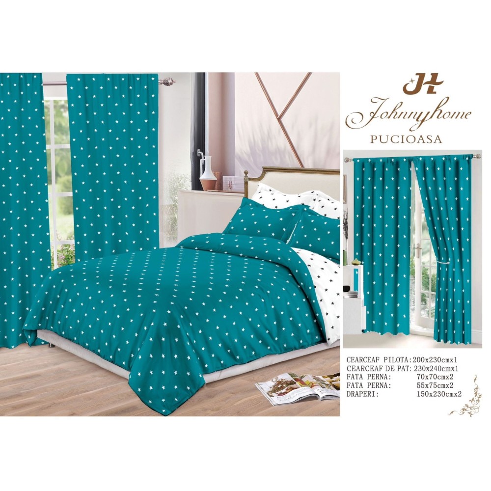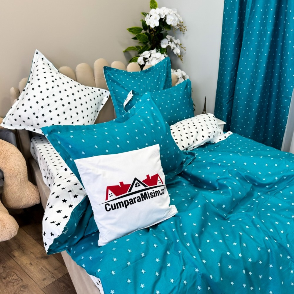 Lenjerie pat dublu, FINET, 8 piese, cu 2 DRAPERII INCLUSE, Turquoise, Alb, stelute, Johny Home Pucioasa, cod produs: SPR-S-13