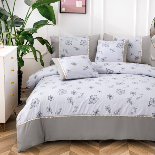 Lenjerie pat dublu, Finet, CEARSAF CU ELASTIC, 6 piese, Gri, model floral, cod produs: PTE3