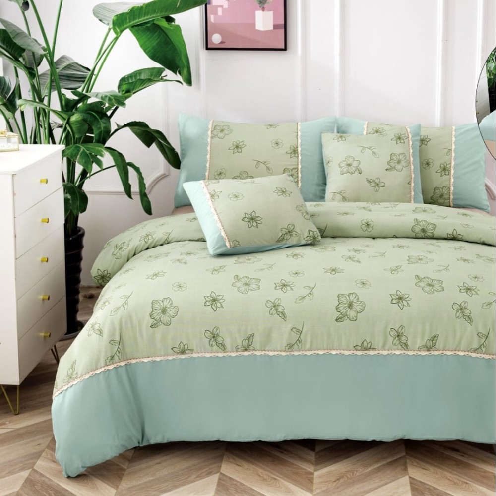 Lenjerie pat dublu, Finet, CEARSAF CU ELASTIC, 6 piese, Verde, model floral, cod produs: PTE4