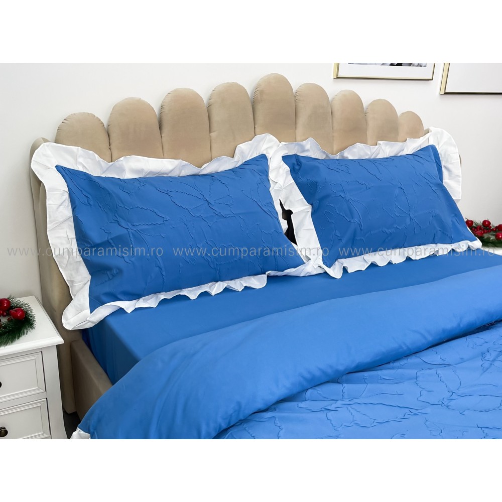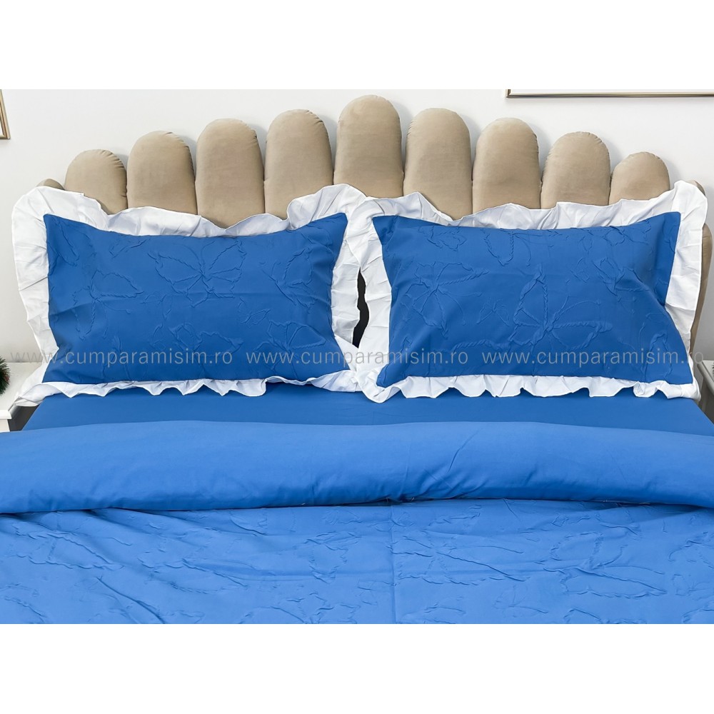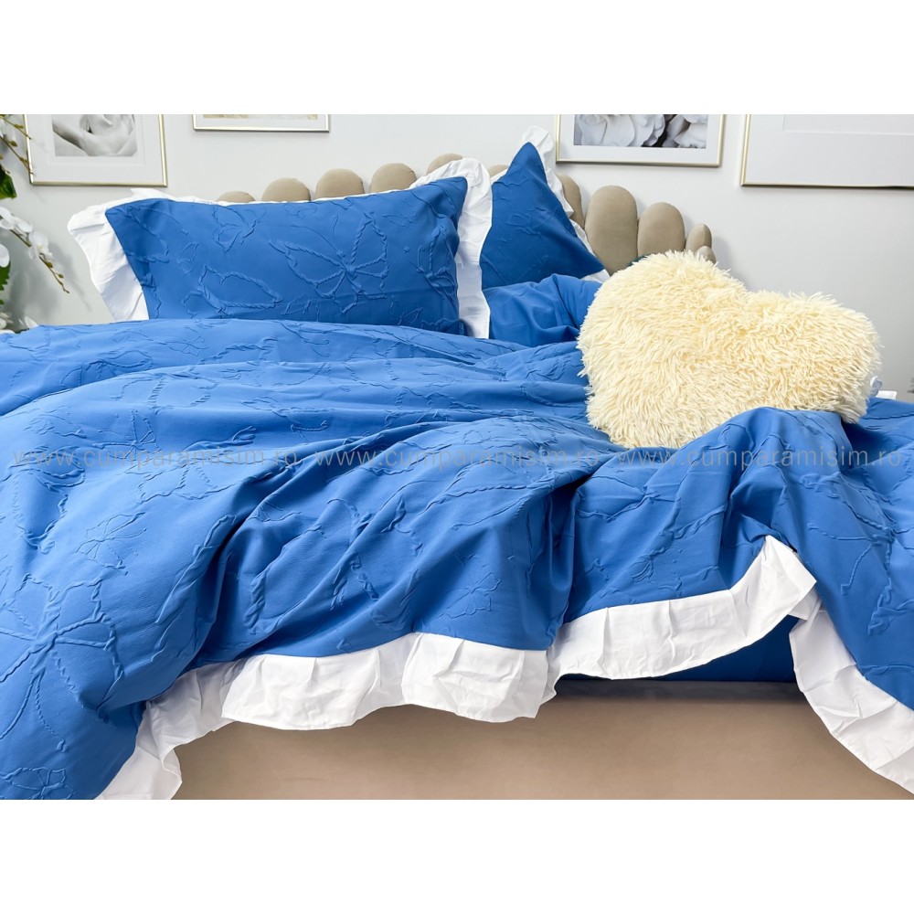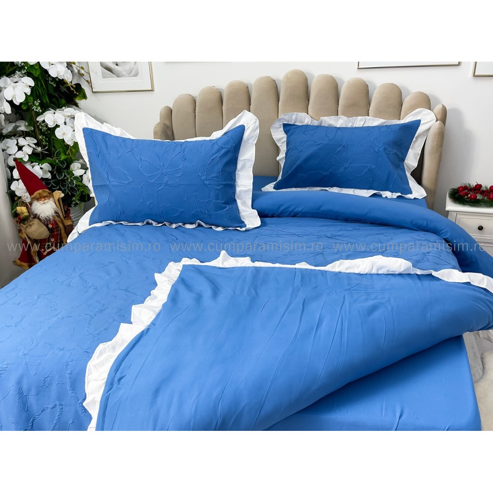 Lenjerie pat dublu, FINET, cu Broderie si Volanase, 4 piese, cu Elastic, albastru, Primavara Casa, cod produs: PRC3