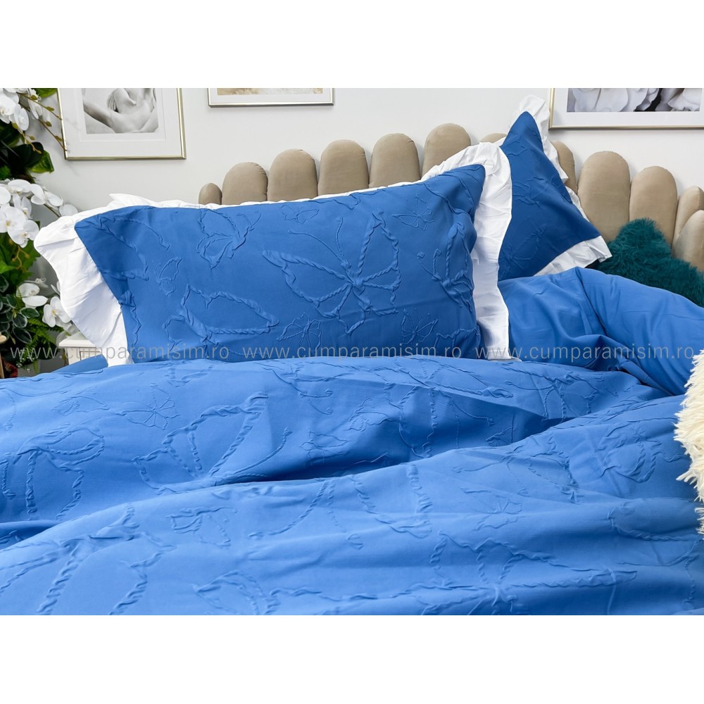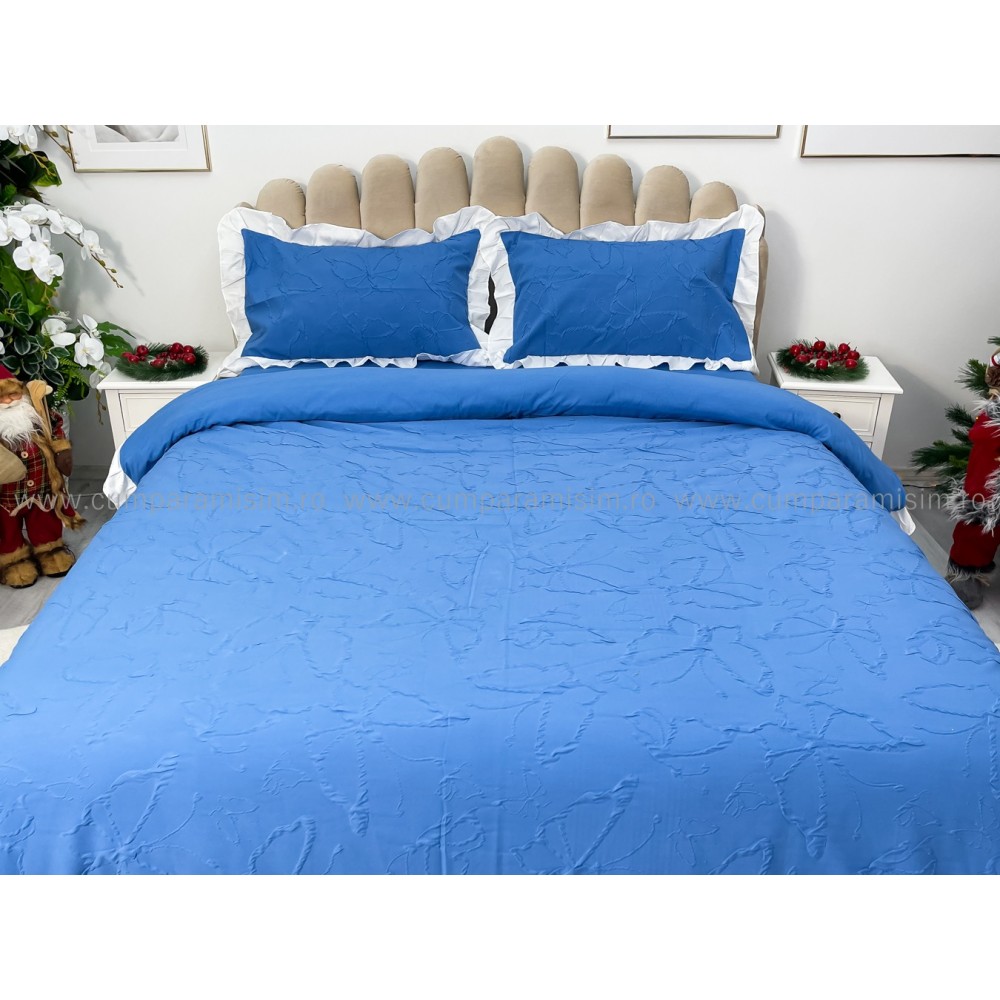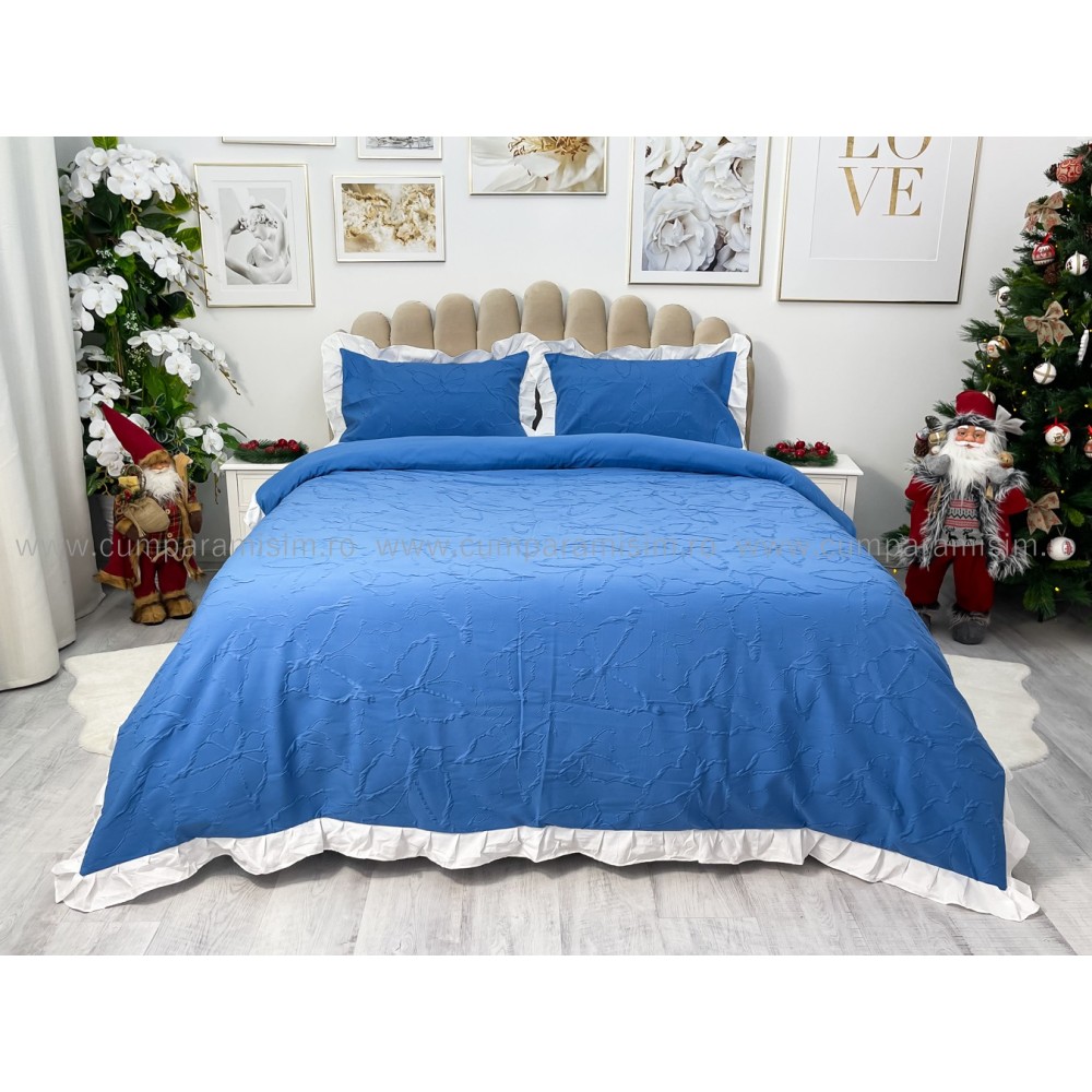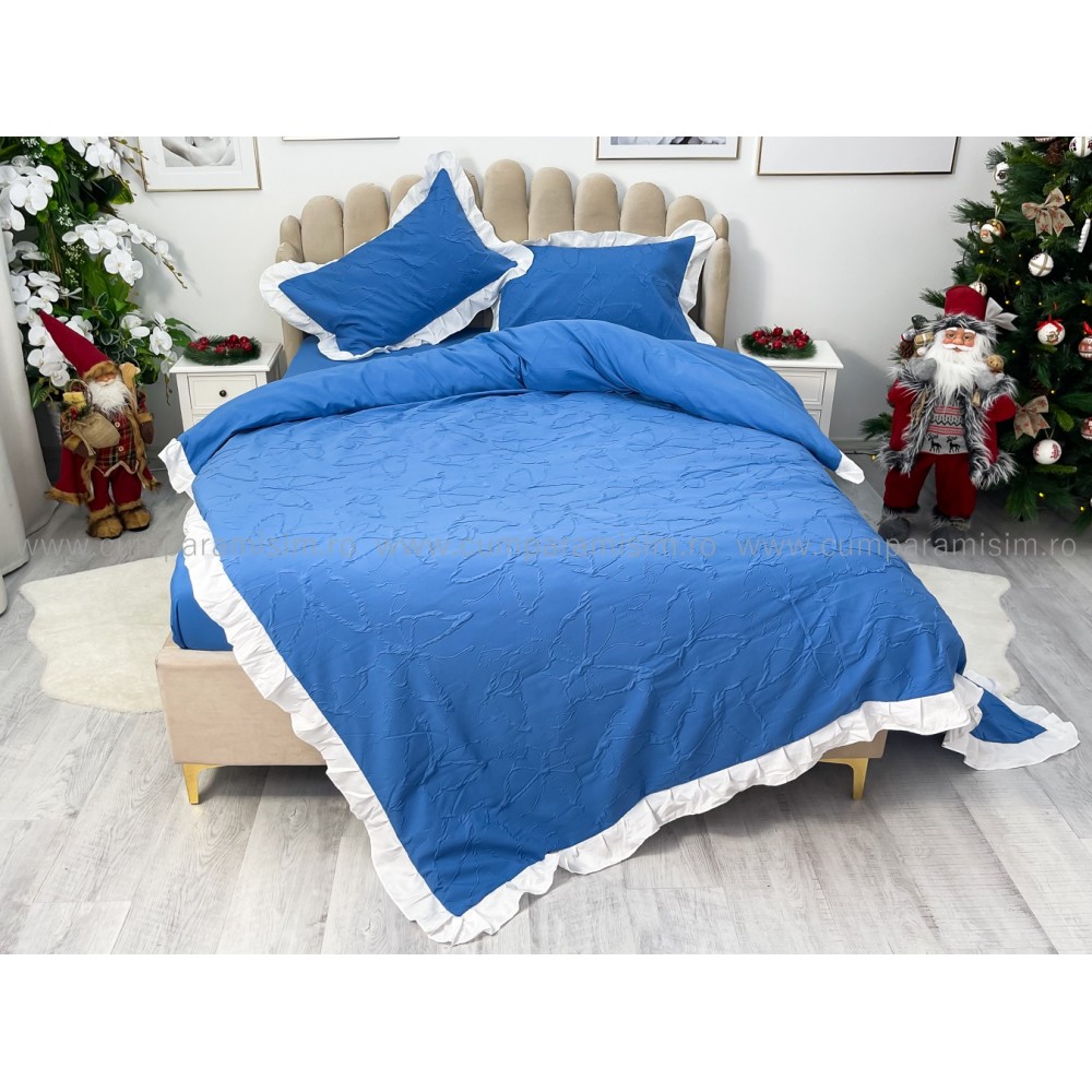 Lenjerie pat dublu, FINET, cu Broderie si Volanase, 4 piese, cu Elastic, albastru, Primavara Casa, cod produs: PRC3