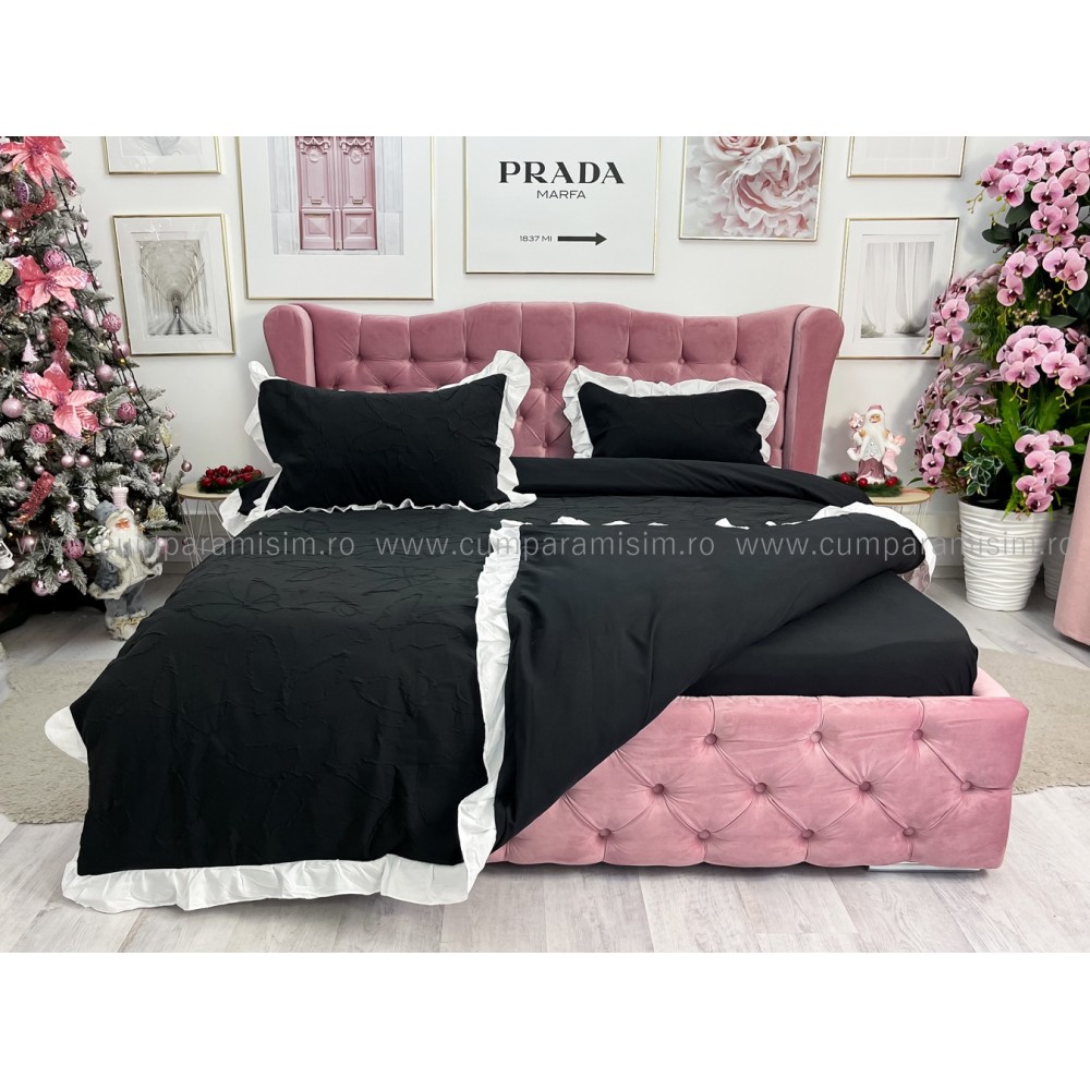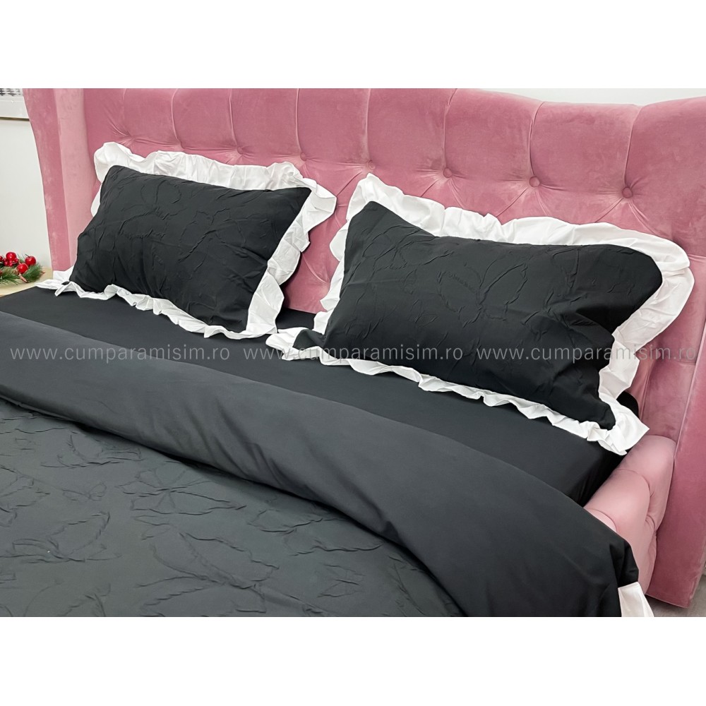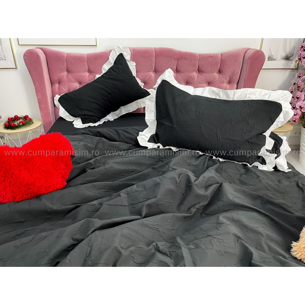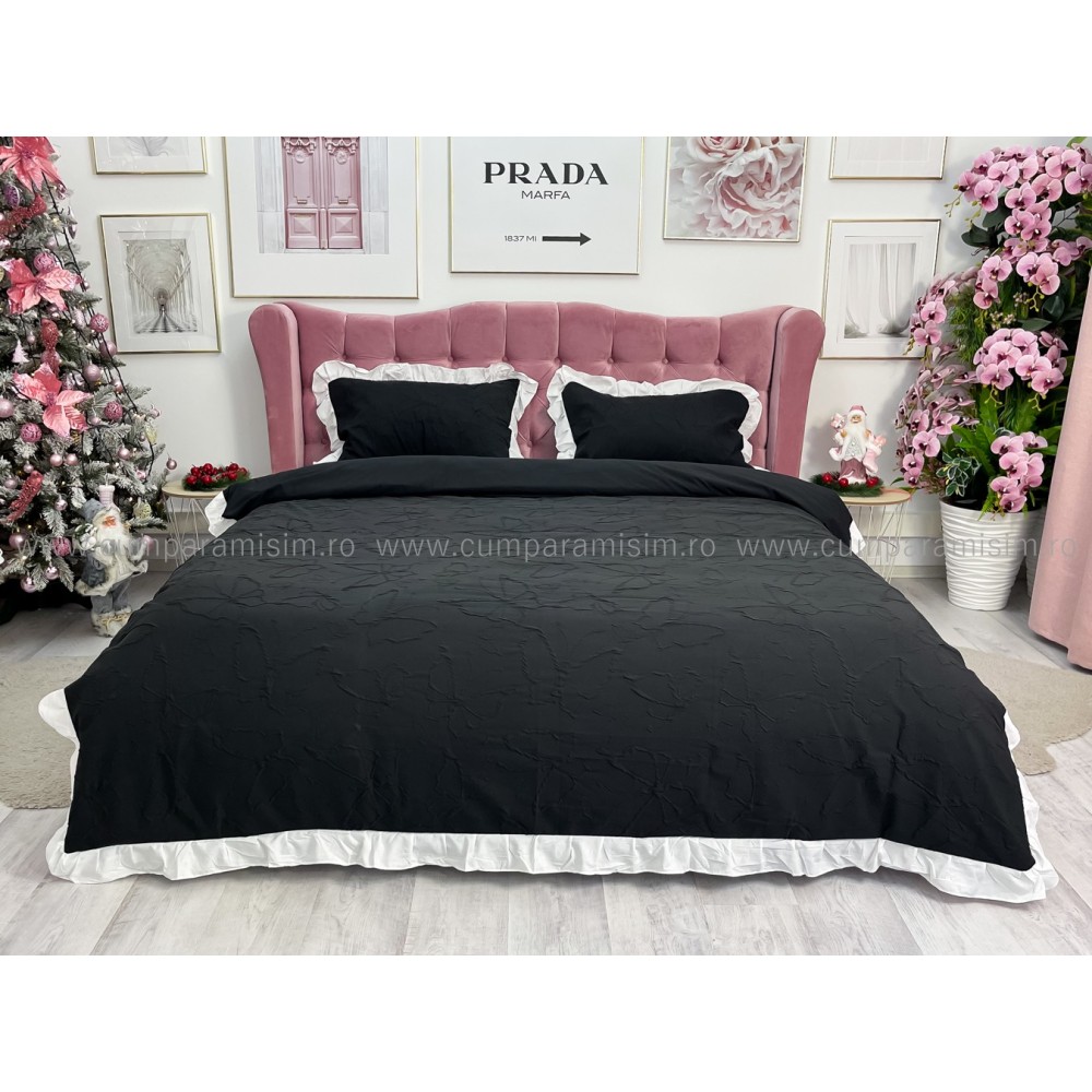Lenjerie pat dublu, FINET, cu Broderie si Volanase, 4 piese, cu Elastic, negru, Primavara Casa, cod produs: PRC8