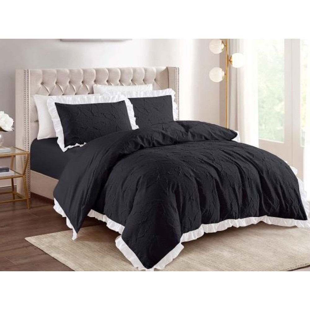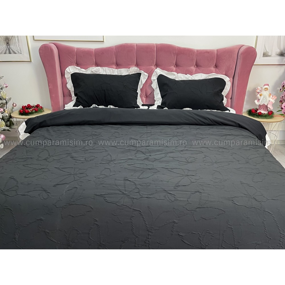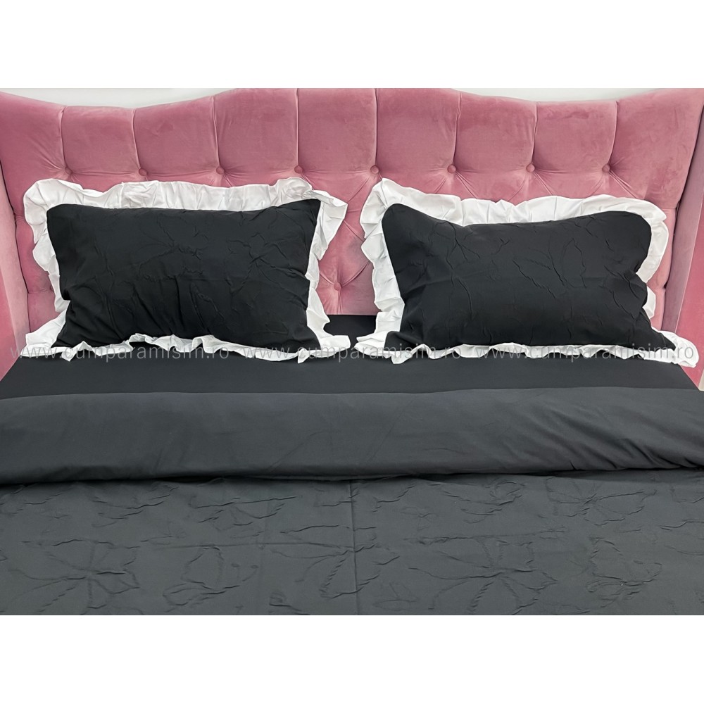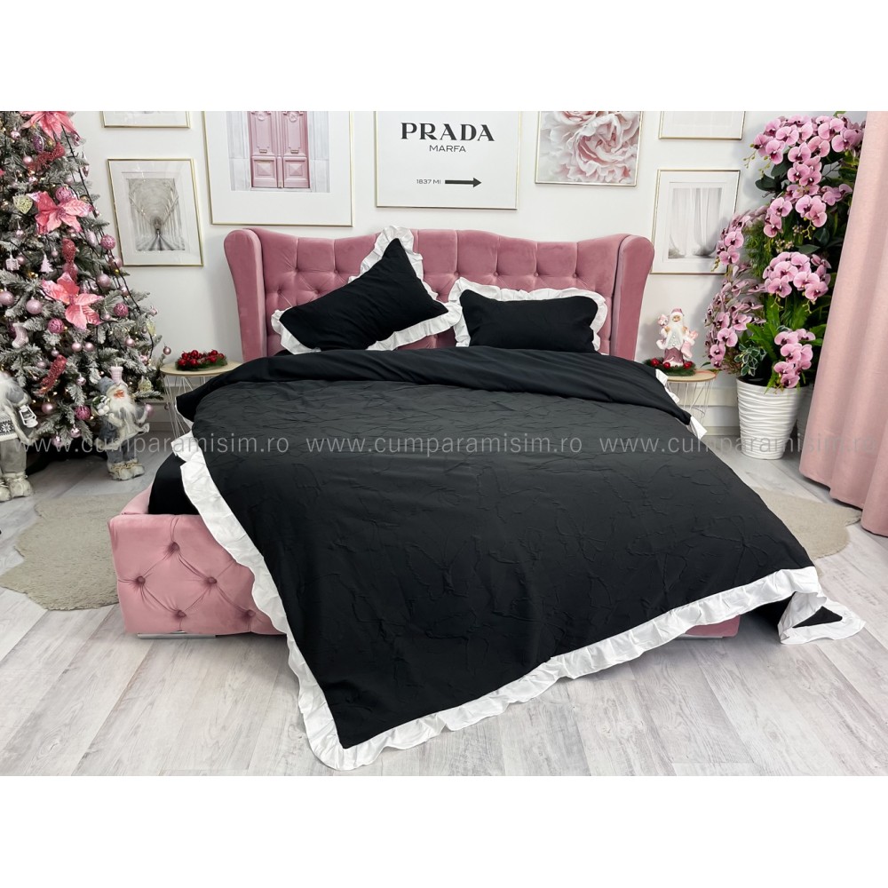 Lenjerie pat dublu, FINET, cu Broderie si Volanase, 4 piese, cu Elastic, negru, Primavara Casa, cod produs: PRC8