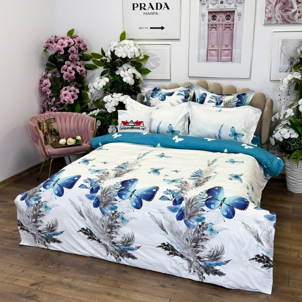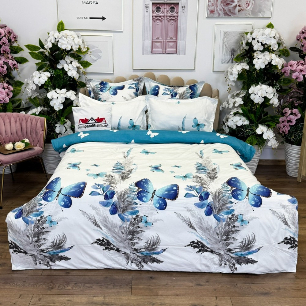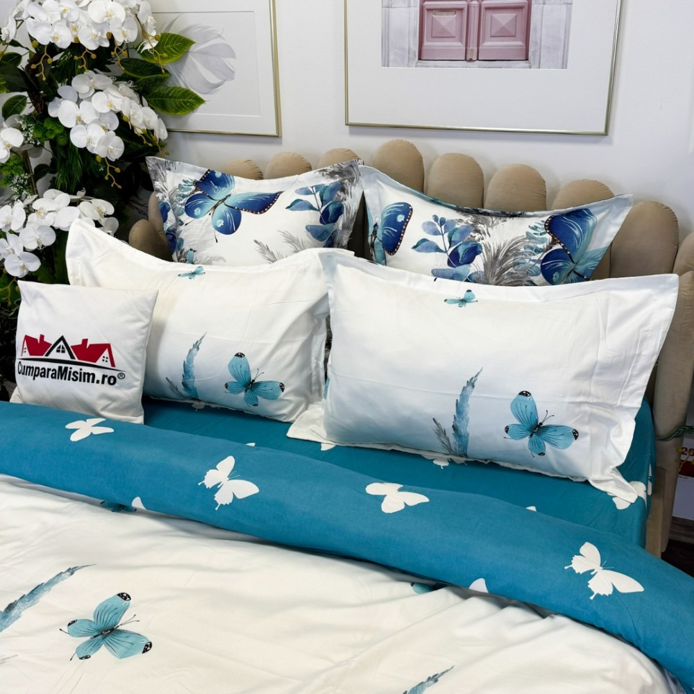 Lenjerie pat dublu, FINET, cu elastic, 6 piese, Alb, Albastru, Fluturi, Primavara Casa, cod produs: PRM-FE-B928