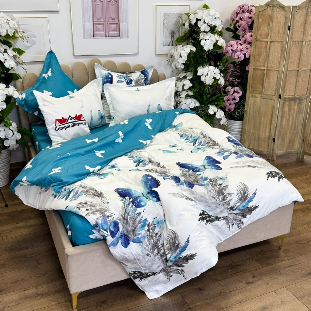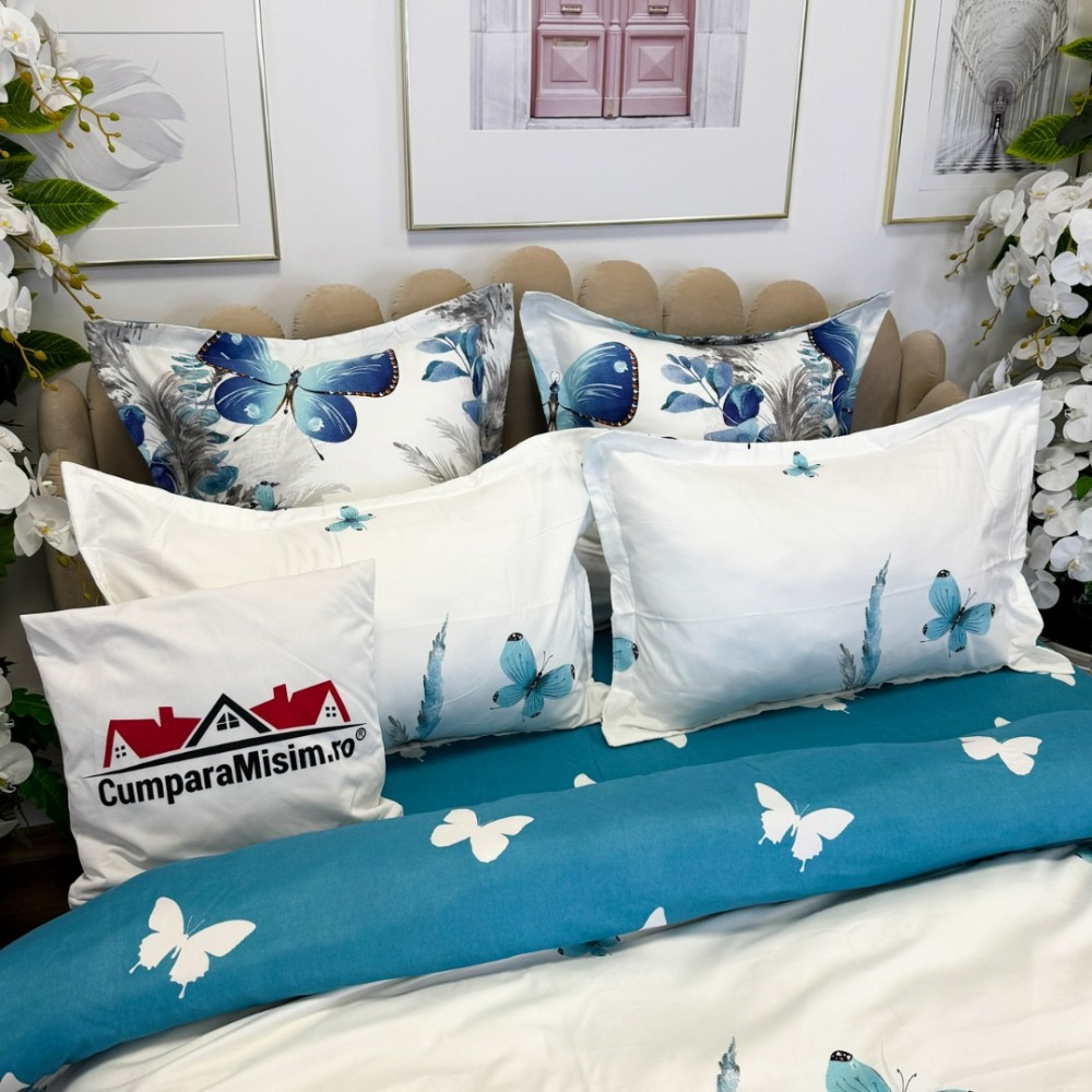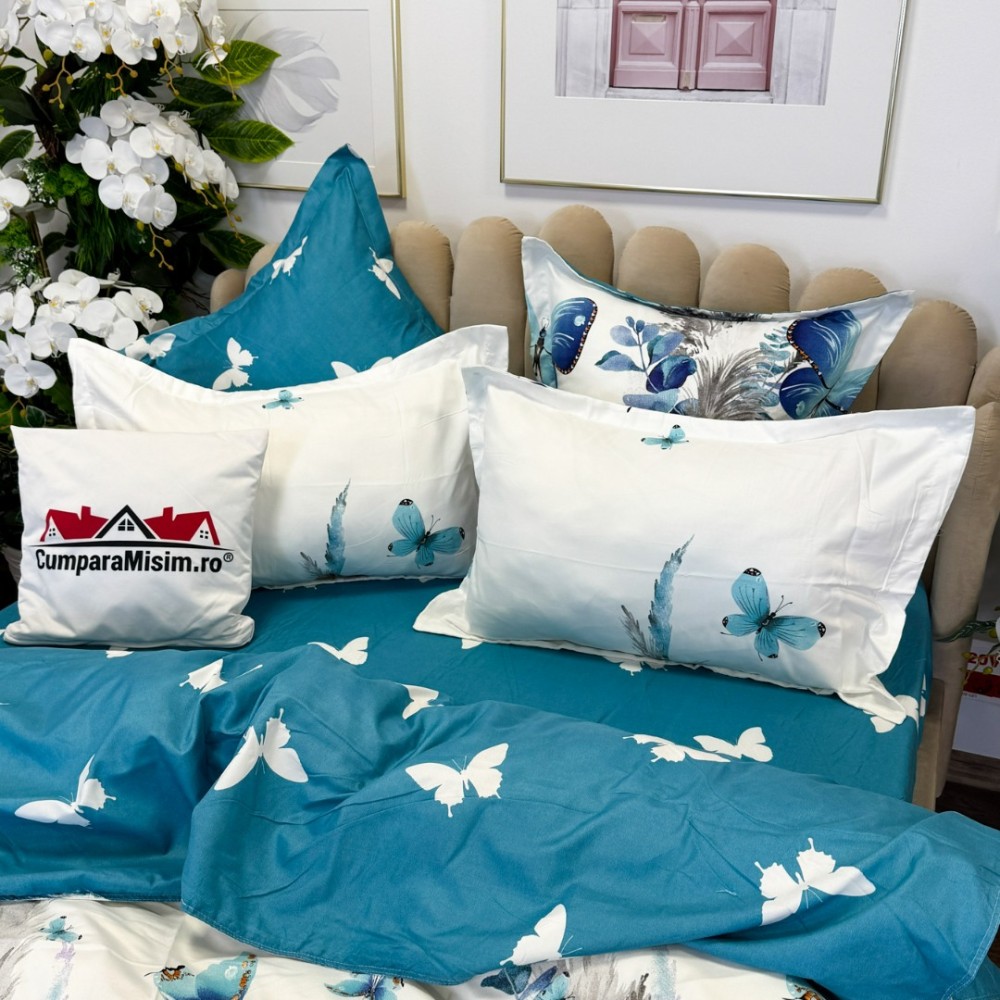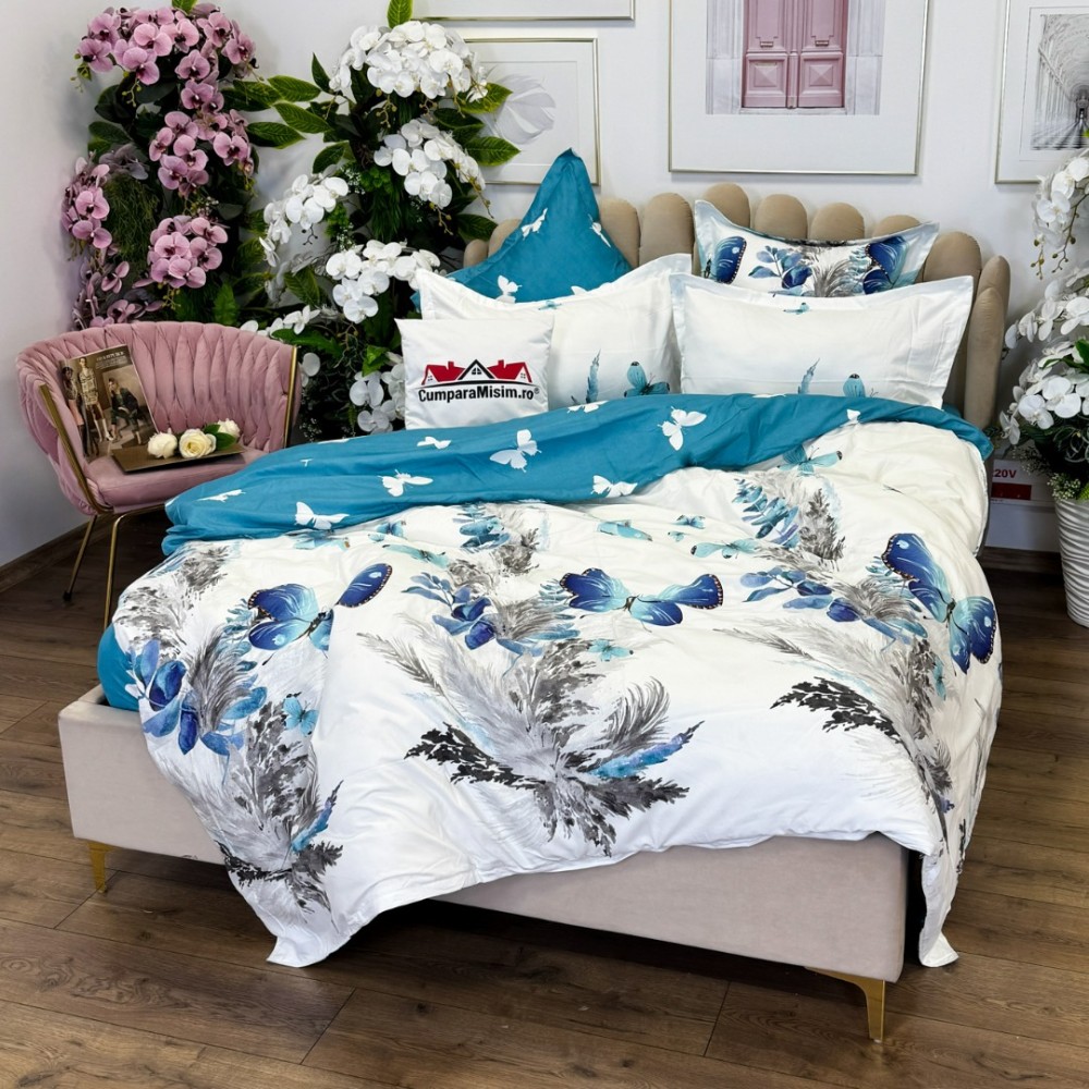 Lenjerie pat dublu, FINET, cu elastic, 6 piese, Alb, Albastru, Fluturi, Primavara Casa, cod produs: PRM-FE-B928