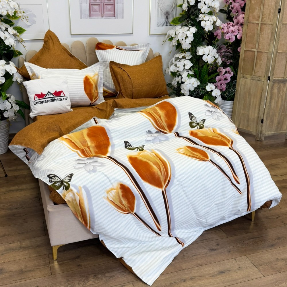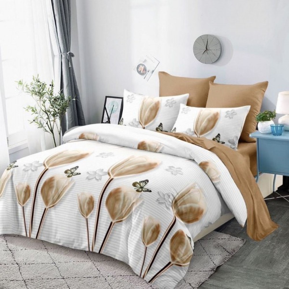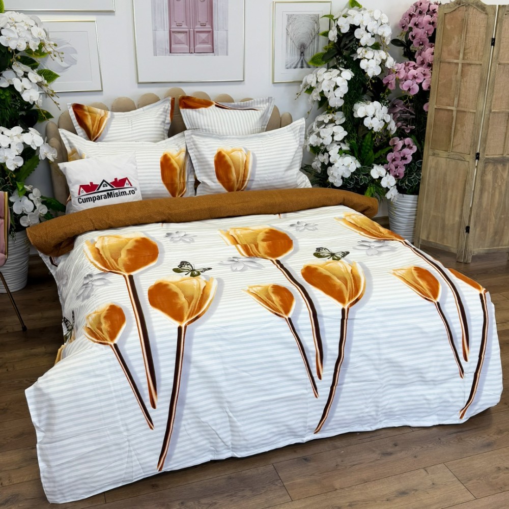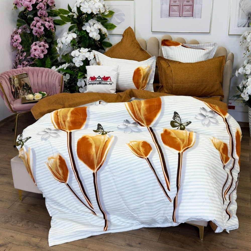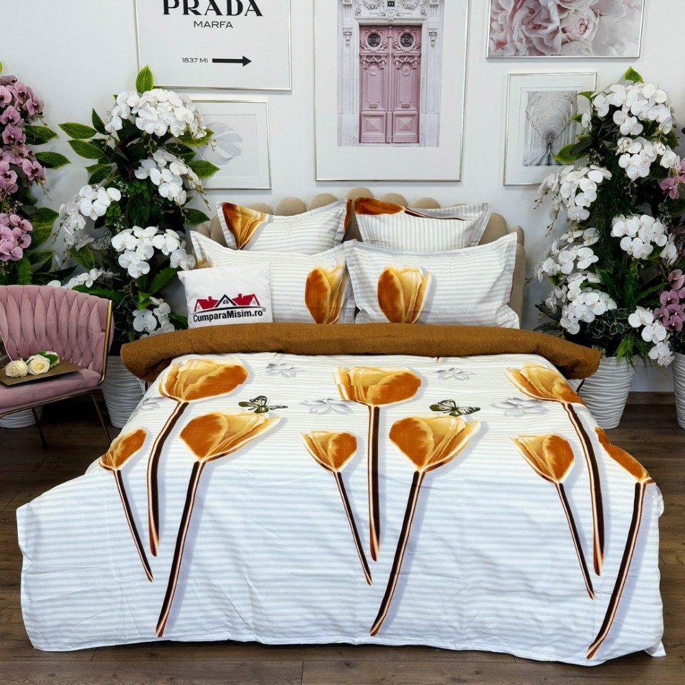 Lenjerie pat dublu, FINET, cu elastic, 6 piese, Alb, Bej, Lalele, Fluturi, Primavara Casa, cod produs: PRM-FE-B961