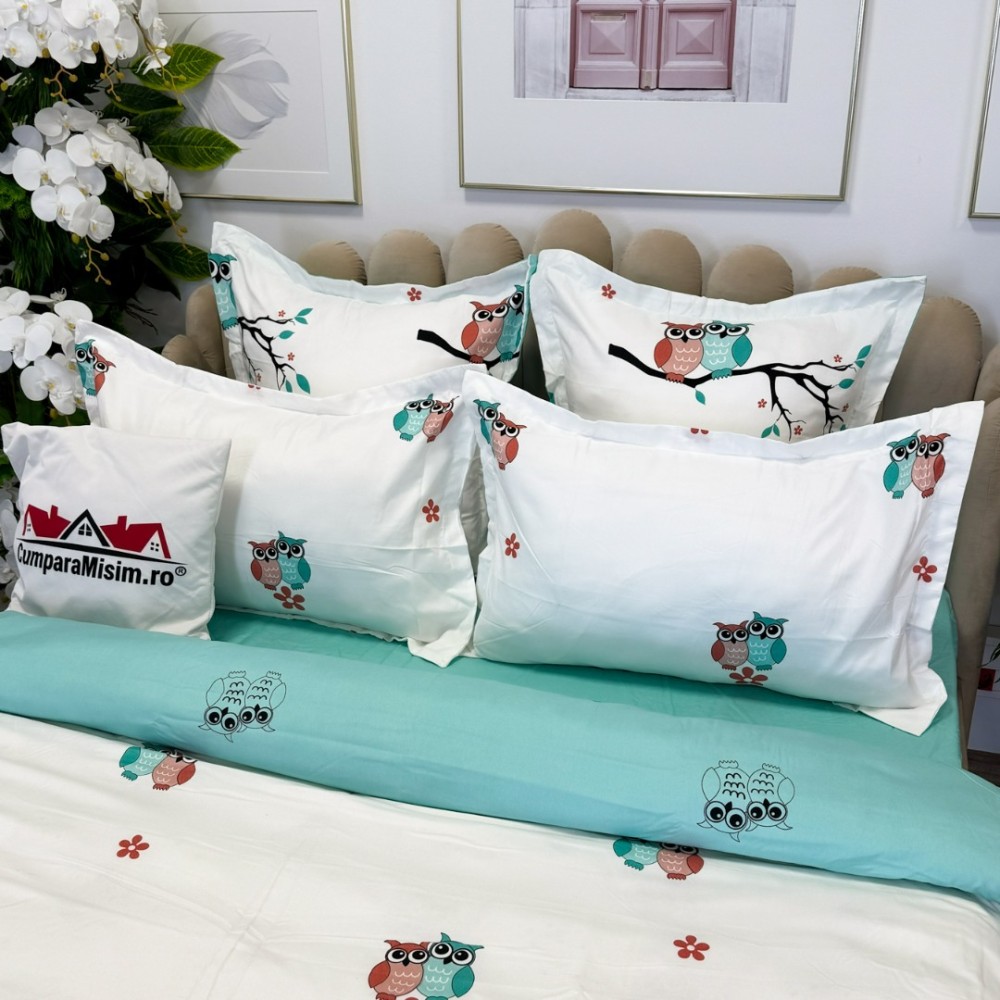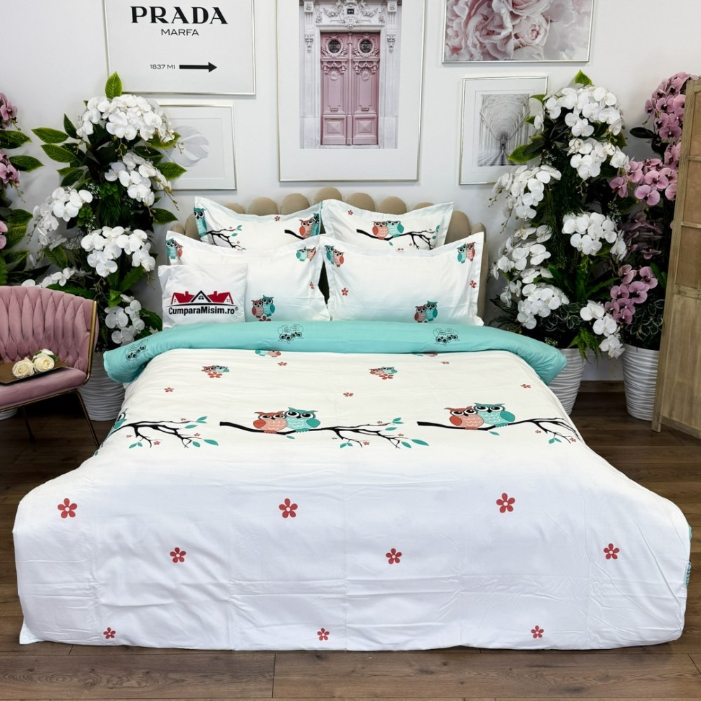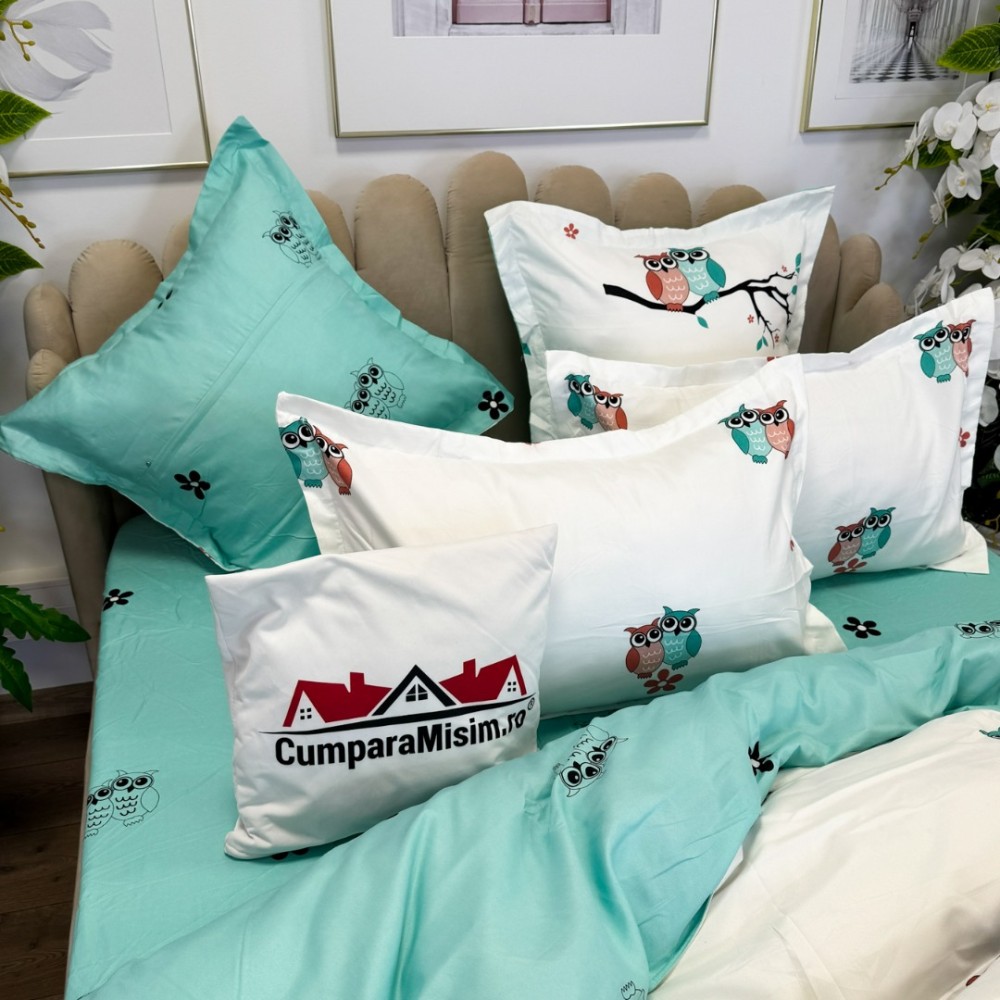 Lenjerie pat dublu, FINET, cu elastic, 6 piese, Alb, Bleu, Bufnite, Primavara Casa, cod produs: PRM-FE-B869