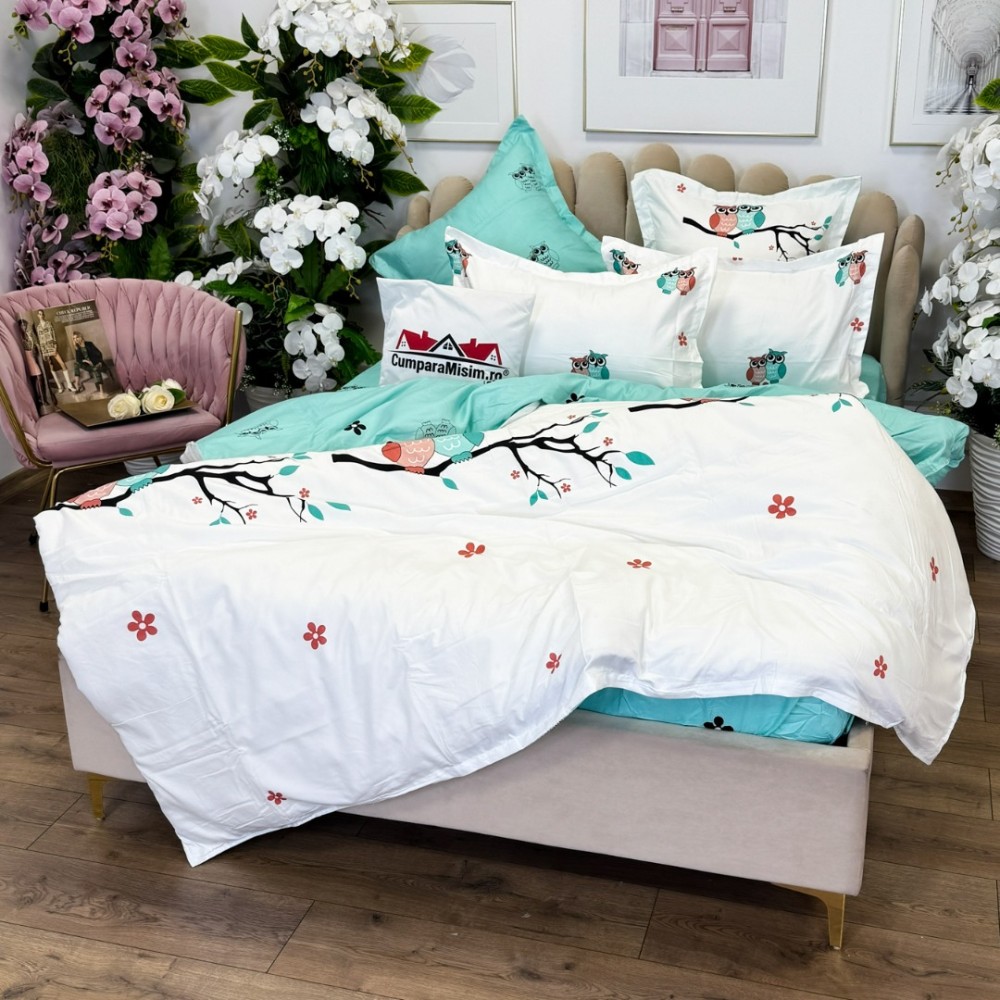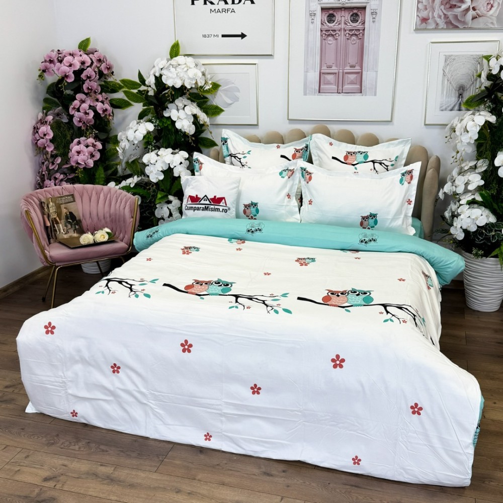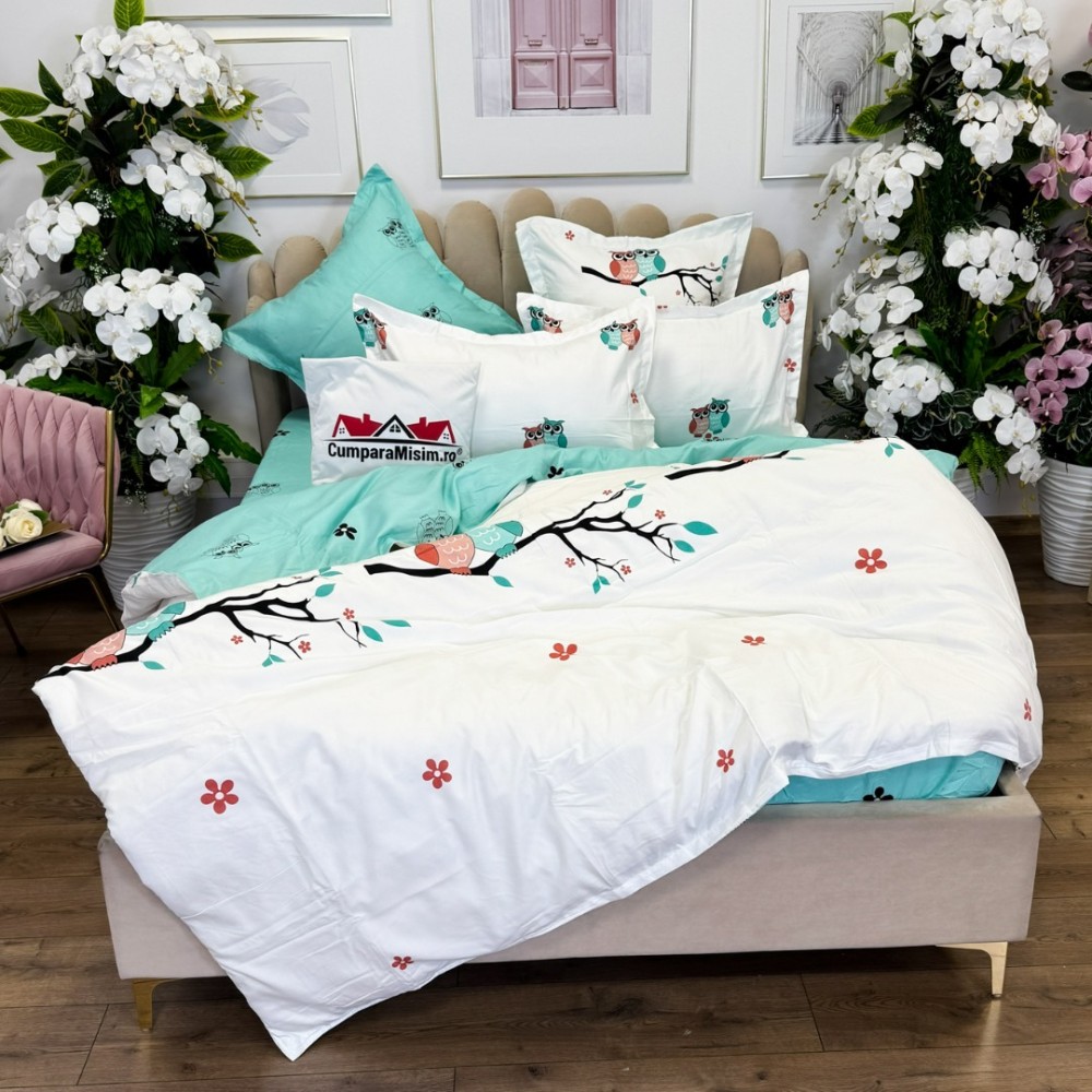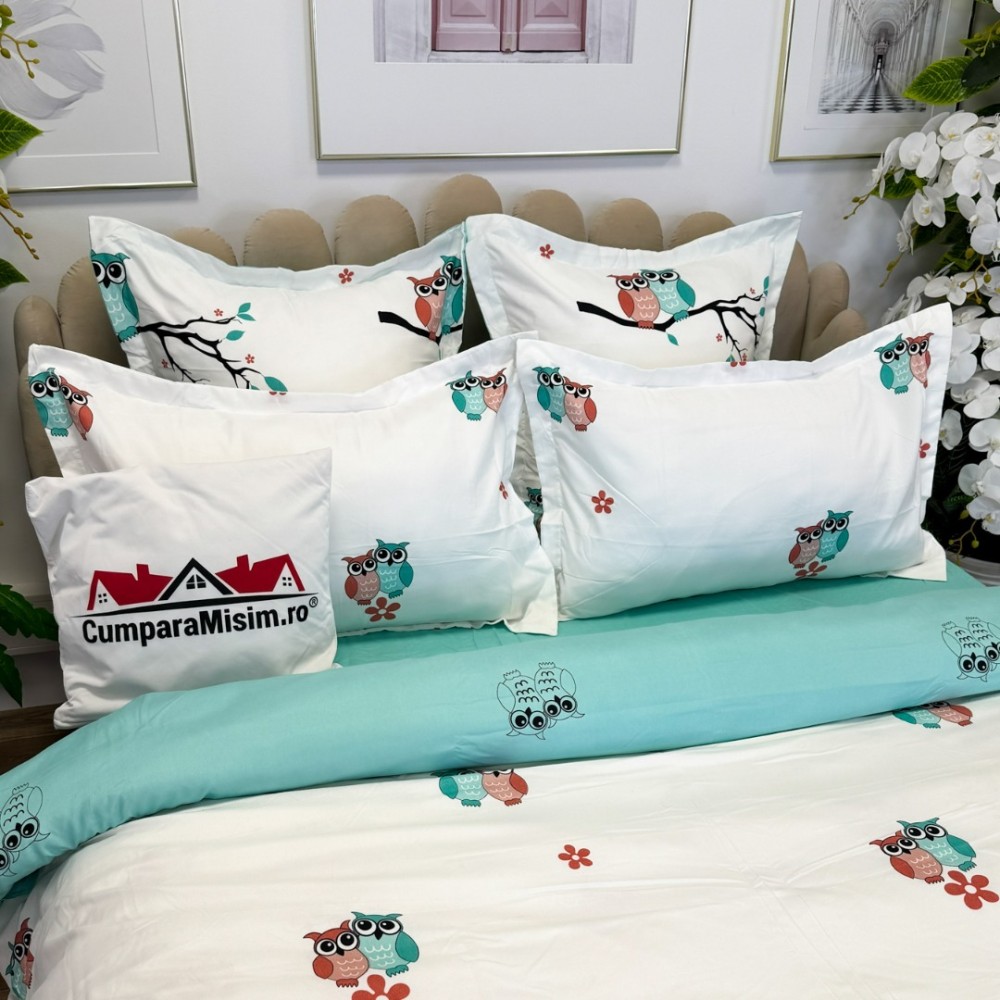 Lenjerie pat dublu, FINET, cu elastic, 6 piese, Alb, Bleu, Bufnite, Primavara Casa, cod produs: PRM-FE-B869