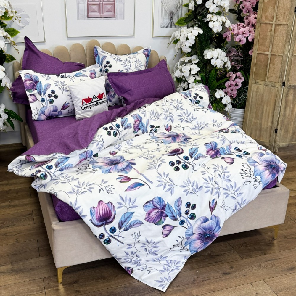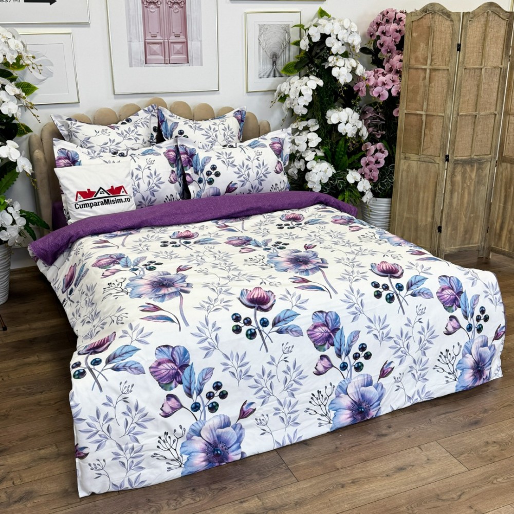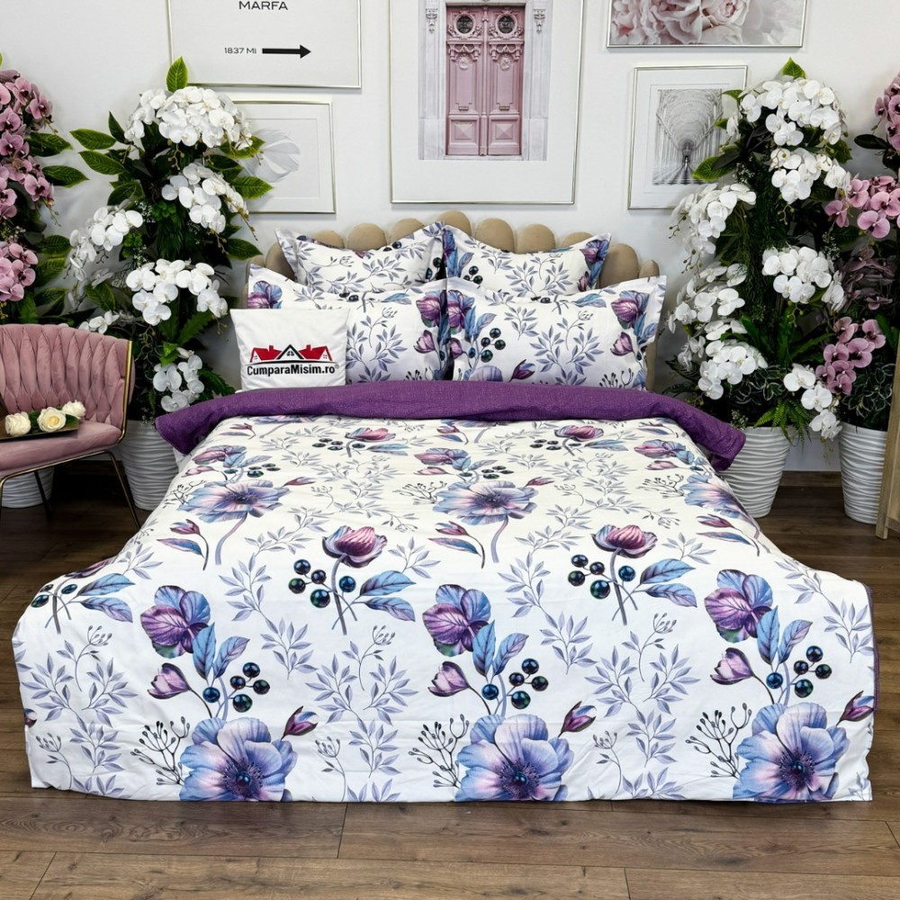 Lenjerie pat dublu, FINET, cu elastic, 6 piese, Alb, Lila, Flori, Primavara Casa, cod produs: PRM-FE-B975