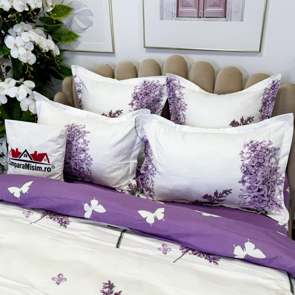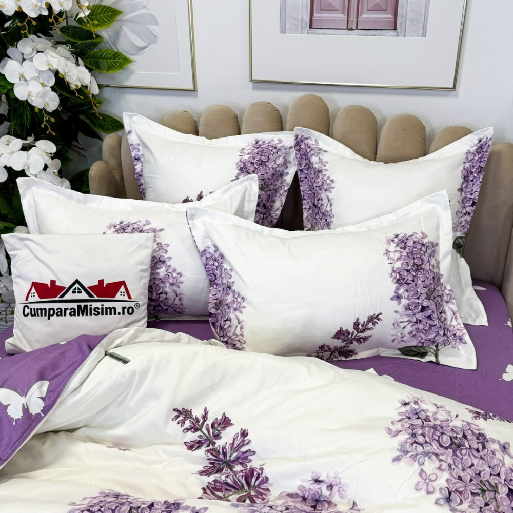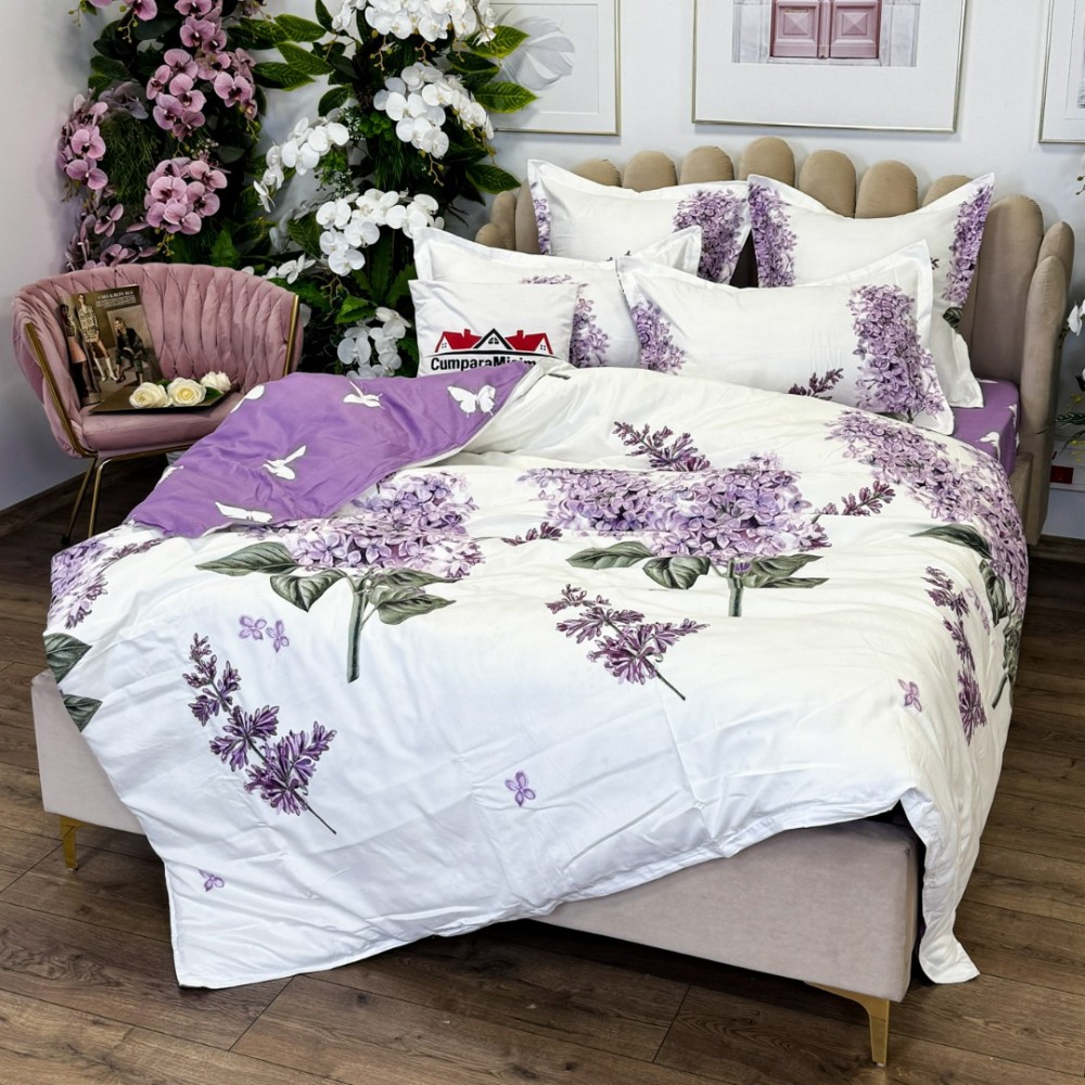 Lenjerie pat dublu, FINET, cu elastic, 6 piese, Alb, Lila, flori de liliac, Primavara Casa, cod produs: PRM-FE-B981