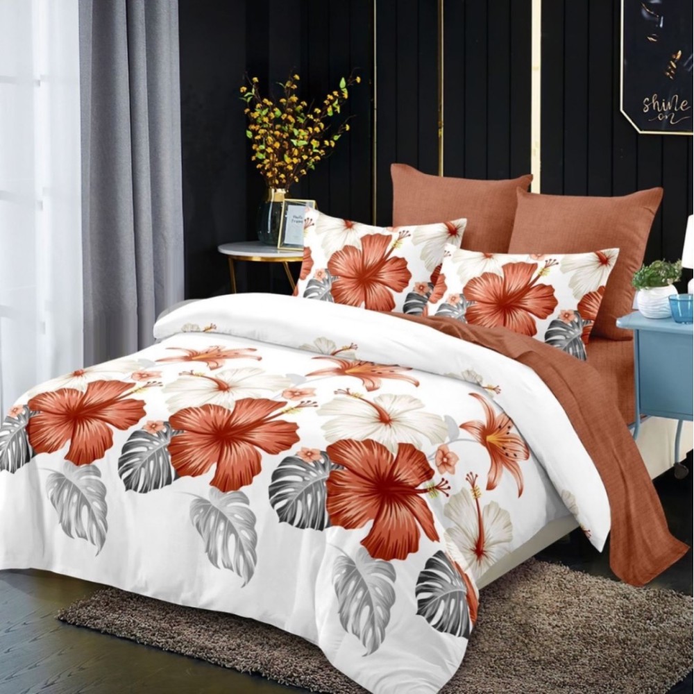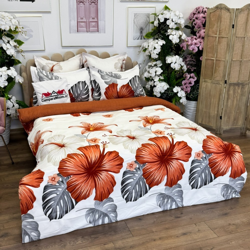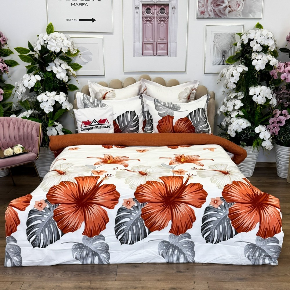 Lenjerie pat dublu, FINET, cu elastic, 6 piese, Alb, Maro, Flori, Primavara Casa, cod produs: PRM-FE-B991