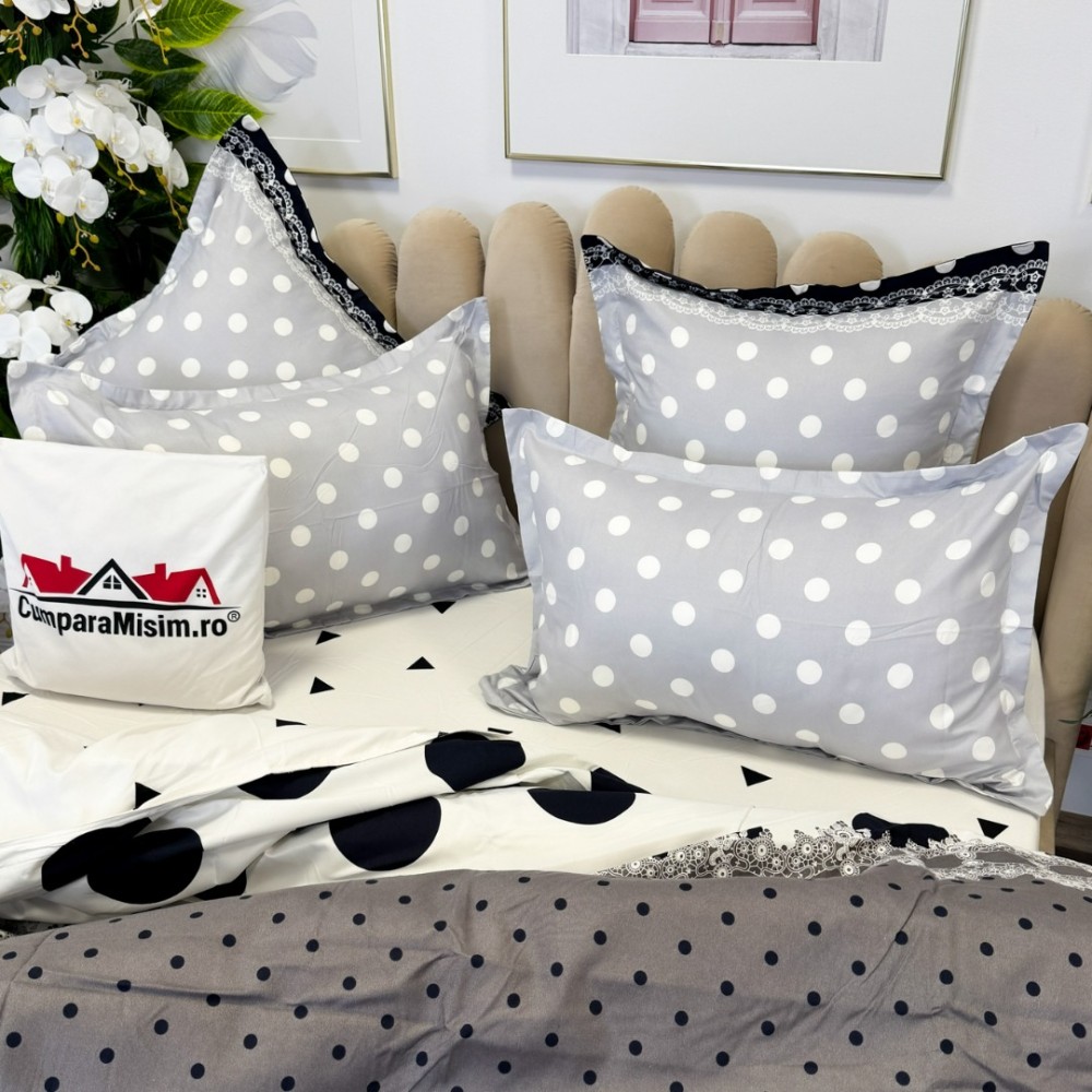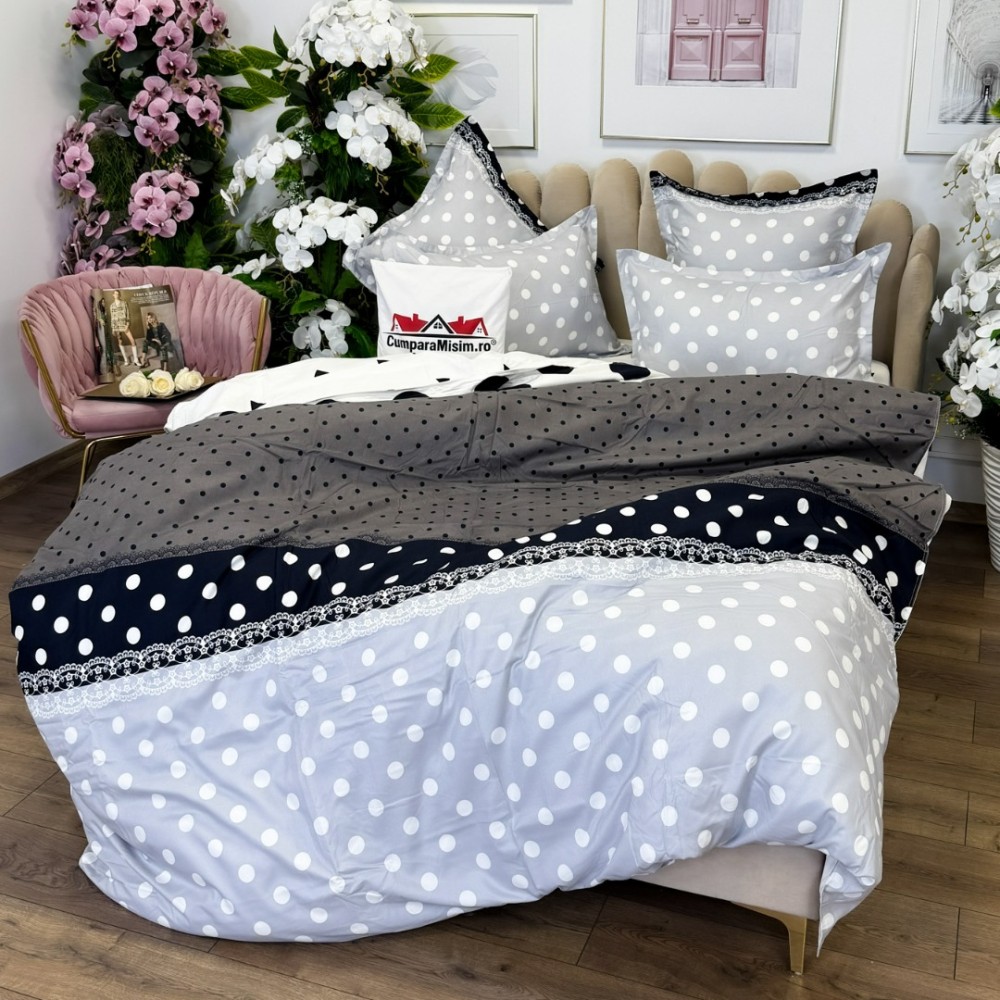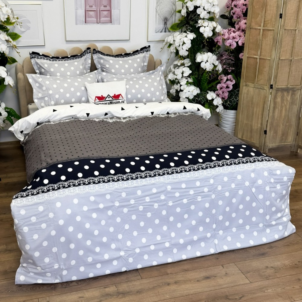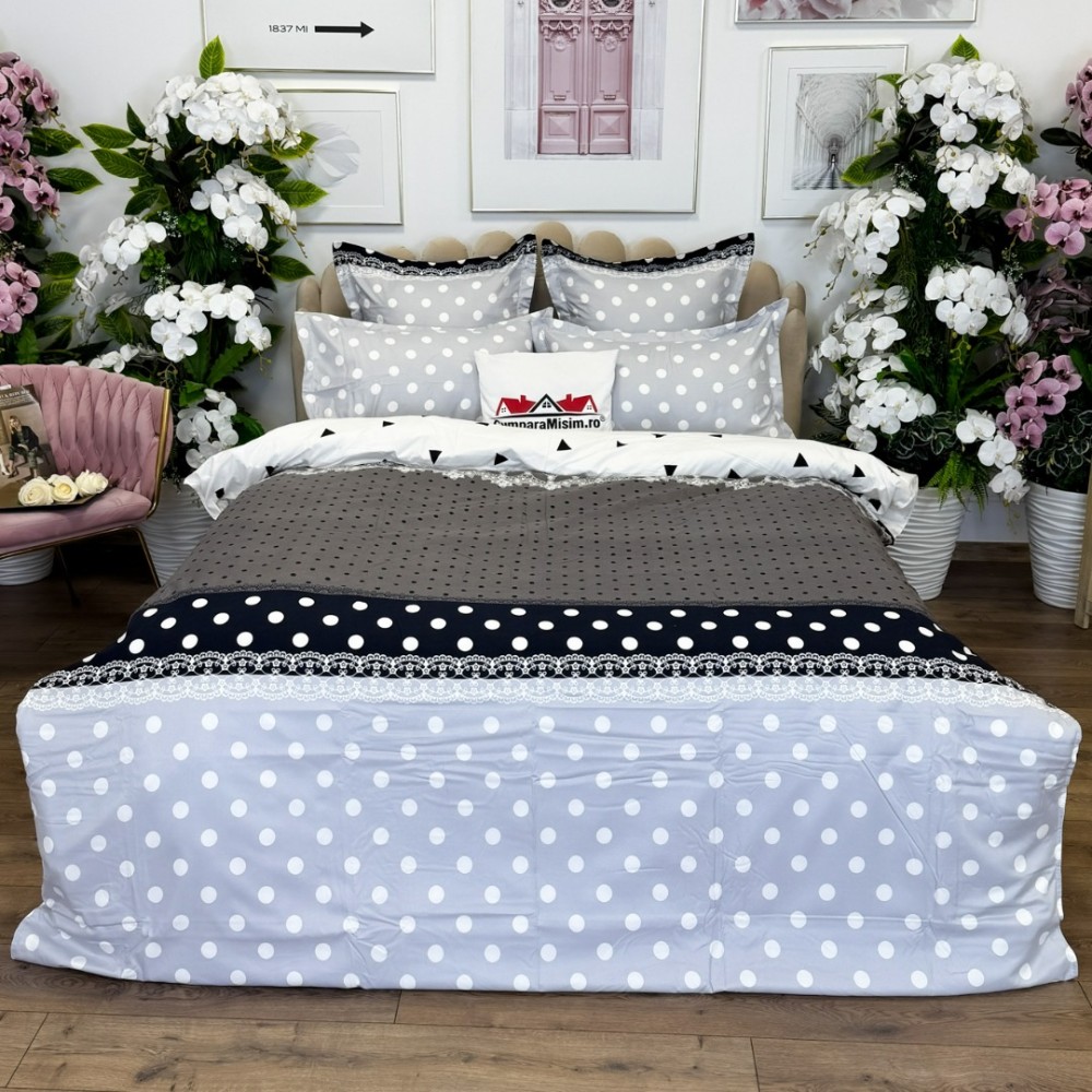 Lenjerie pat dublu, FINET, cu elastic, 6 piese, Alb, Negru, Buline, Primavara Casa, cod produs: PRM-FE-B888