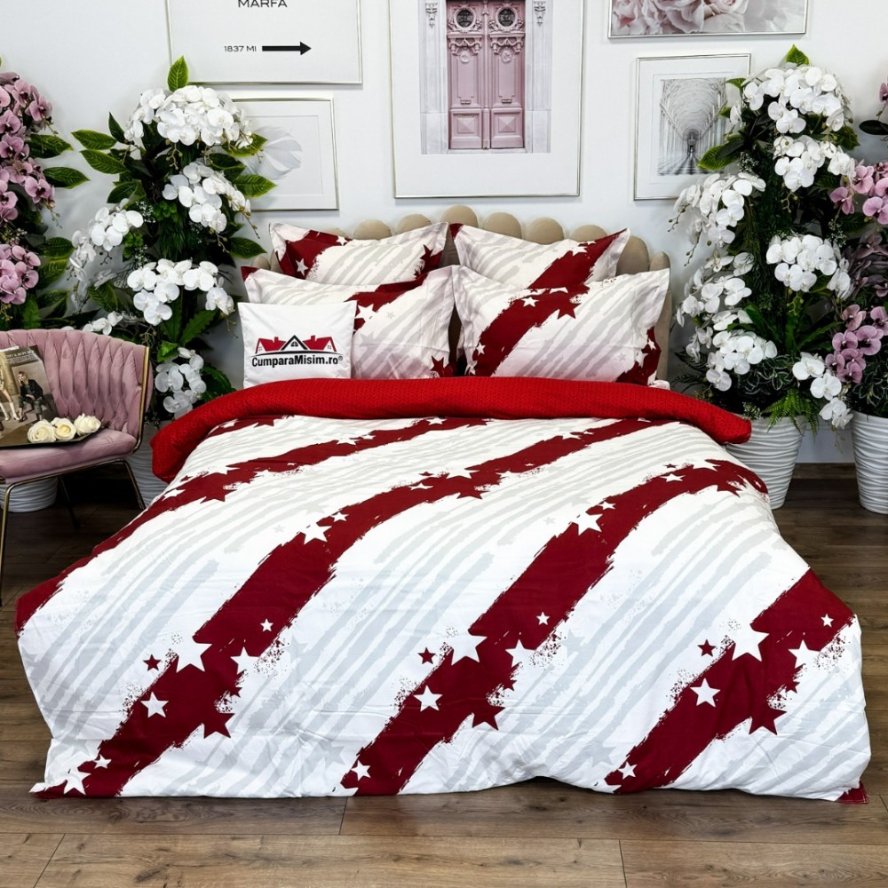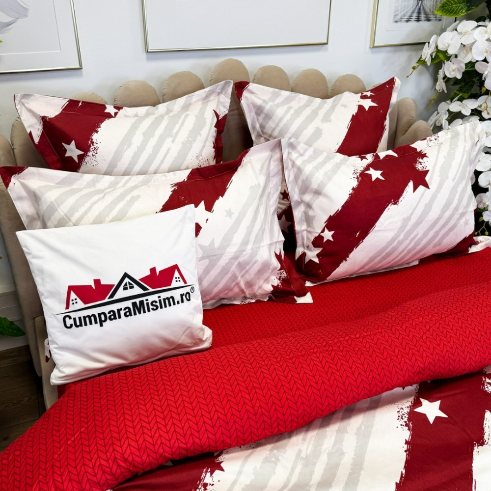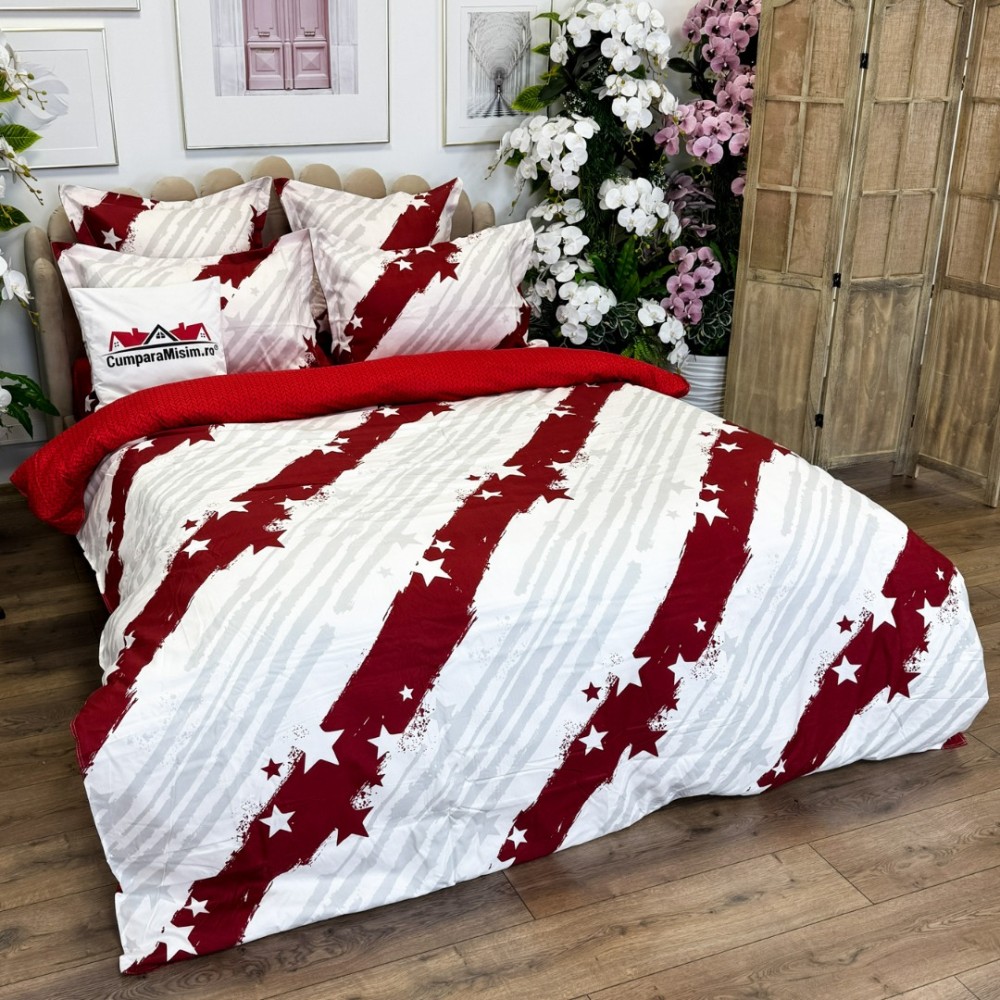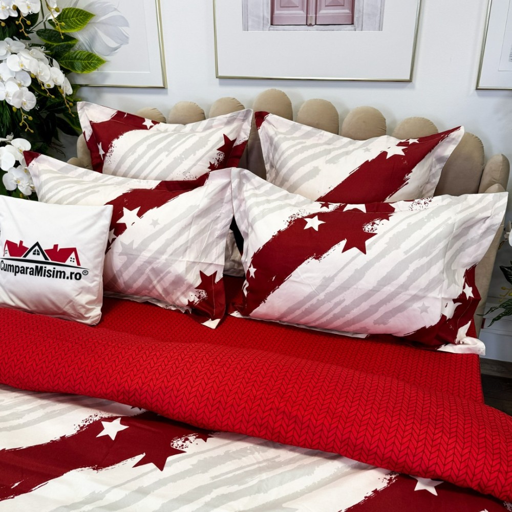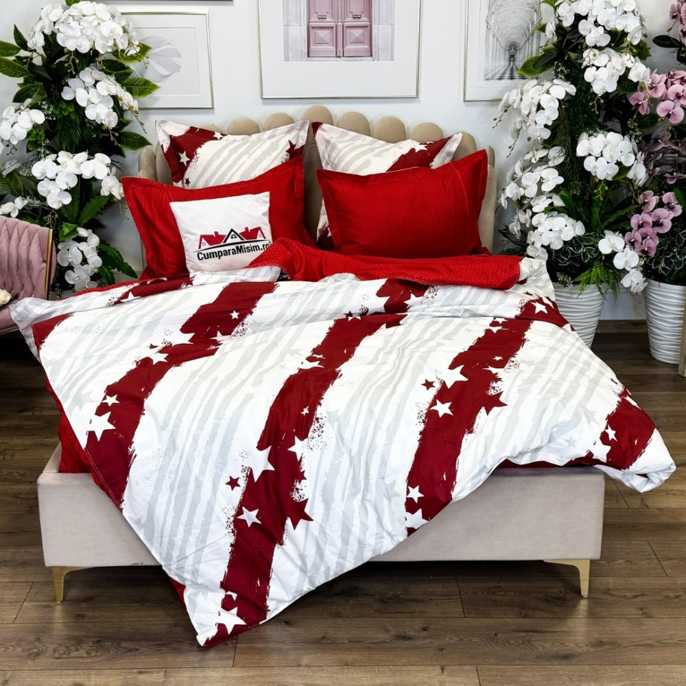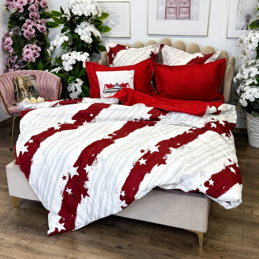 Lenjerie pat dublu, FINET, cu elastic, 6 piese, Alb, Rosu, Stelute, Dungi, Primavara Casa, cod produs: PRM-FE-B978