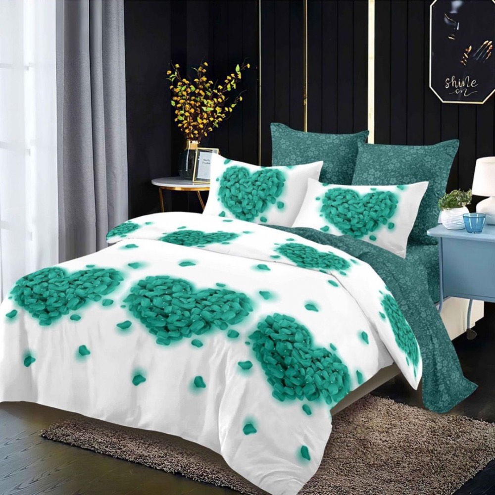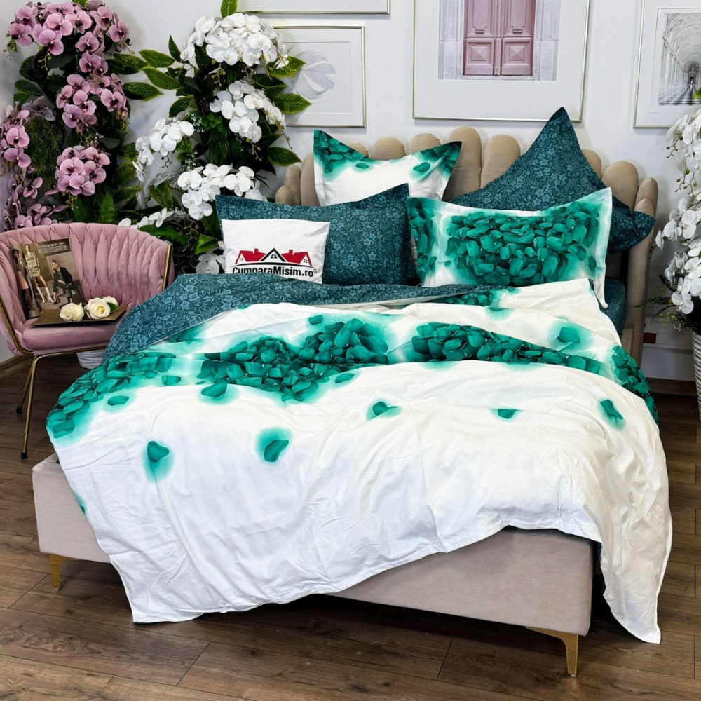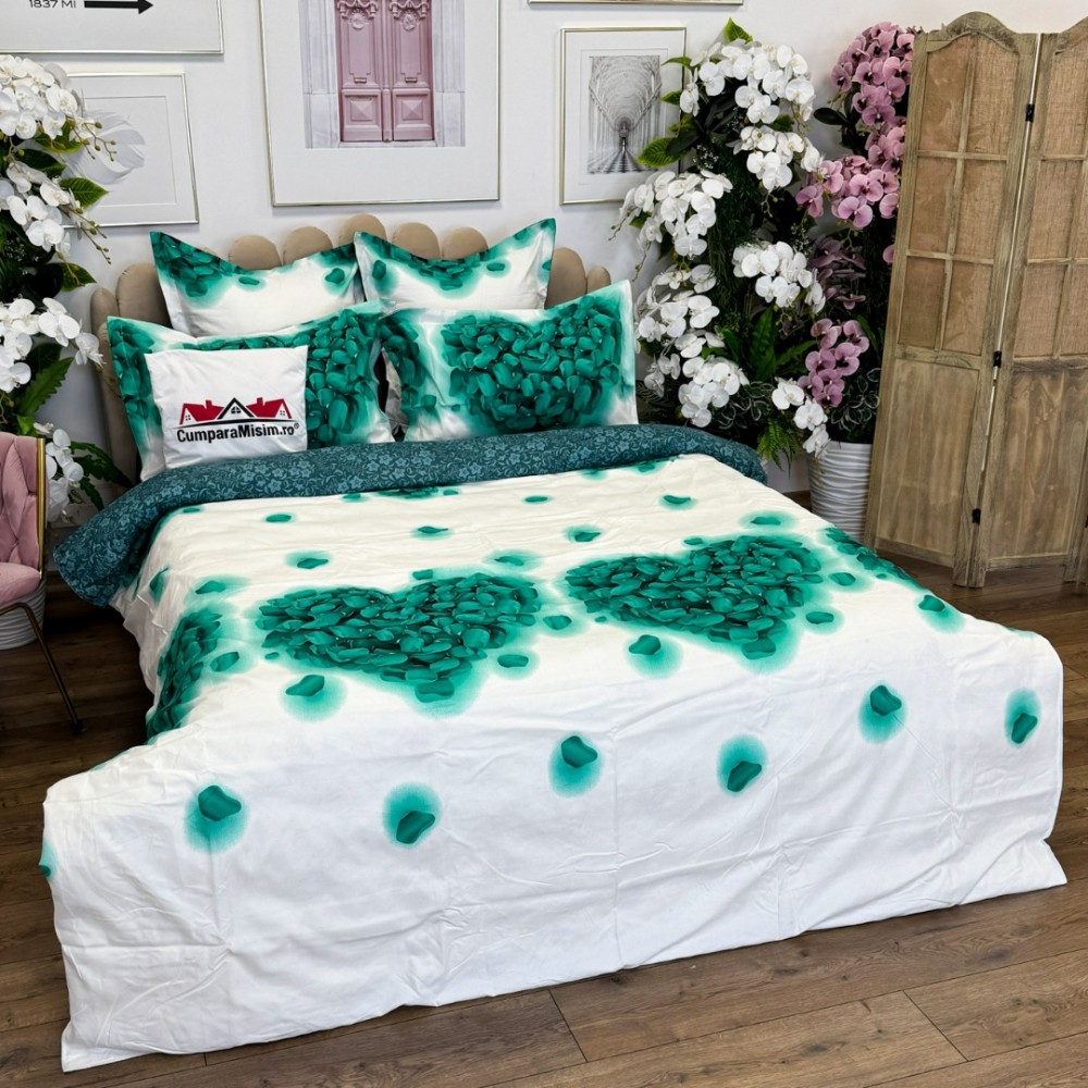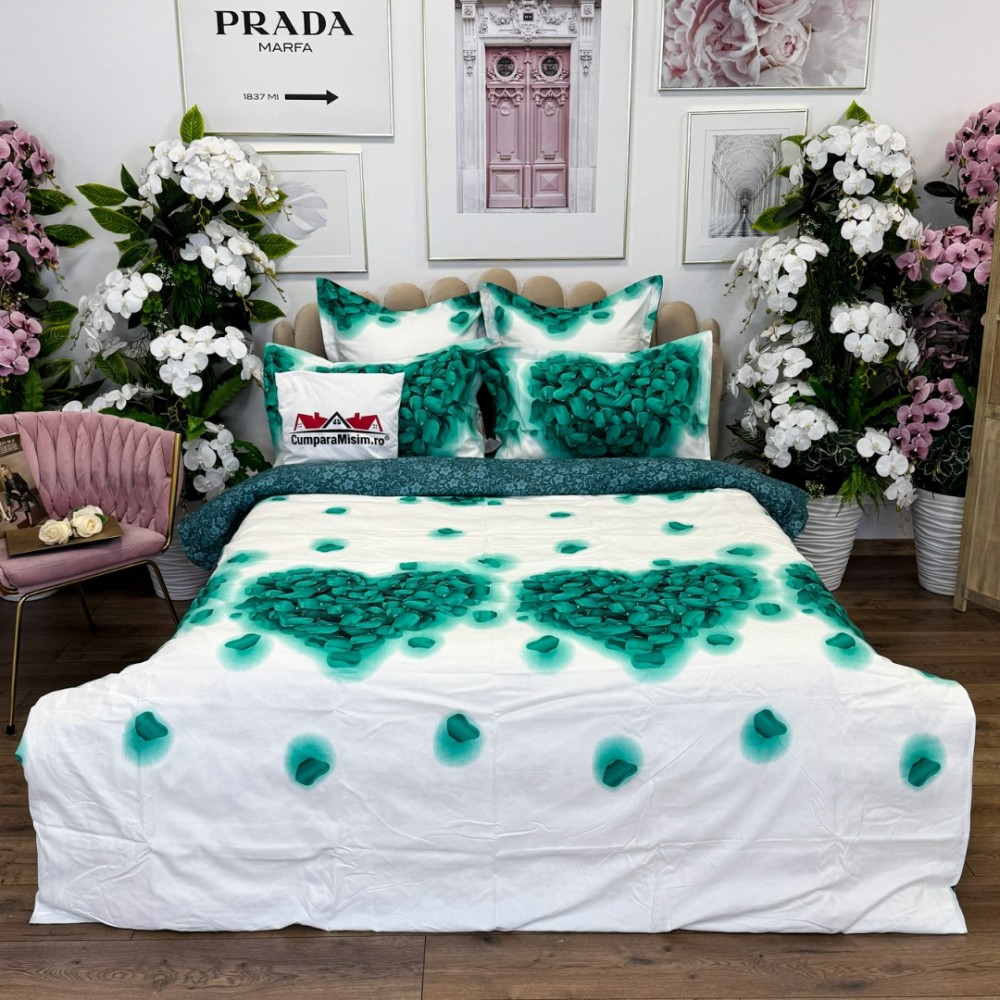 Lenjerie pat dublu, FINET, cu elastic, 6 piese, Alb, Turquoise, Inimioare, Primavara Casa, cod produs: PRM-FE-B976