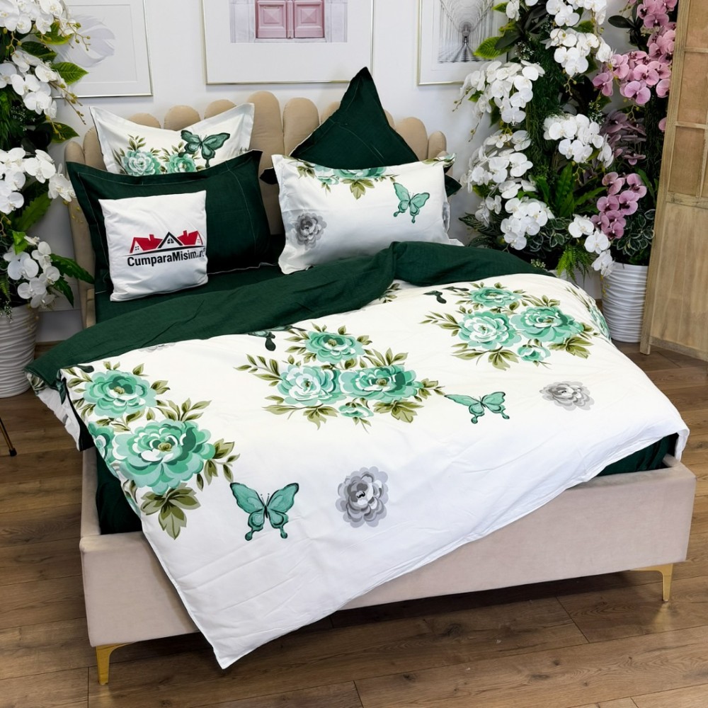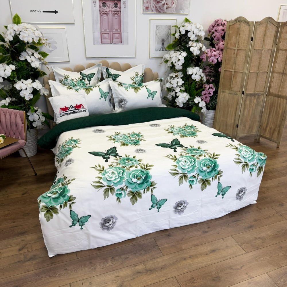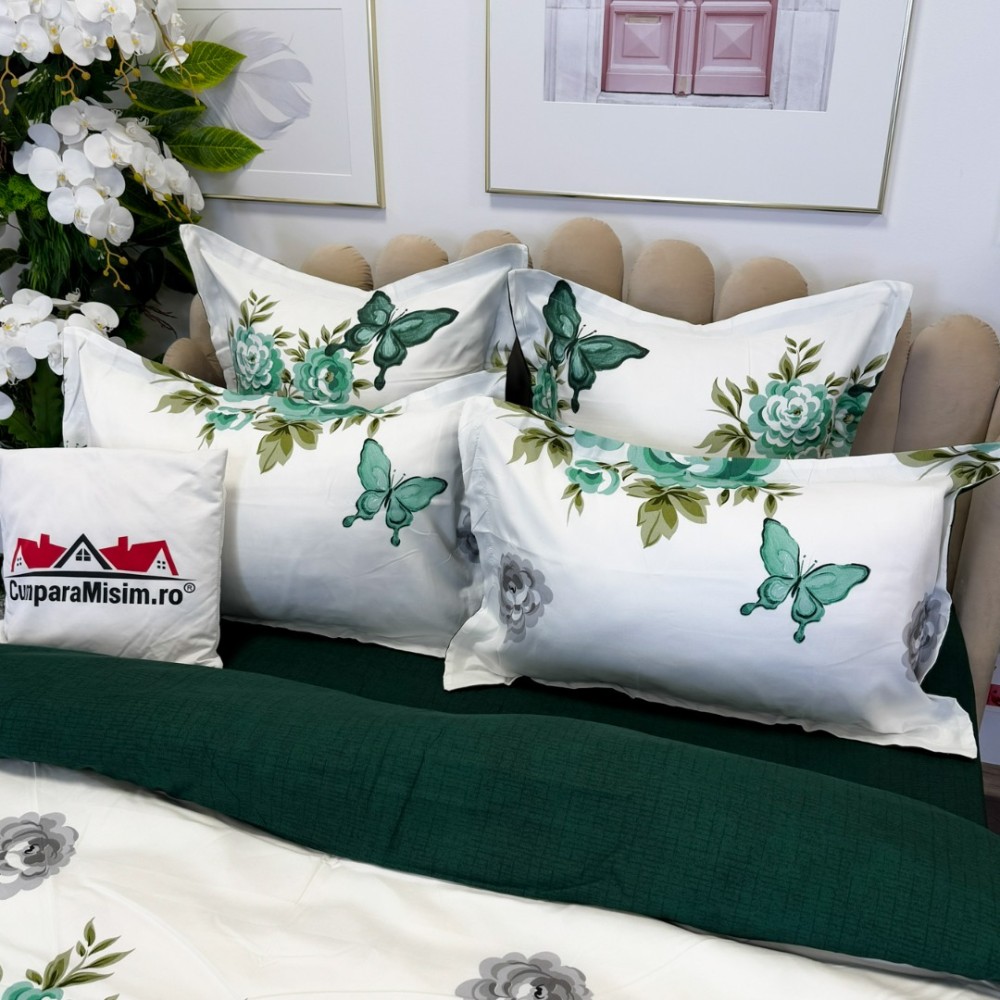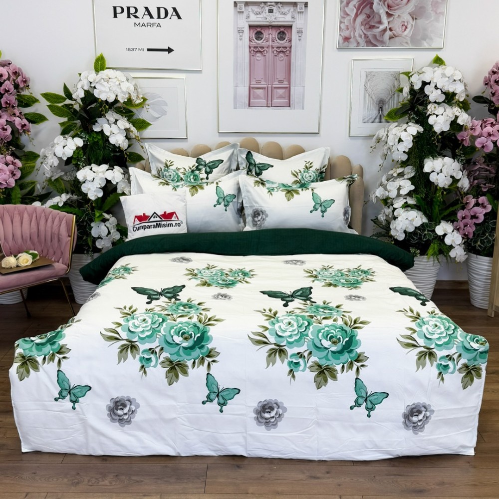 Lenjerie pat dublu, FINET, cu elastic, 6 piese, Alb, Verde, Flori, Fluturi, Primavara Casa, cod produs: PRM-FE-B992