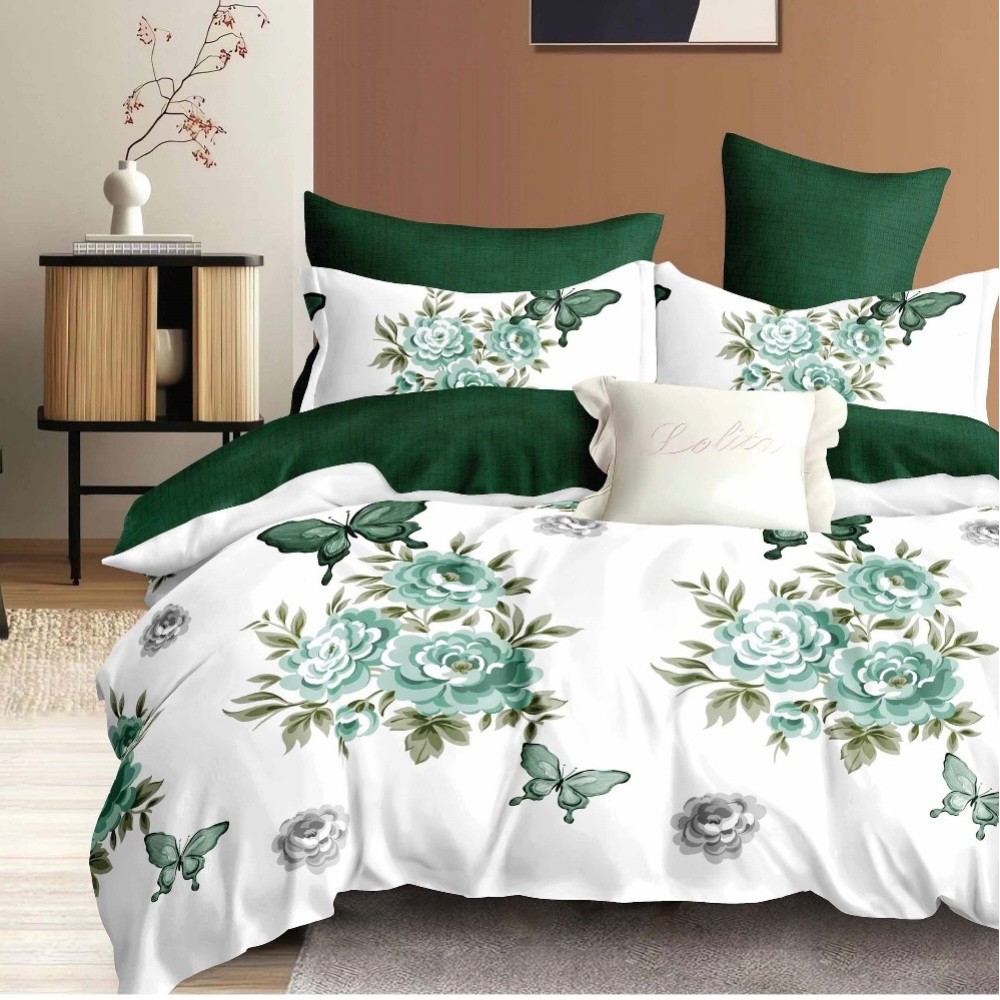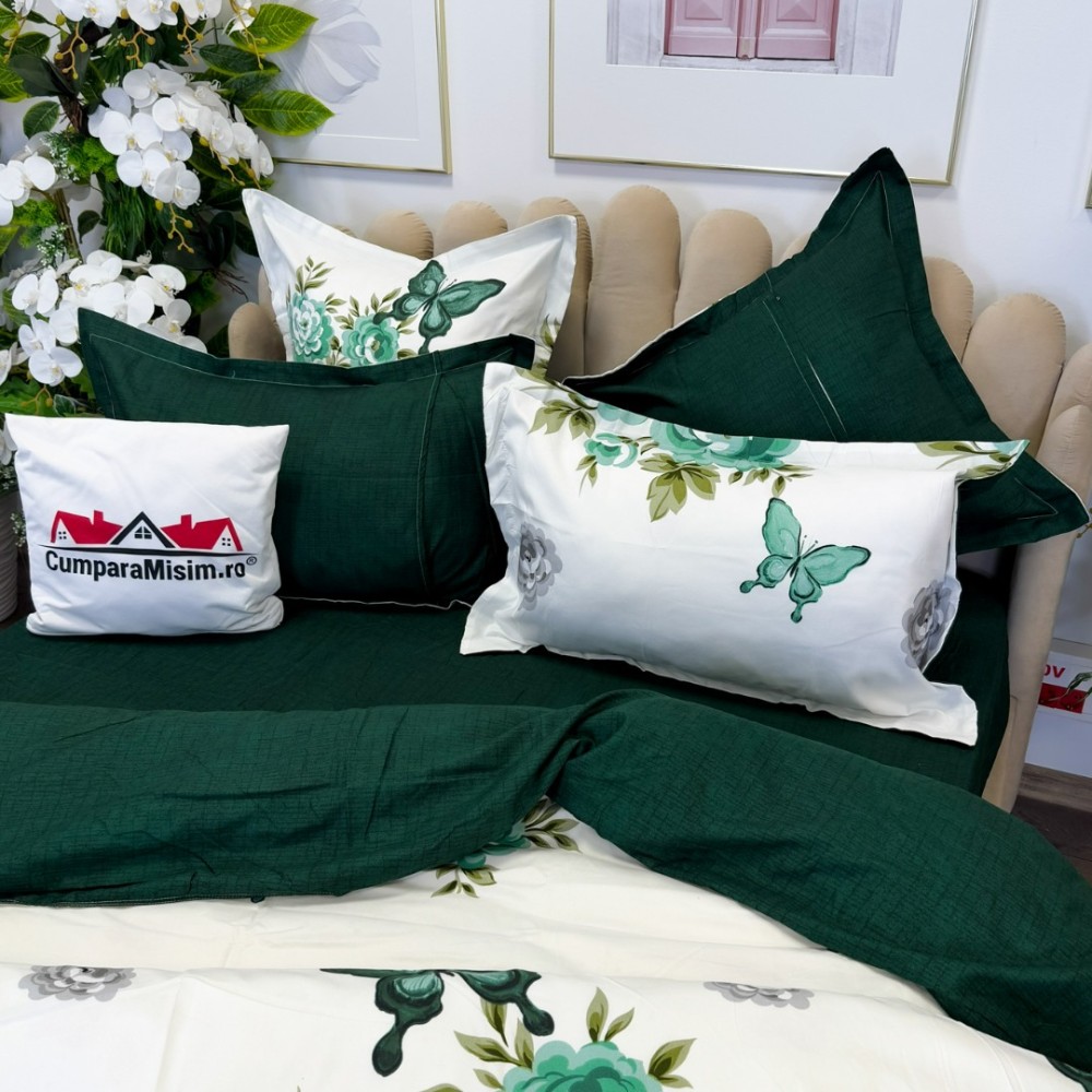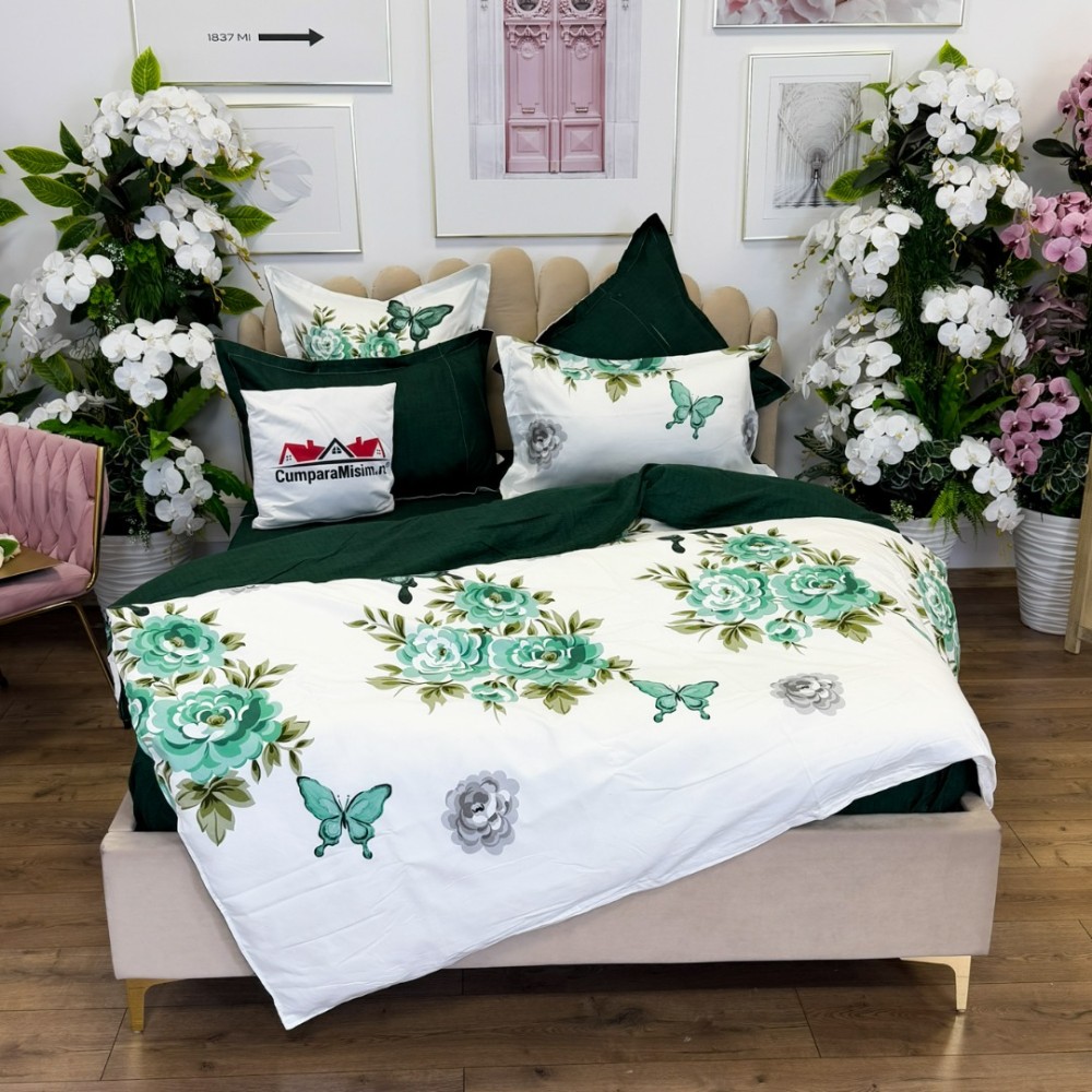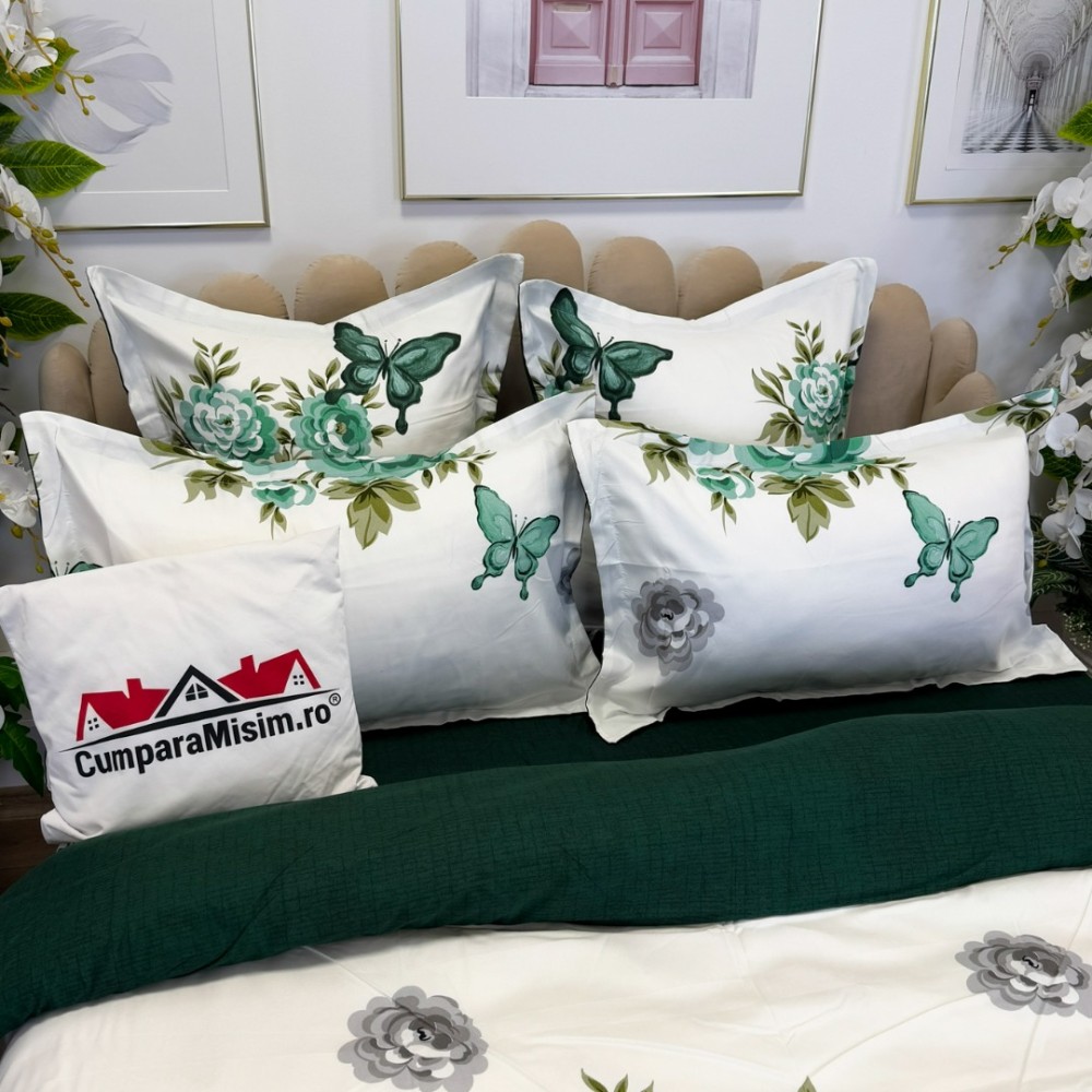 Lenjerie pat dublu, FINET, cu elastic, 6 piese, Alb, Verde, Flori, Fluturi, Primavara Casa, cod produs: PRM-FE-B992