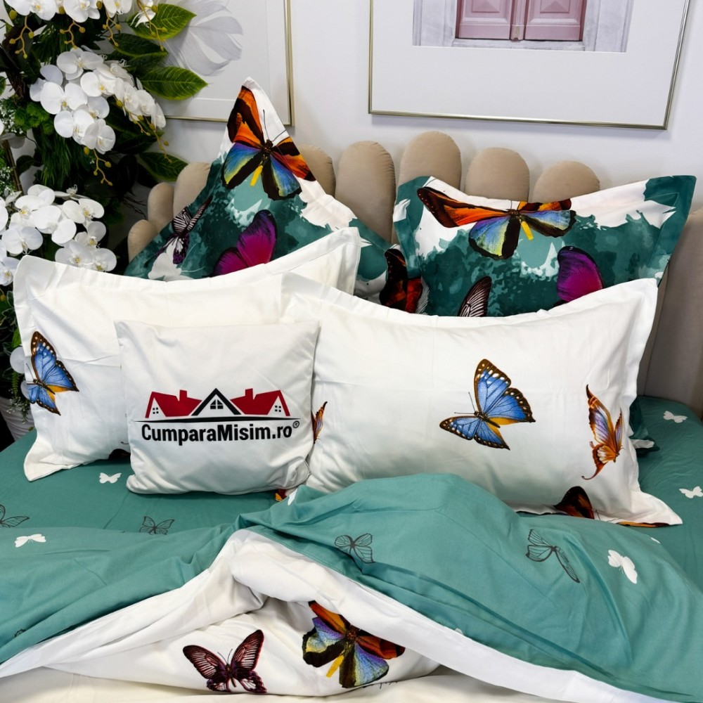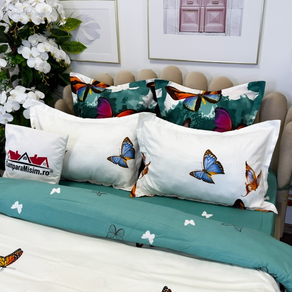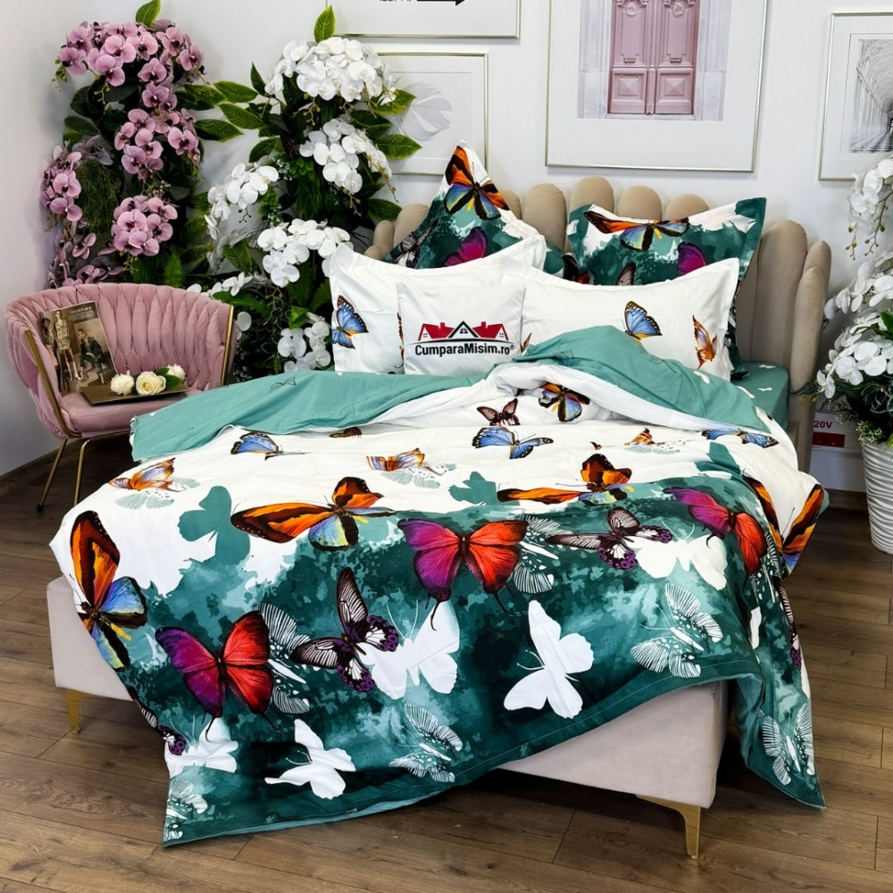 Lenjerie pat dublu, FINET, cu elastic, 6 piese, Alb, Verde, Fluturi, Primavara Casa, cod produs: PRM-FE-B851