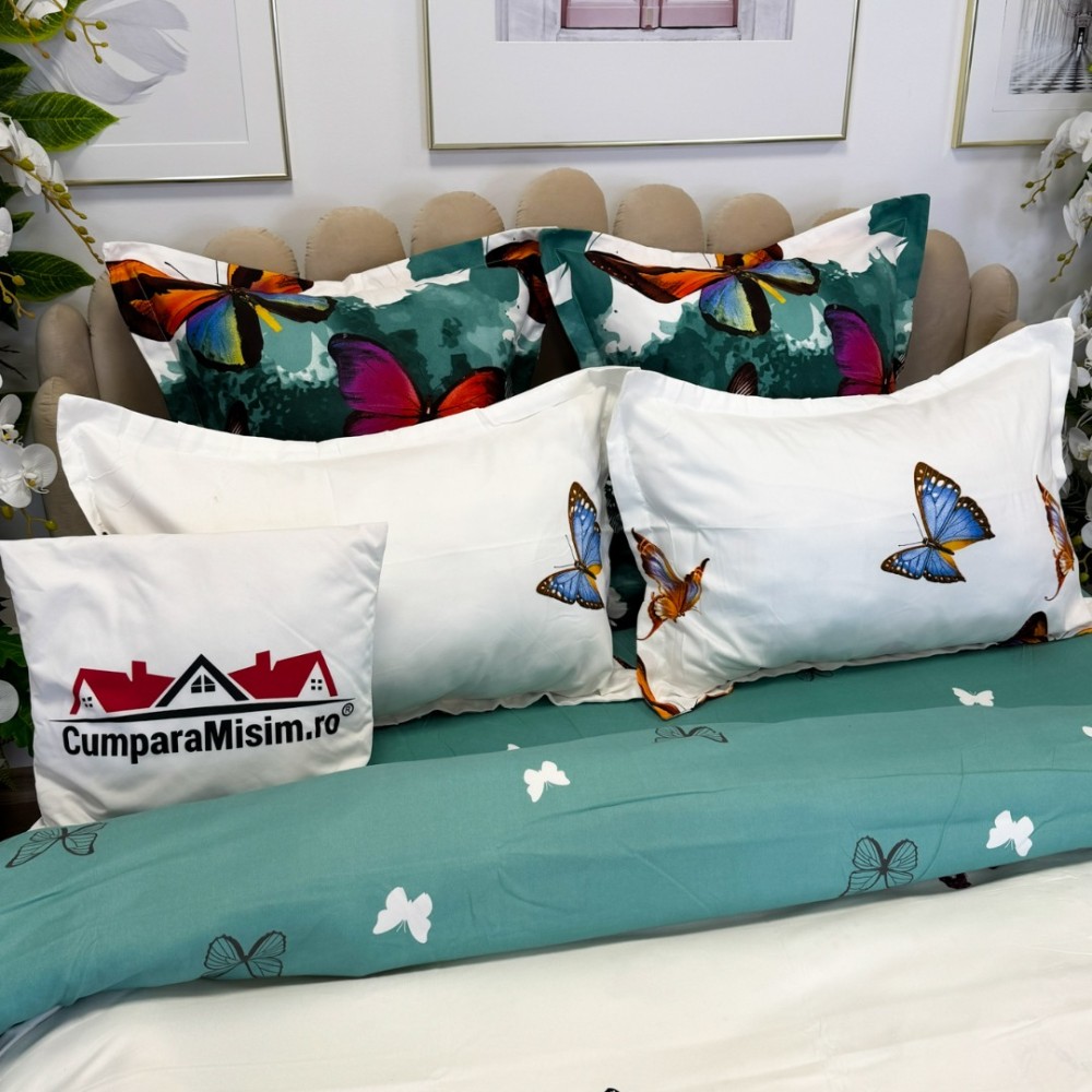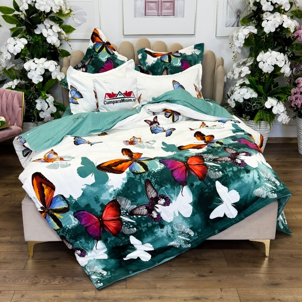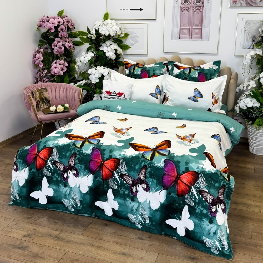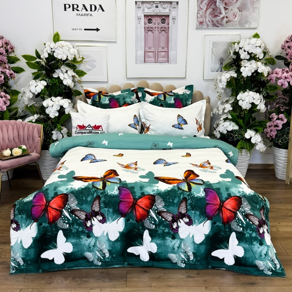 Lenjerie pat dublu, FINET, cu elastic, 6 piese, Alb, Verde, Fluturi, Primavara Casa, cod produs: PRM-FE-B851