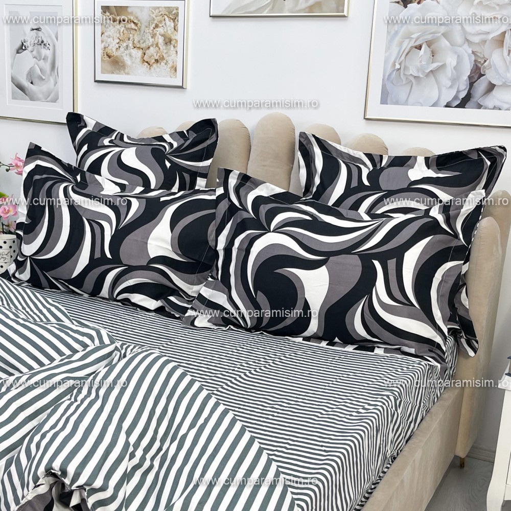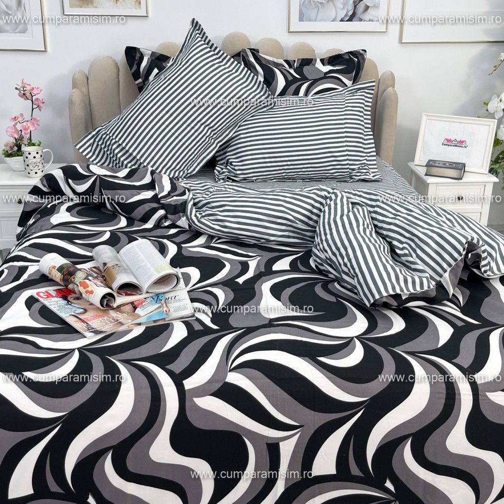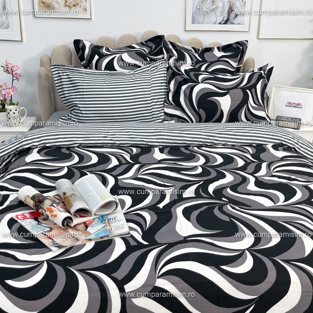 Lenjerie pat dublu, FINET, cu elastic, 6 piese, Alb-Negru, abstract, Primavara Casa, cod produs: PRM-FE-B946