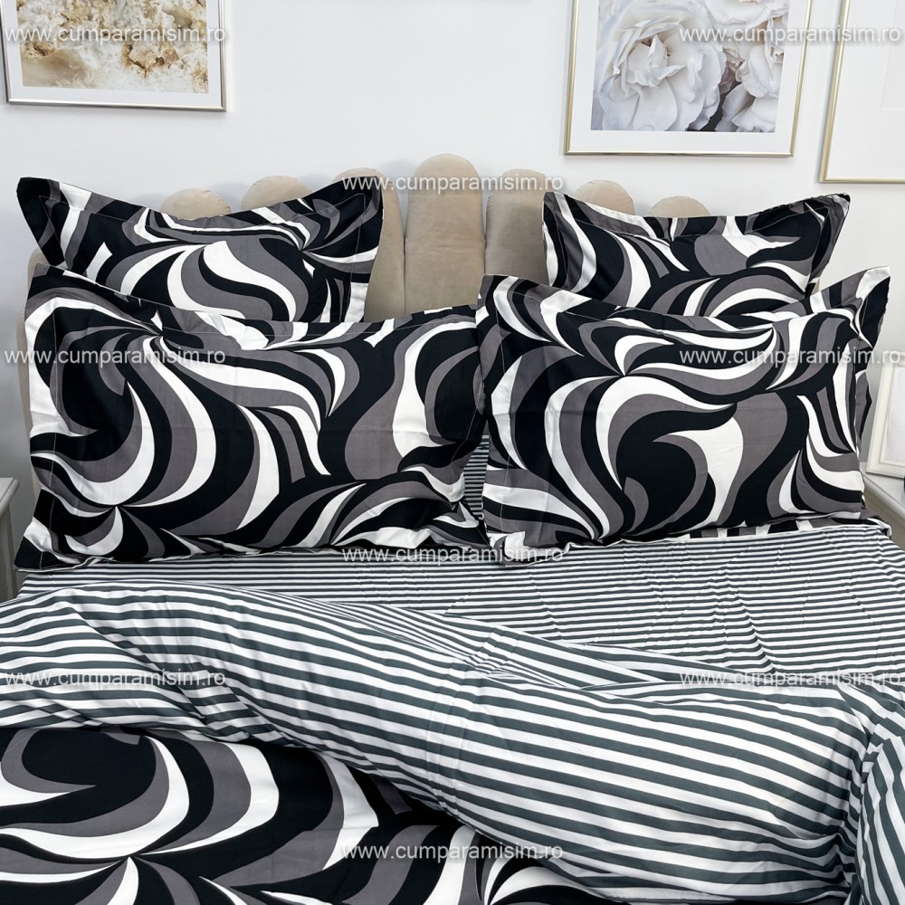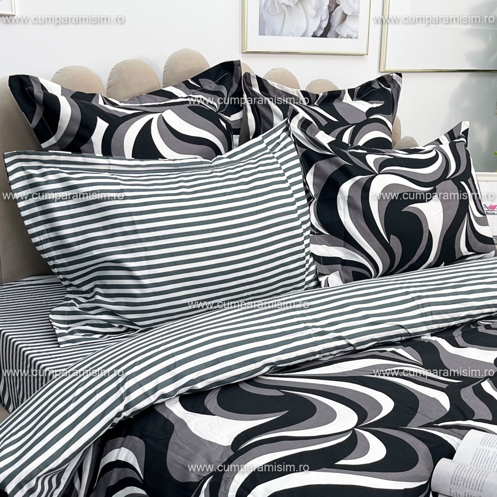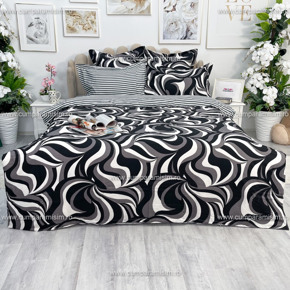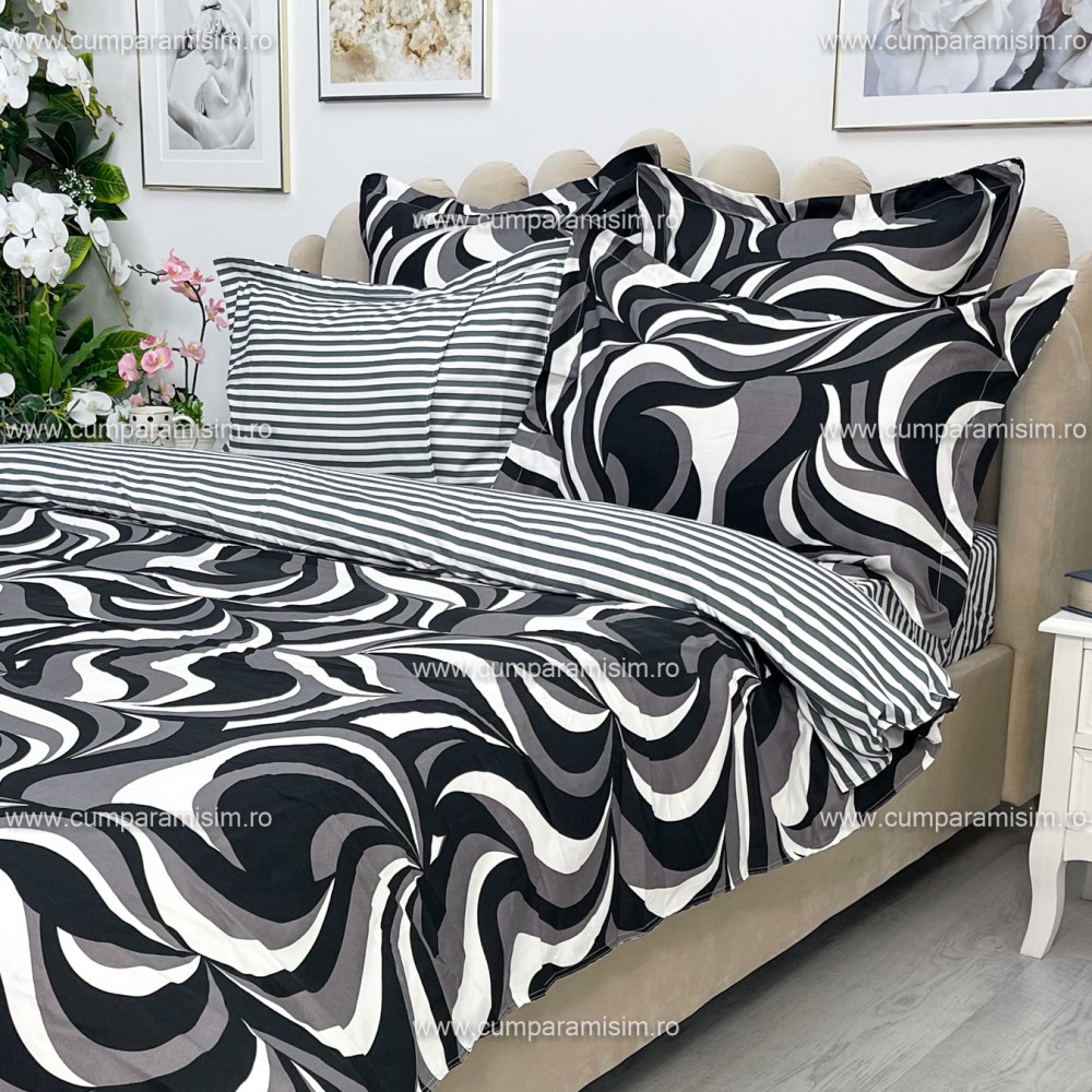 Lenjerie pat dublu, FINET, cu elastic, 6 piese, Alb-Negru, abstract, Primavara Casa, cod produs: PRM-FE-B946