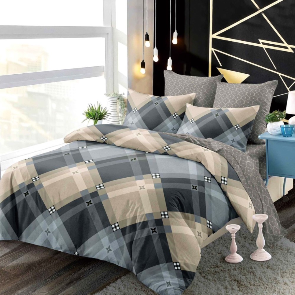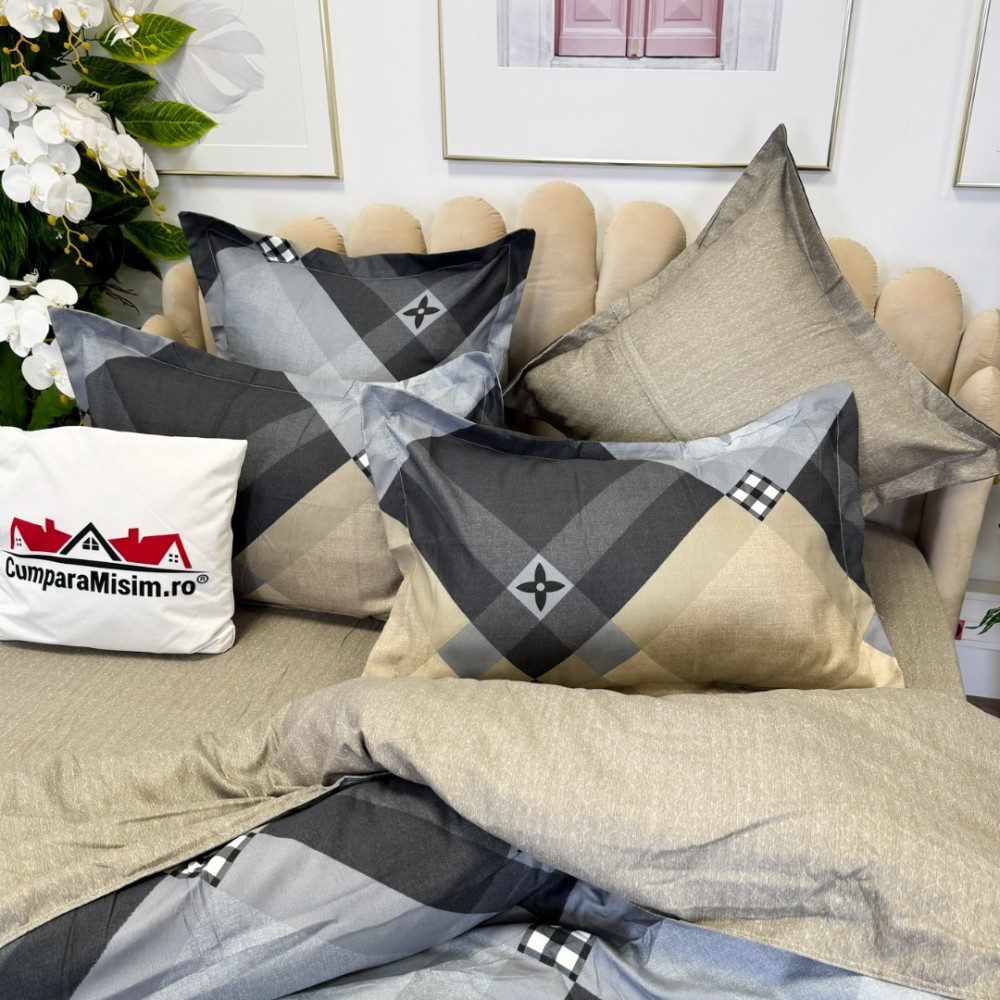 Lenjerie pat dublu, FINET, cu elastic, 6 piese, Bej, Gri, Forme Geometrice, Primavara Casa, cod produs: PRM-FE-B6006