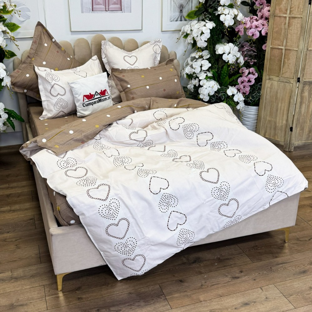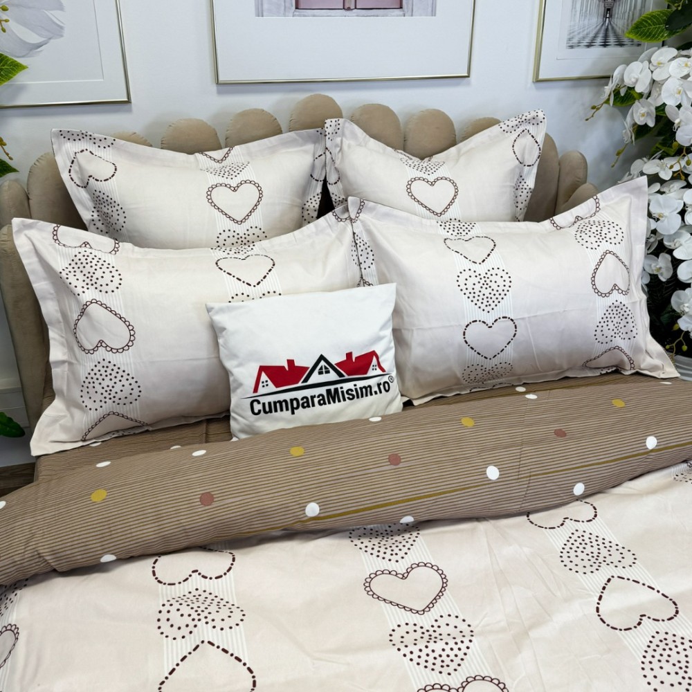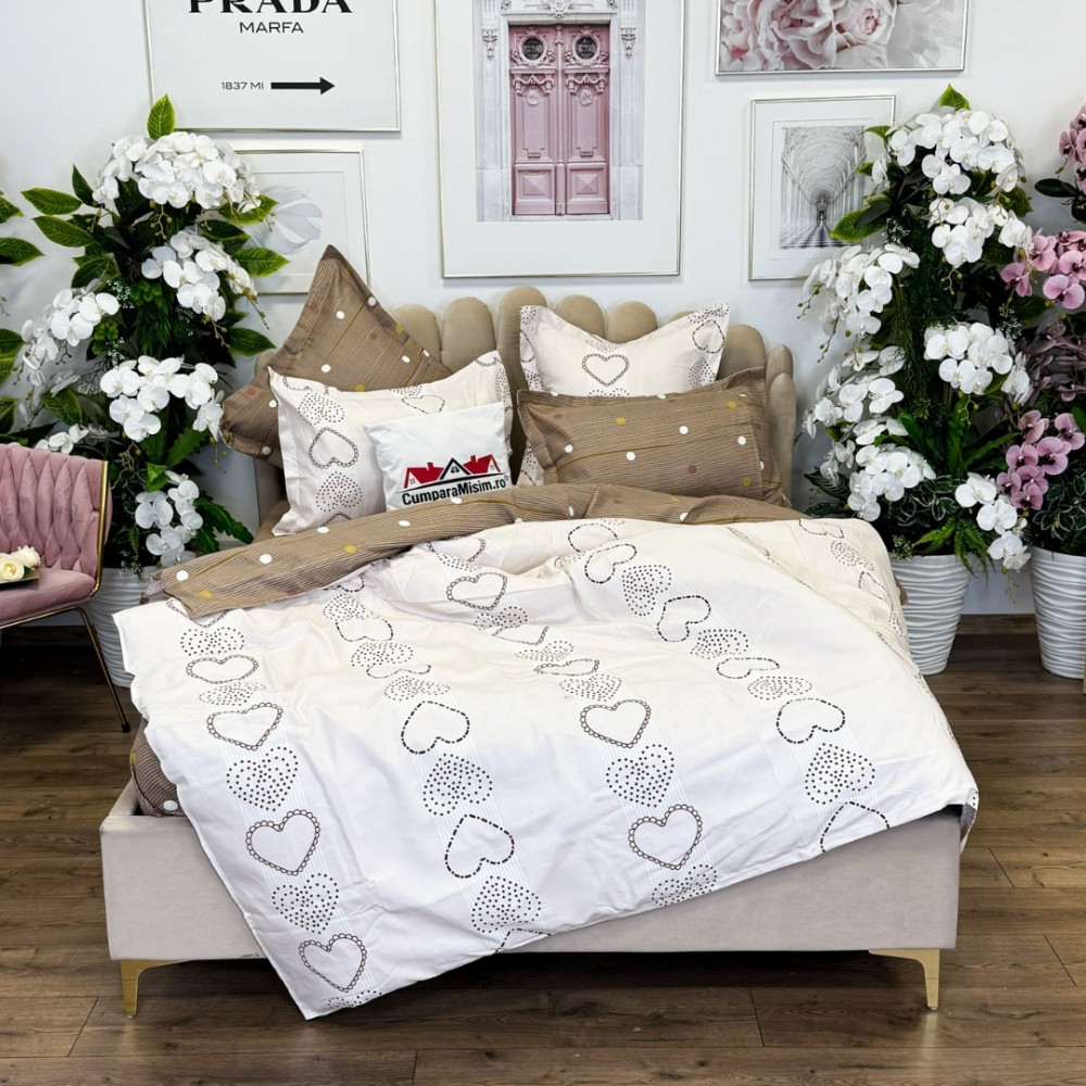 Lenjerie pat dublu, FINET, cu elastic, 6 piese, Bej, Maro, inimioare, Primavara Casa, cod produs: PRM-FE-B969