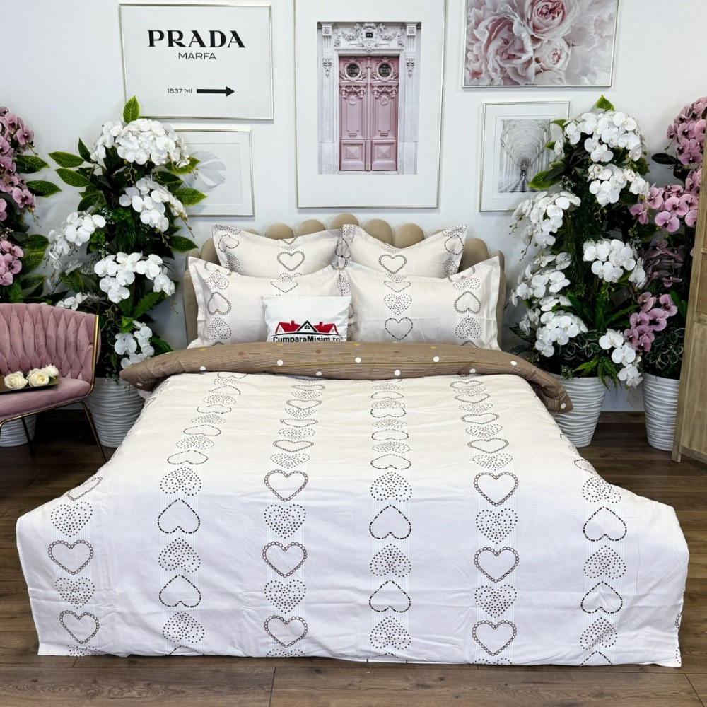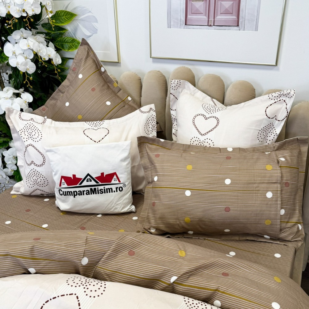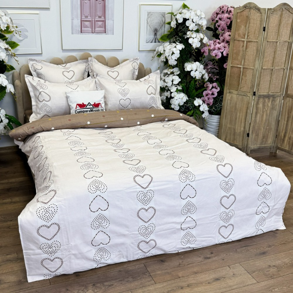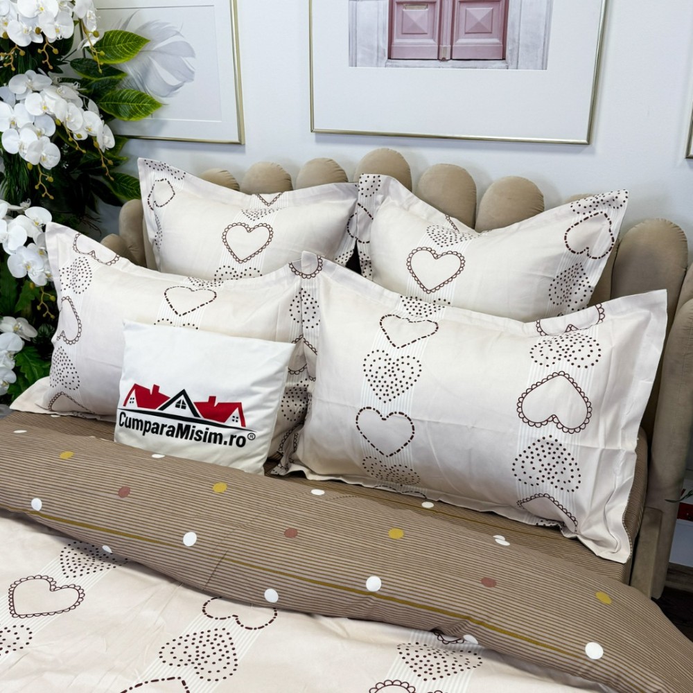 Lenjerie pat dublu, FINET, cu elastic, 6 piese, Bej, Maro, inimioare, Primavara Casa, cod produs: PRM-FE-B969