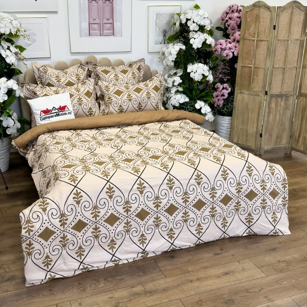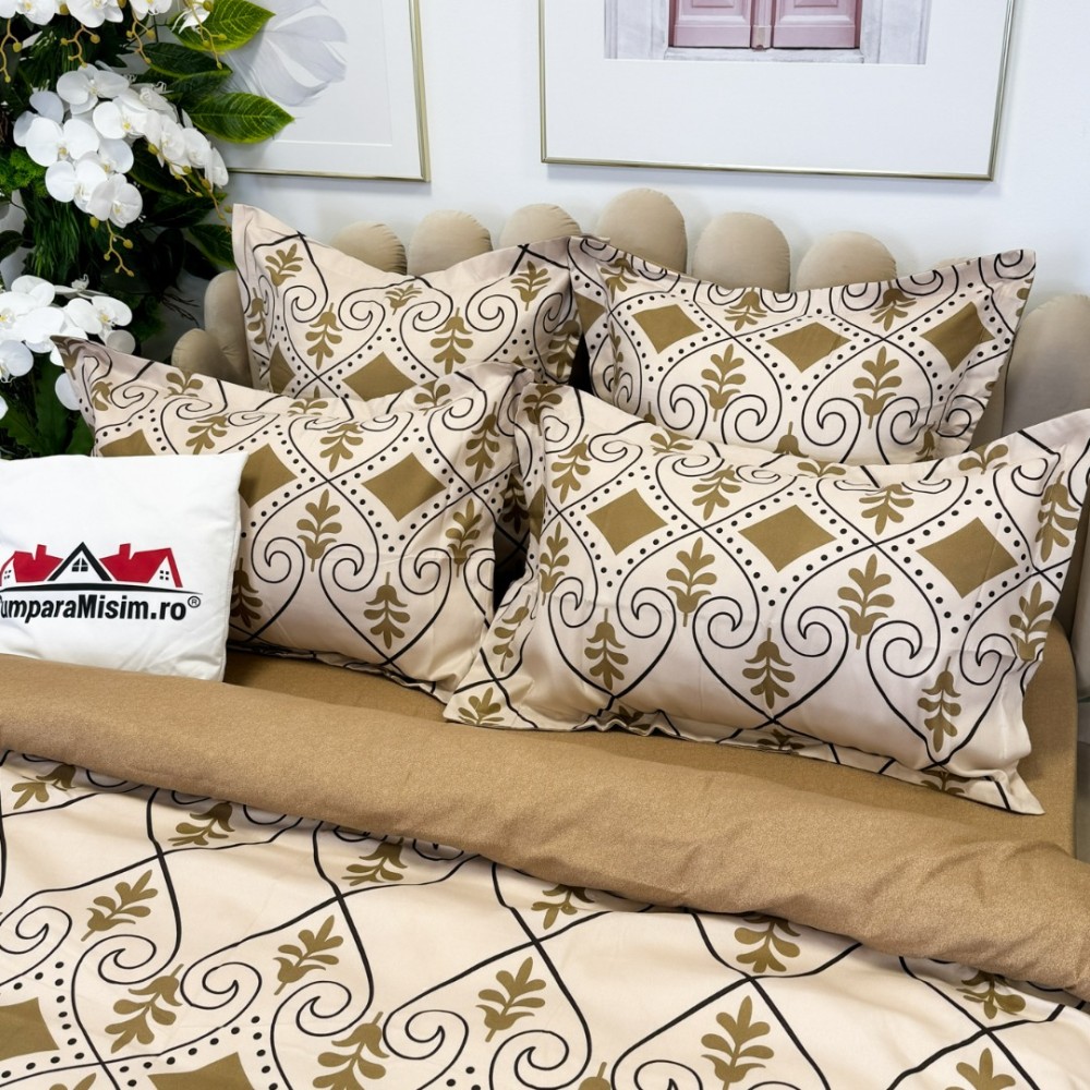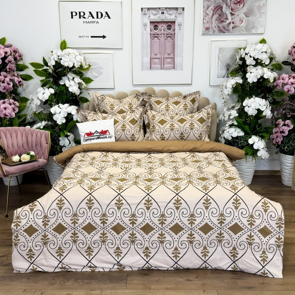 Lenjerie pat dublu, FINET, cu elastic, 6 piese, Bej, Maro, Model Oriental, Primavara Casa, cod produs: PRM-FE-B6013