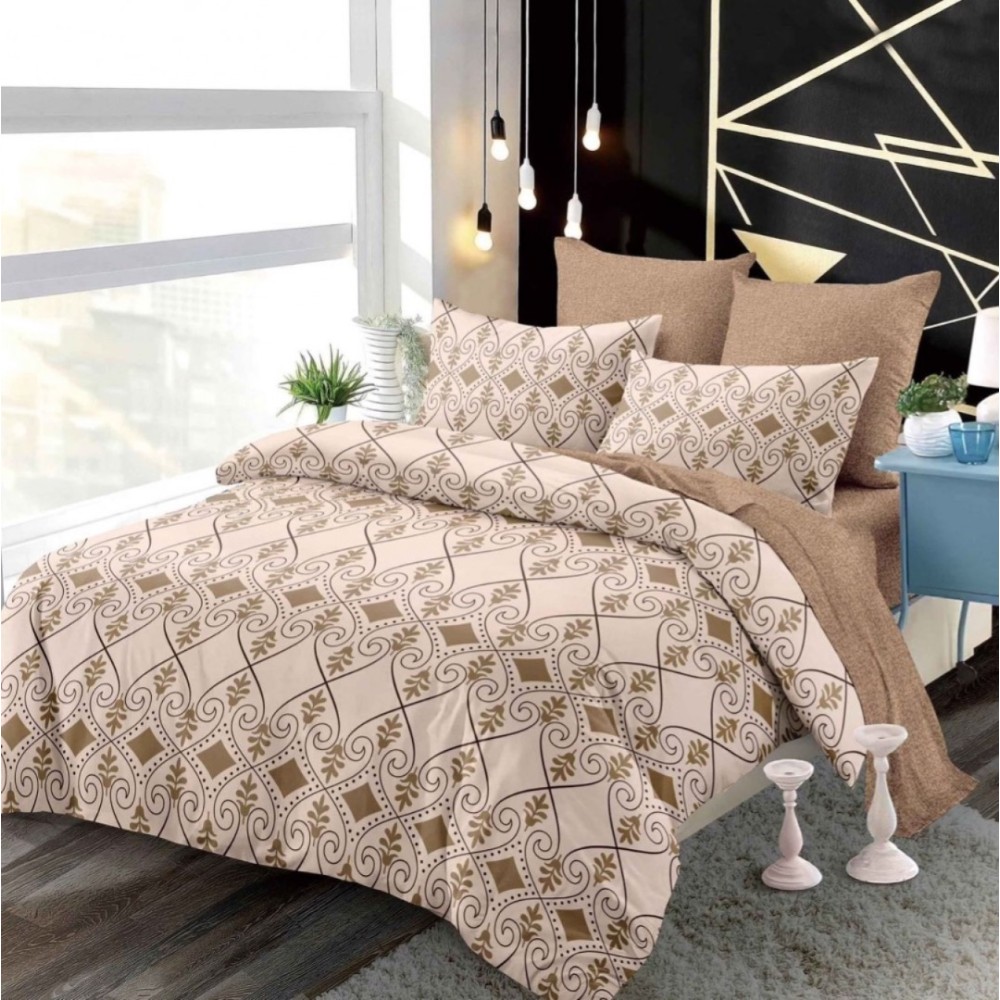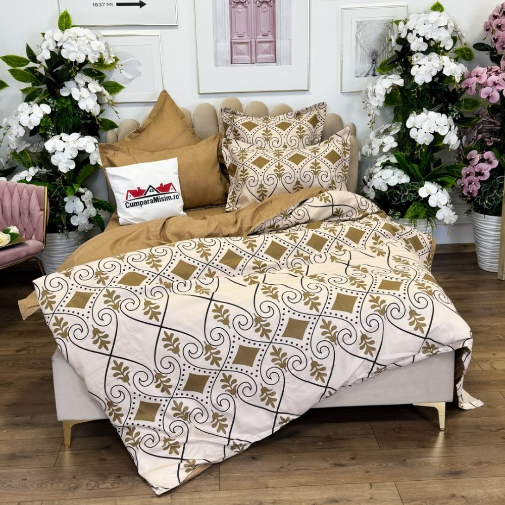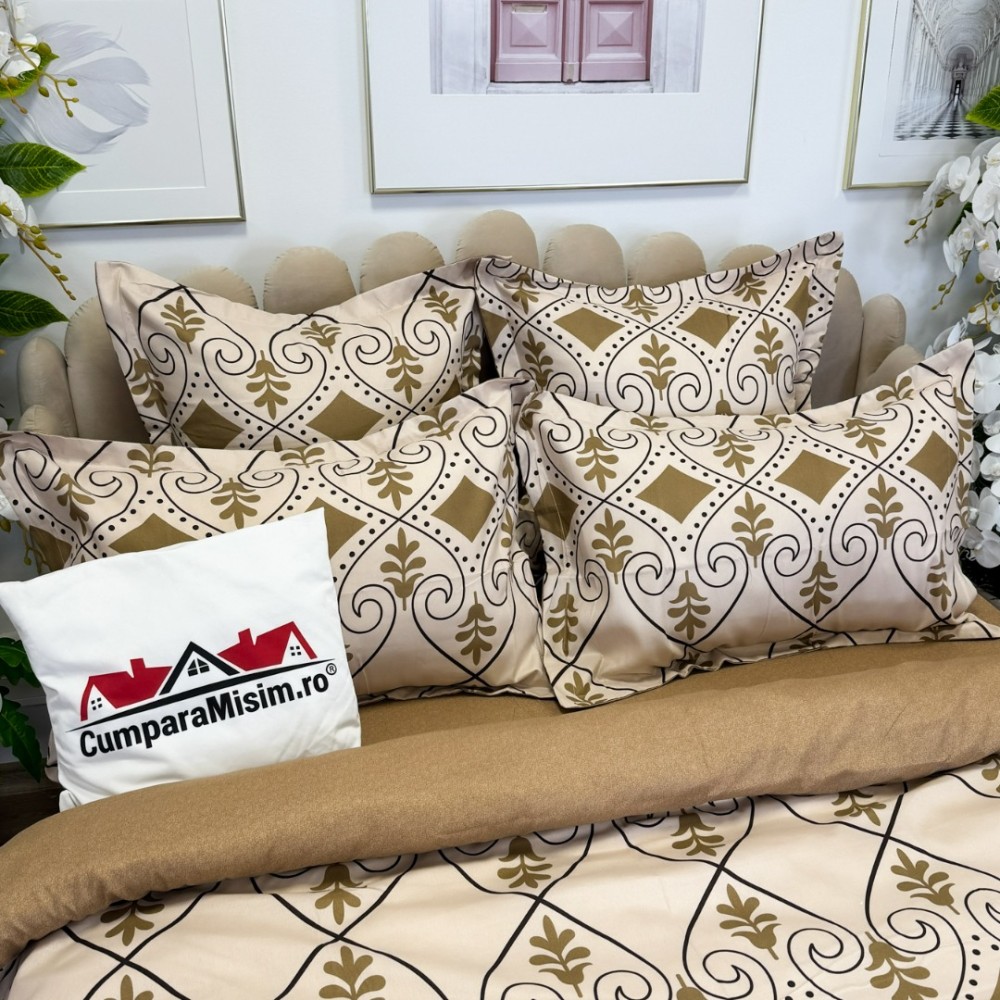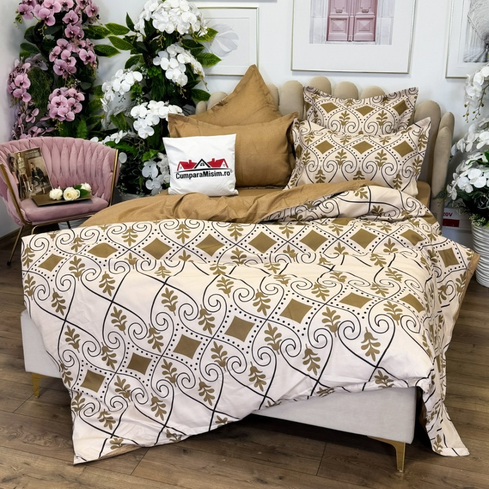 Lenjerie pat dublu, FINET, cu elastic, 6 piese, Bej, Maro, Model Oriental, Primavara Casa, cod produs: PRM-FE-B6013
