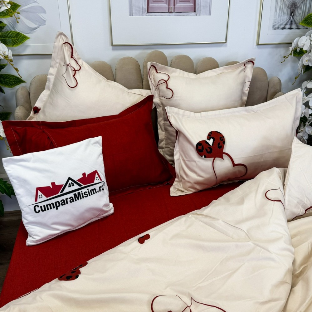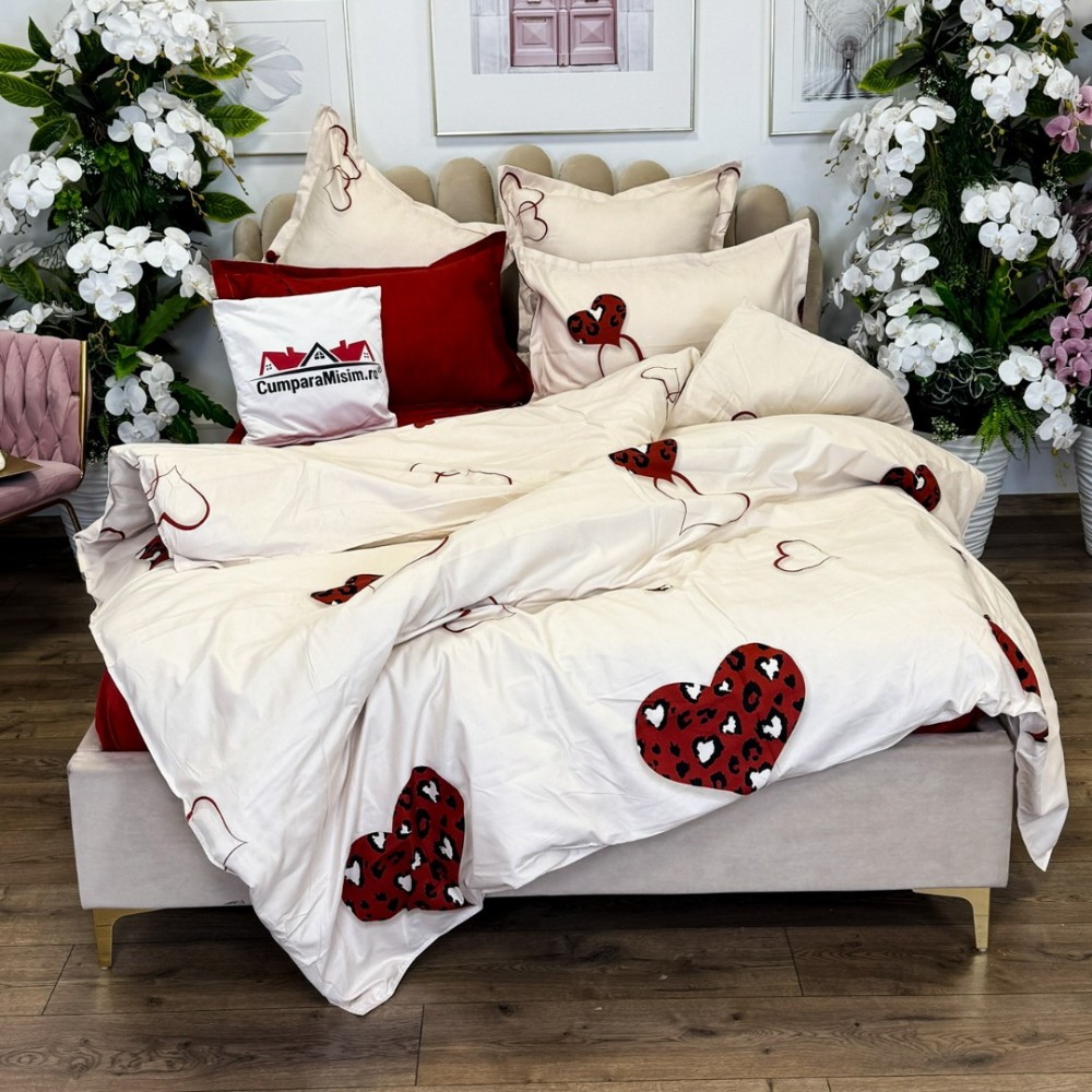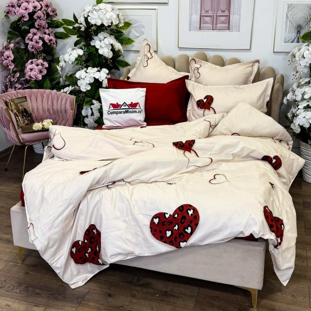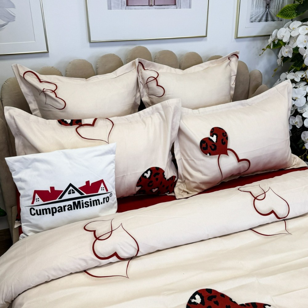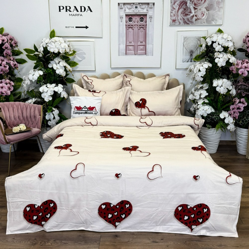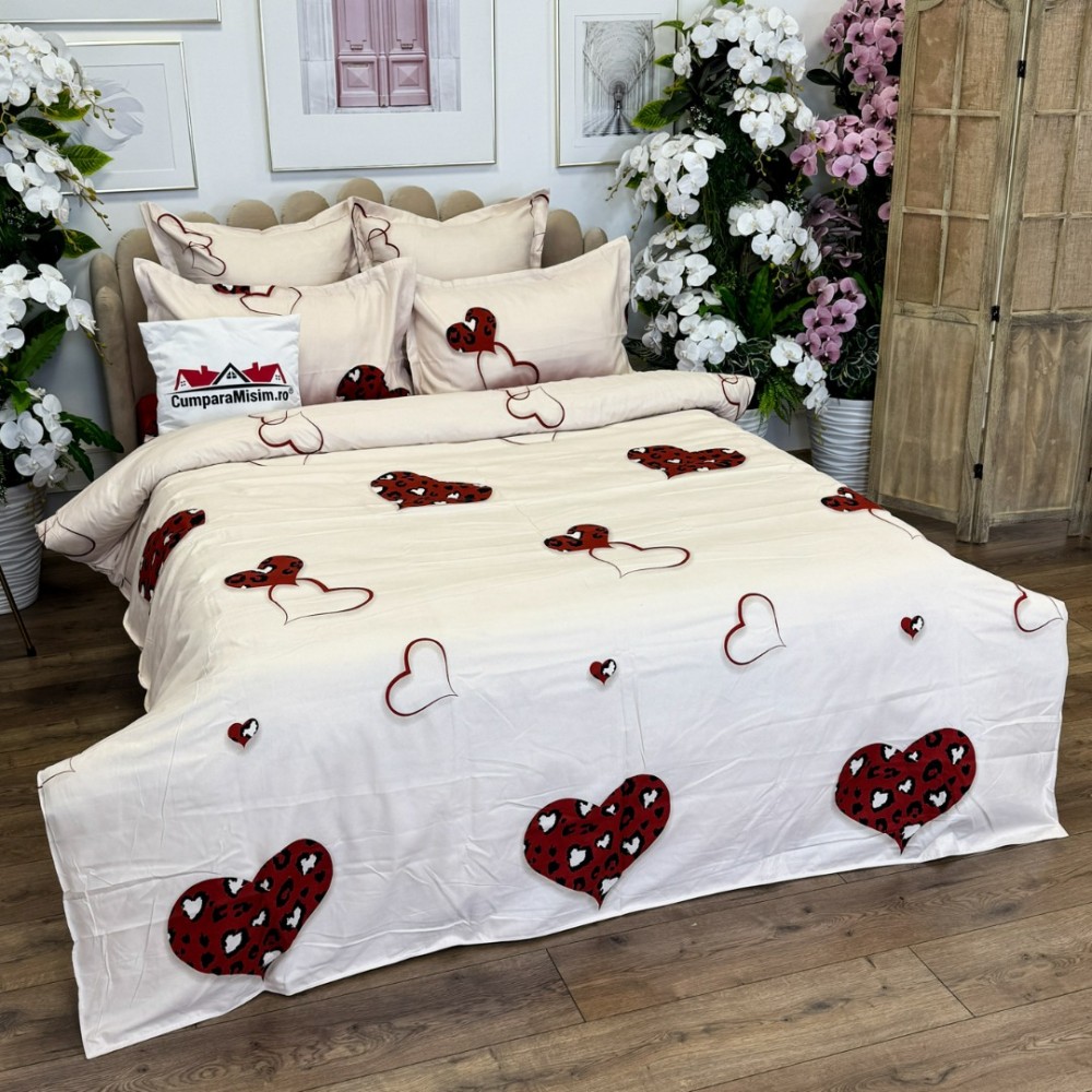 Lenjerie pat dublu, FINET, cu elastic, 6 piese, Crem, Roșu, Inimioare, Primavara Casa, cod produs: PRM-FE-B994