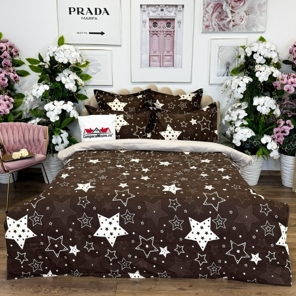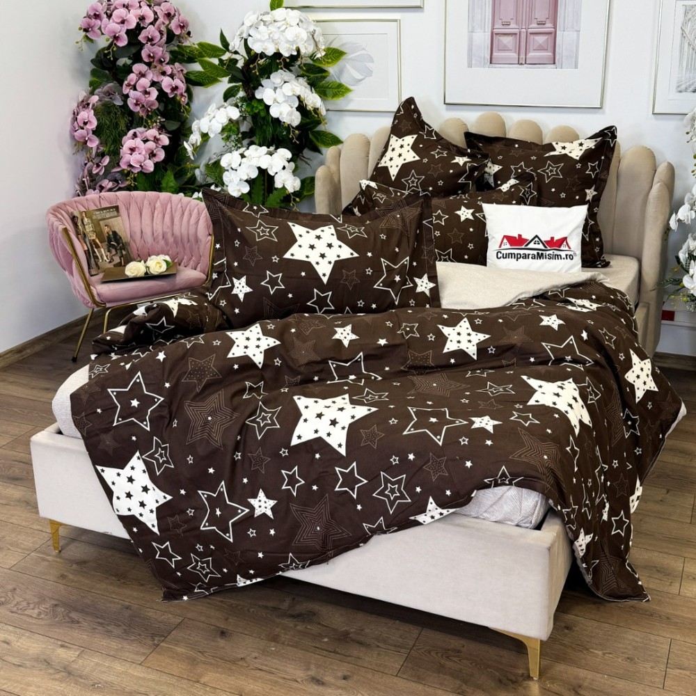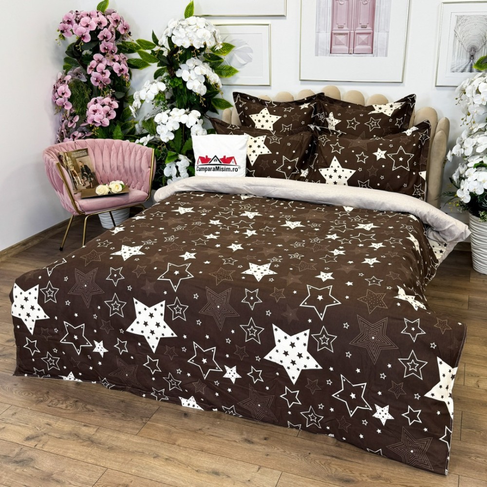 Lenjerie pat dublu, FINET, cu elastic, 6 piese, Maro, Bej, Stelute, Primavara Casa, cod produs: PRM-FE-B973