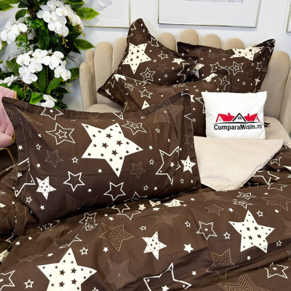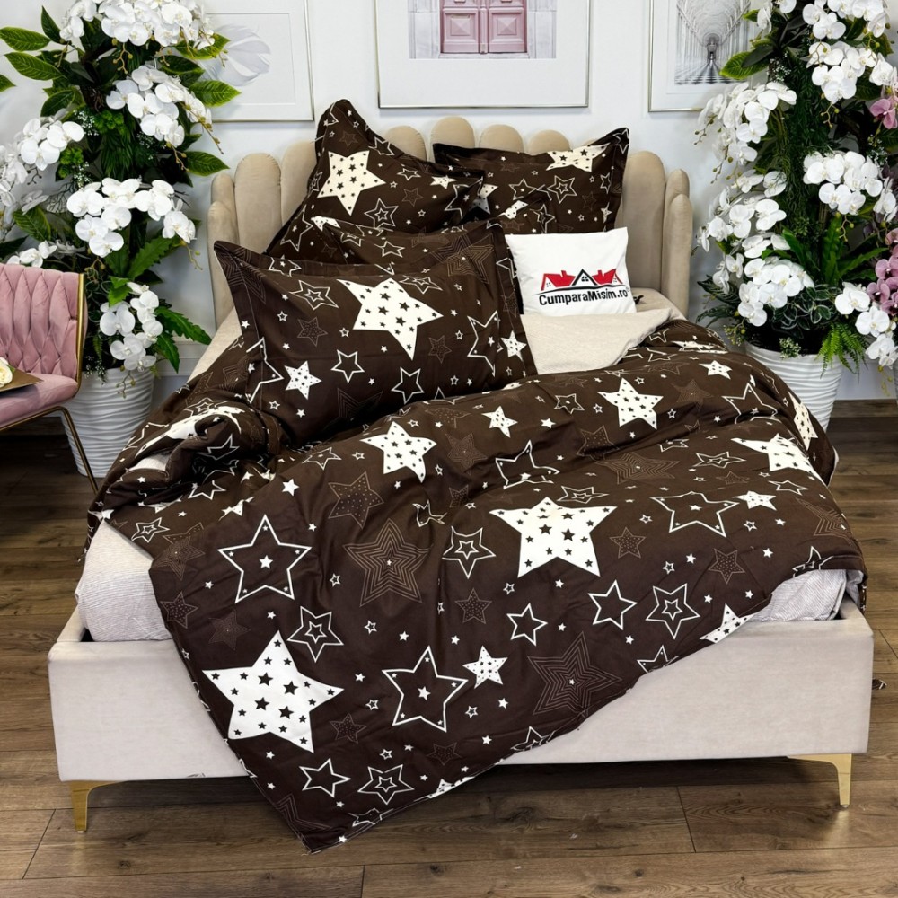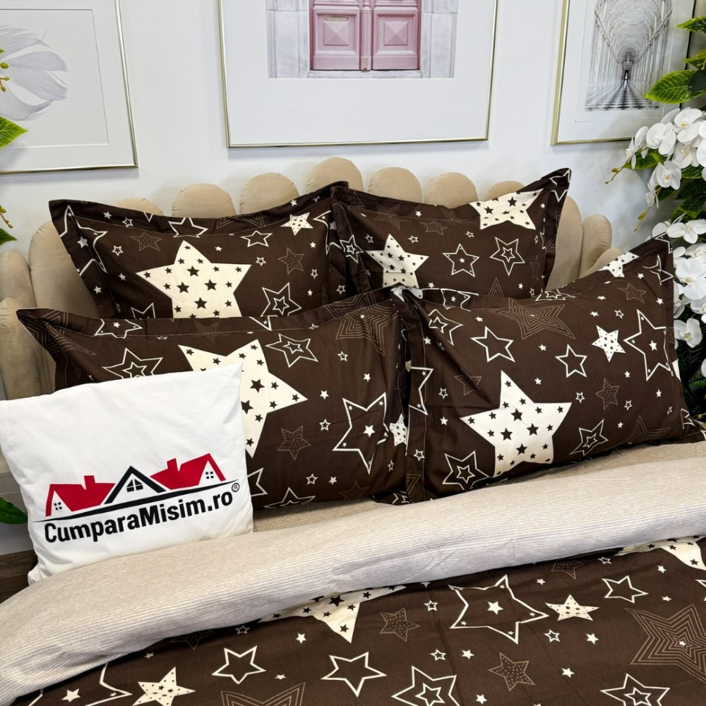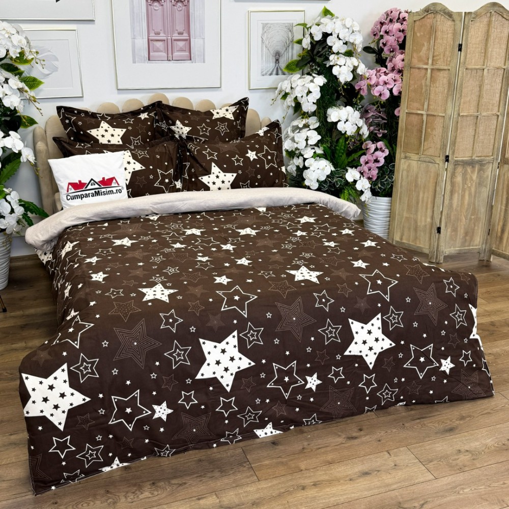 Lenjerie pat dublu, FINET, cu elastic, 6 piese, Maro, Bej, Stelute, Primavara Casa, cod produs: PRM-FE-B973
