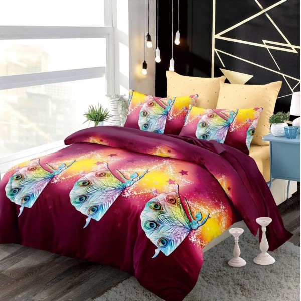 Lenjerie pat dublu, FINET, cu elastic, 6 piese, Visiniu, pene, stelute, Primavara Casa, cod produs: CFE155