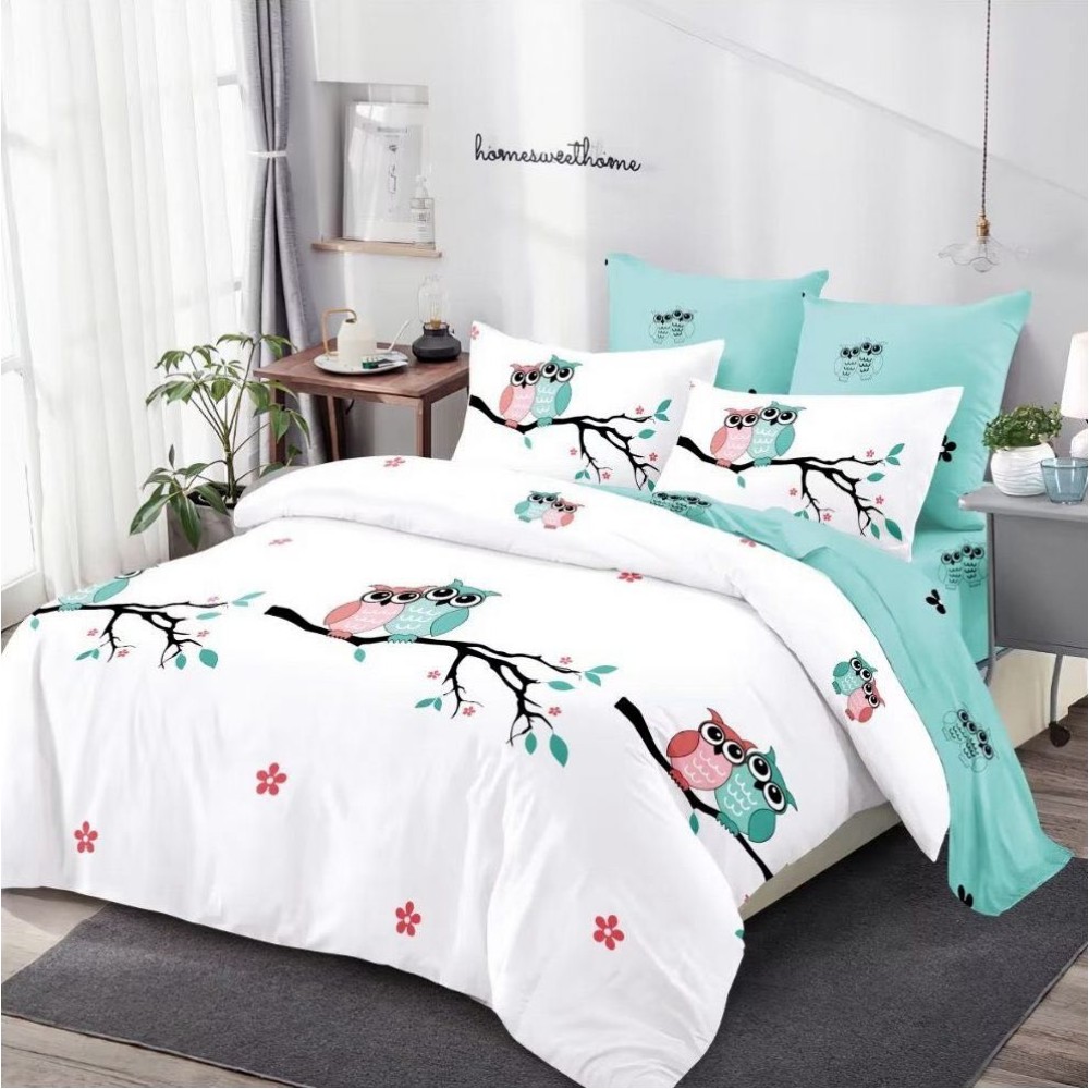 Lenjerie pat dublu, FINET, cu elastic, 6 piese, Turquoise, flori, bufnite, Primavara Casa, cod produs: CFE231