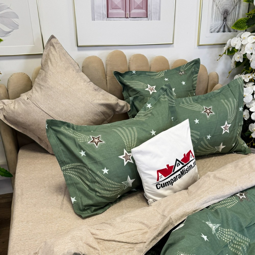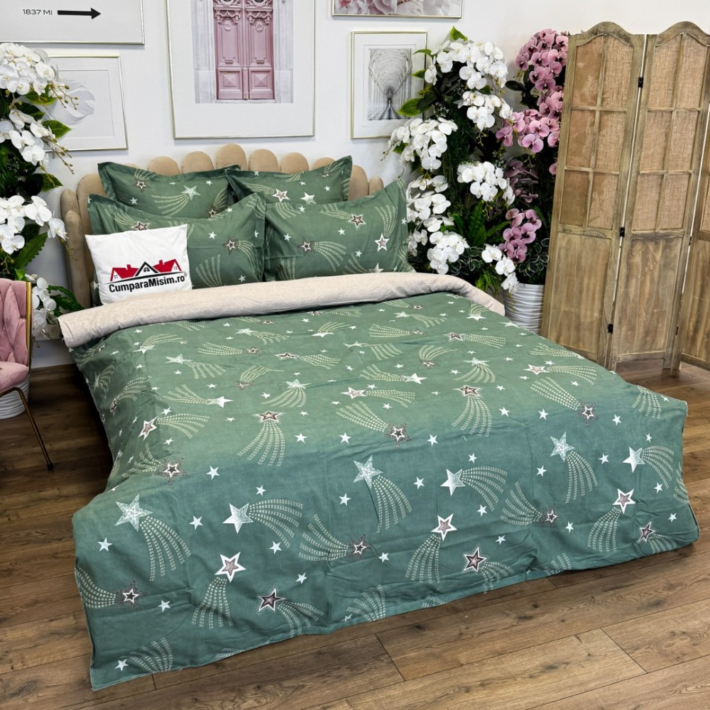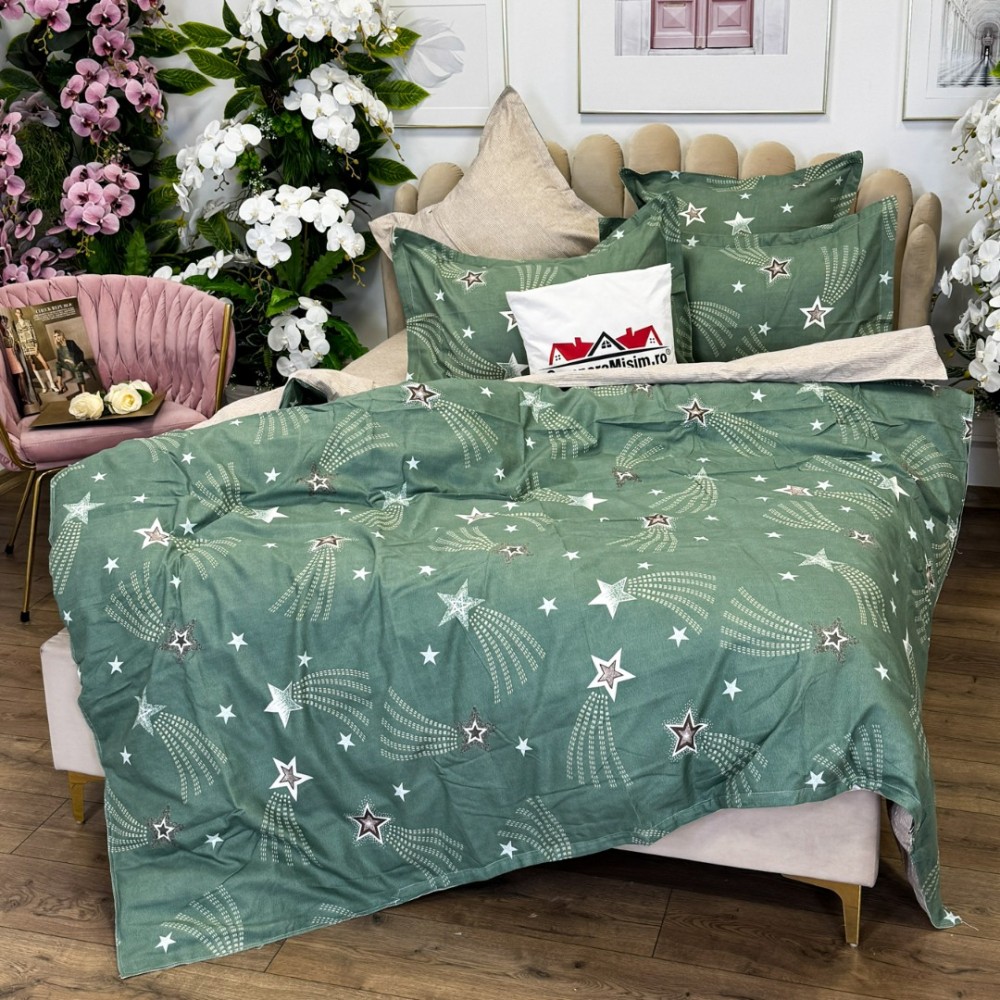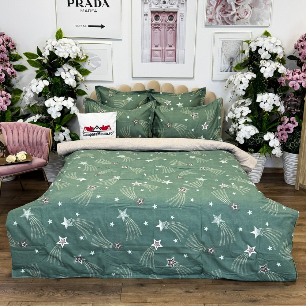 Lenjerie pat dublu, FINET, cu elastic, 6 piese, Verde, Bej, stelute, Primavara Casa, cod produs: PRM-FE-B923