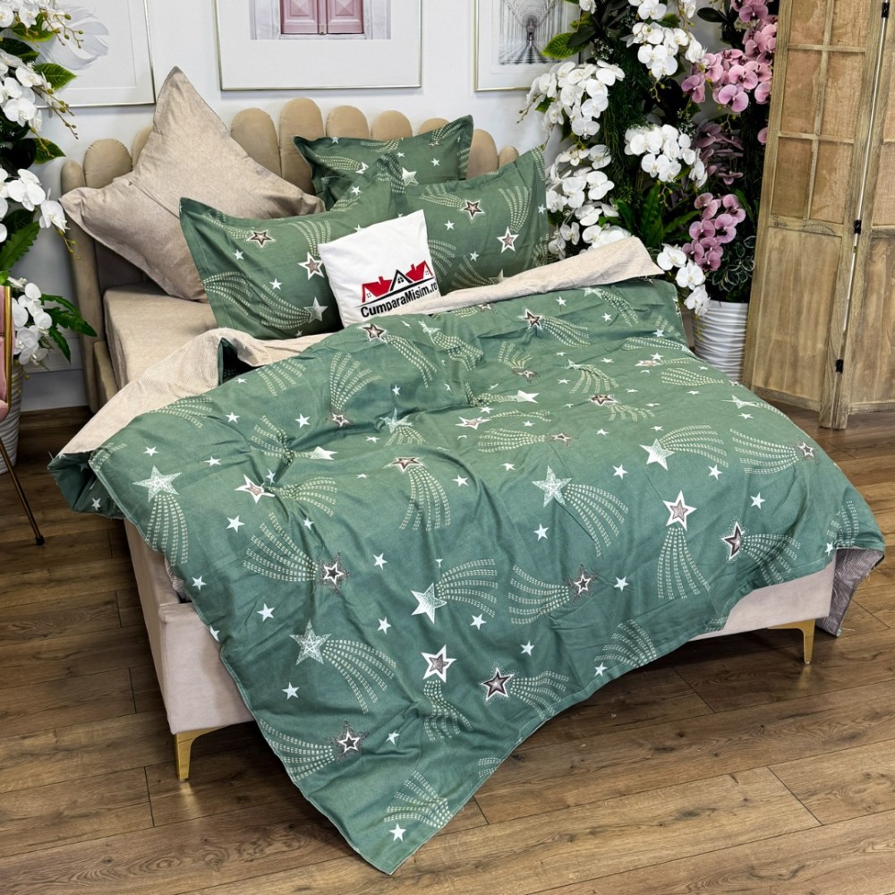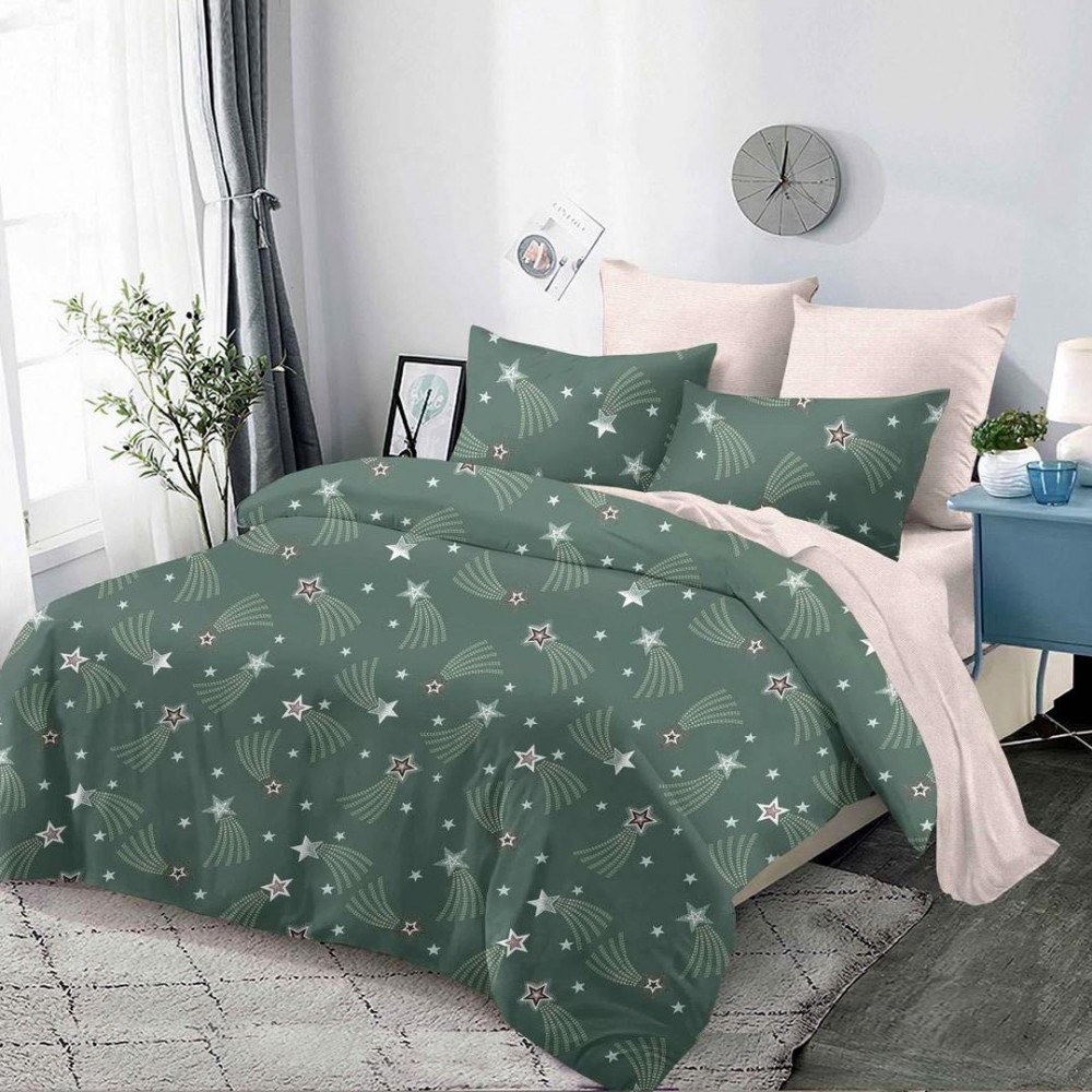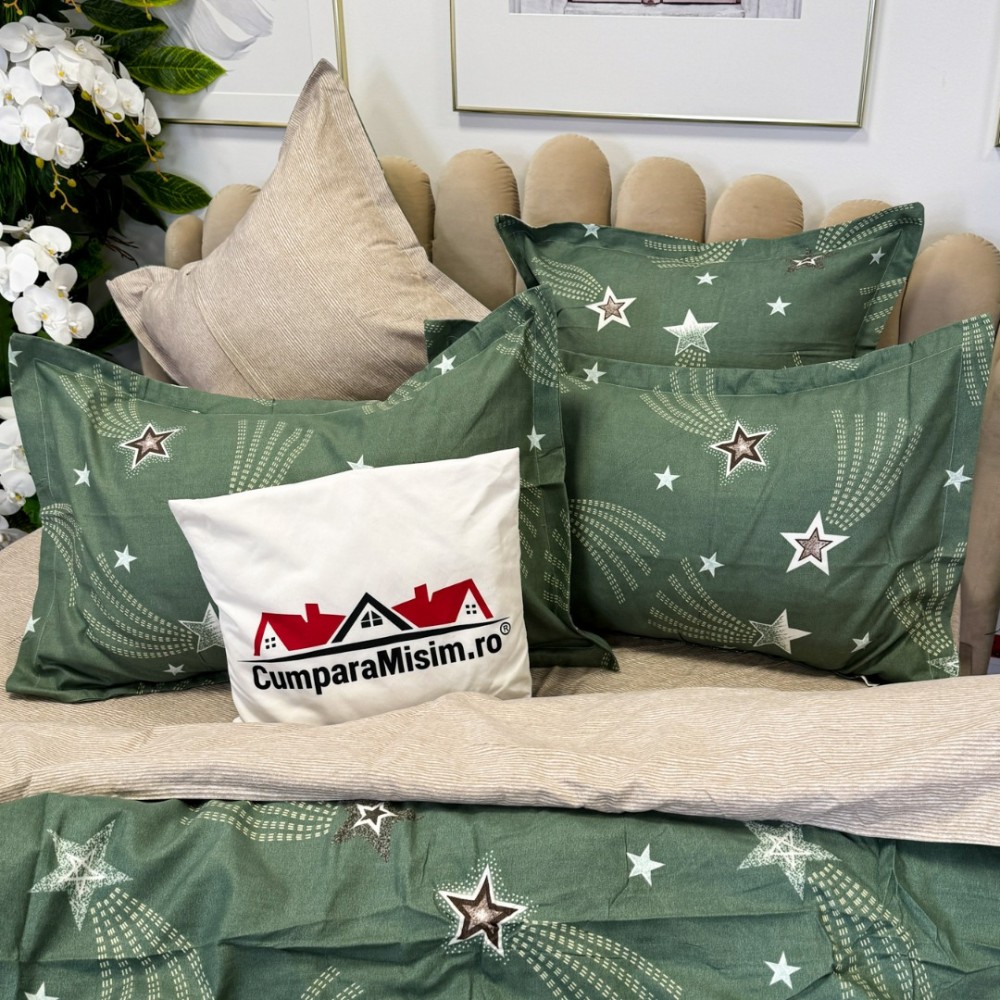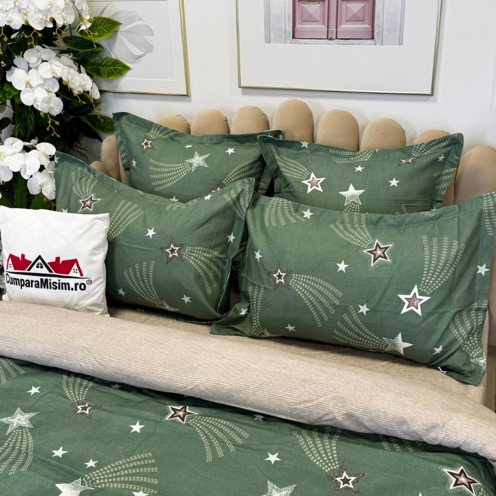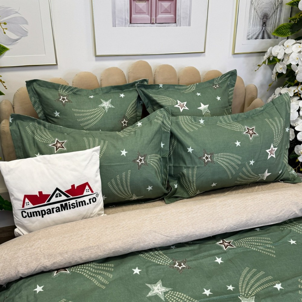 Lenjerie pat dublu, FINET, cu elastic, 6 piese, Verde, Bej, stelute, Primavara Casa, cod produs: PRM-FE-B923