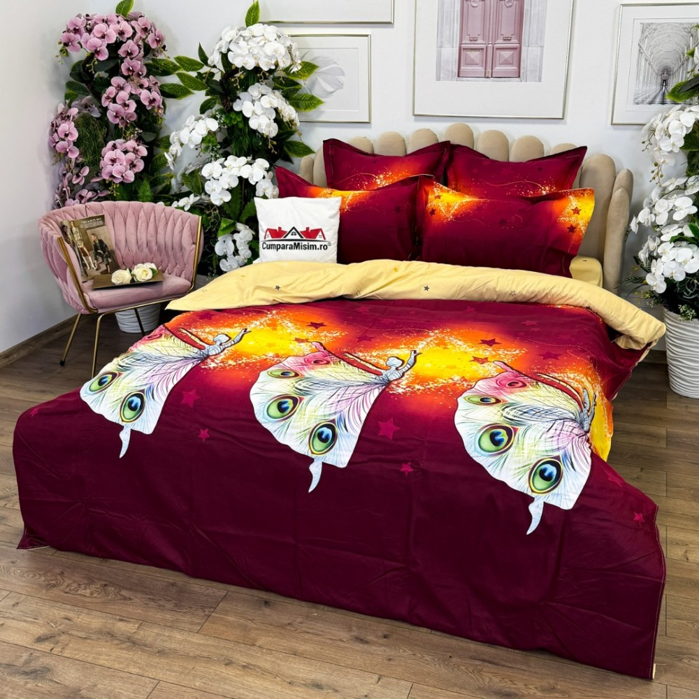 Lenjerie pat dublu, FINET, cu elastic, 6 piese, Violet degrade, Multicolor, Zane, Pene, Stelute, Primavara Casa, cod produs: PRM-FE-B106