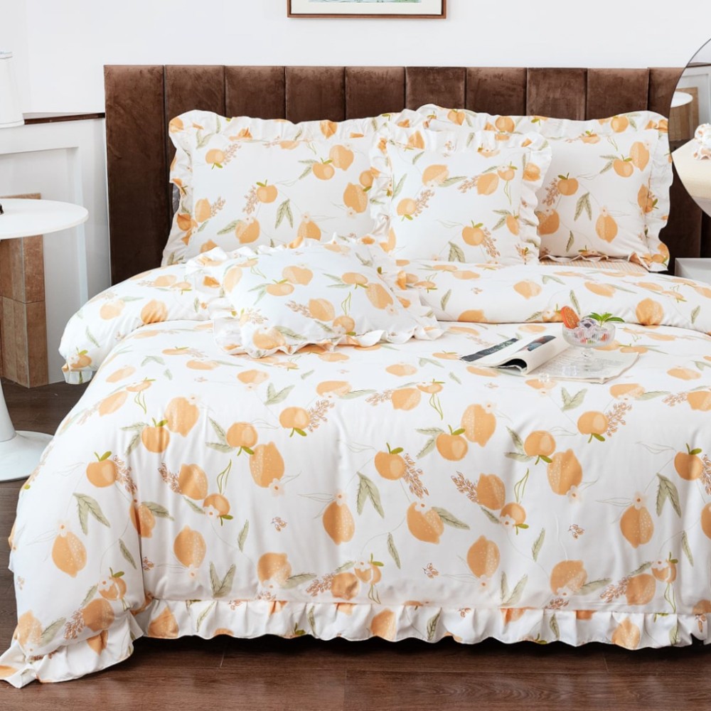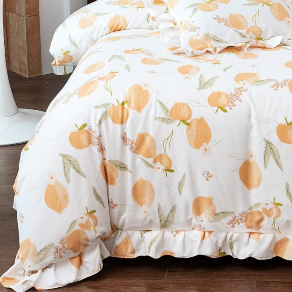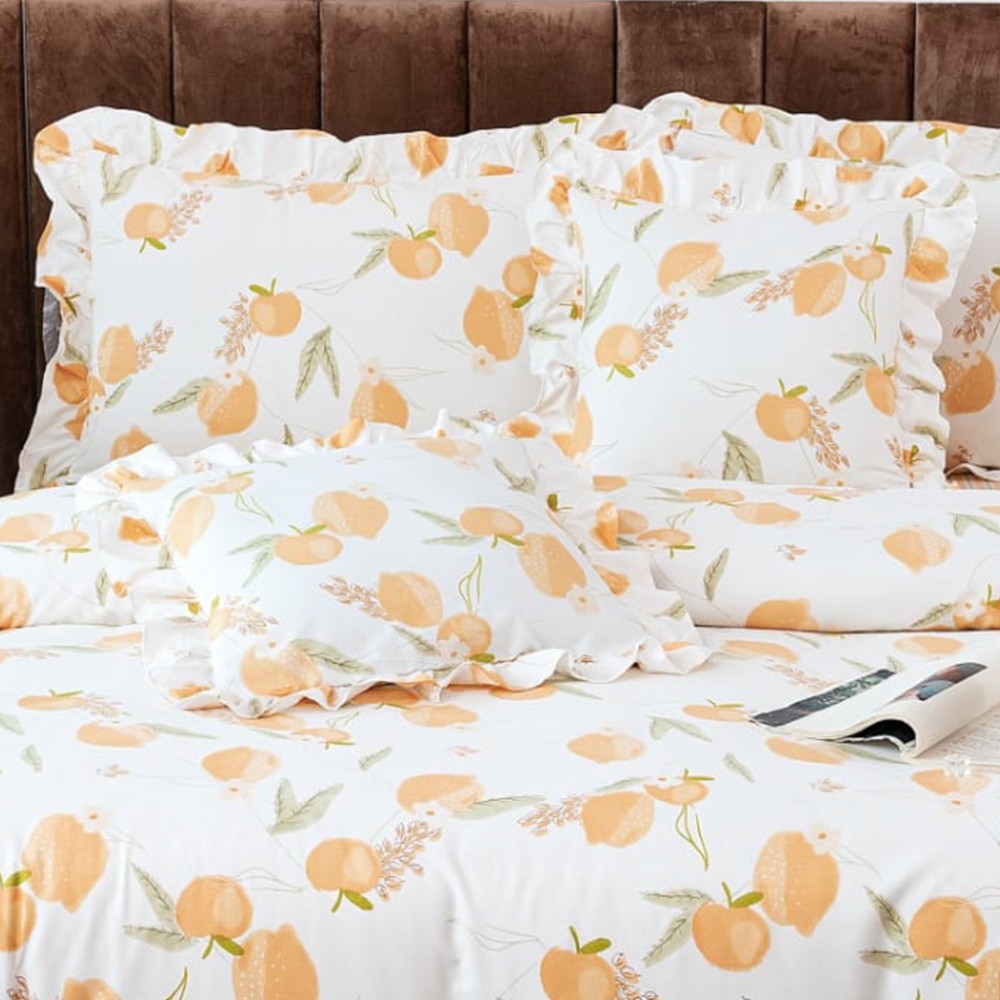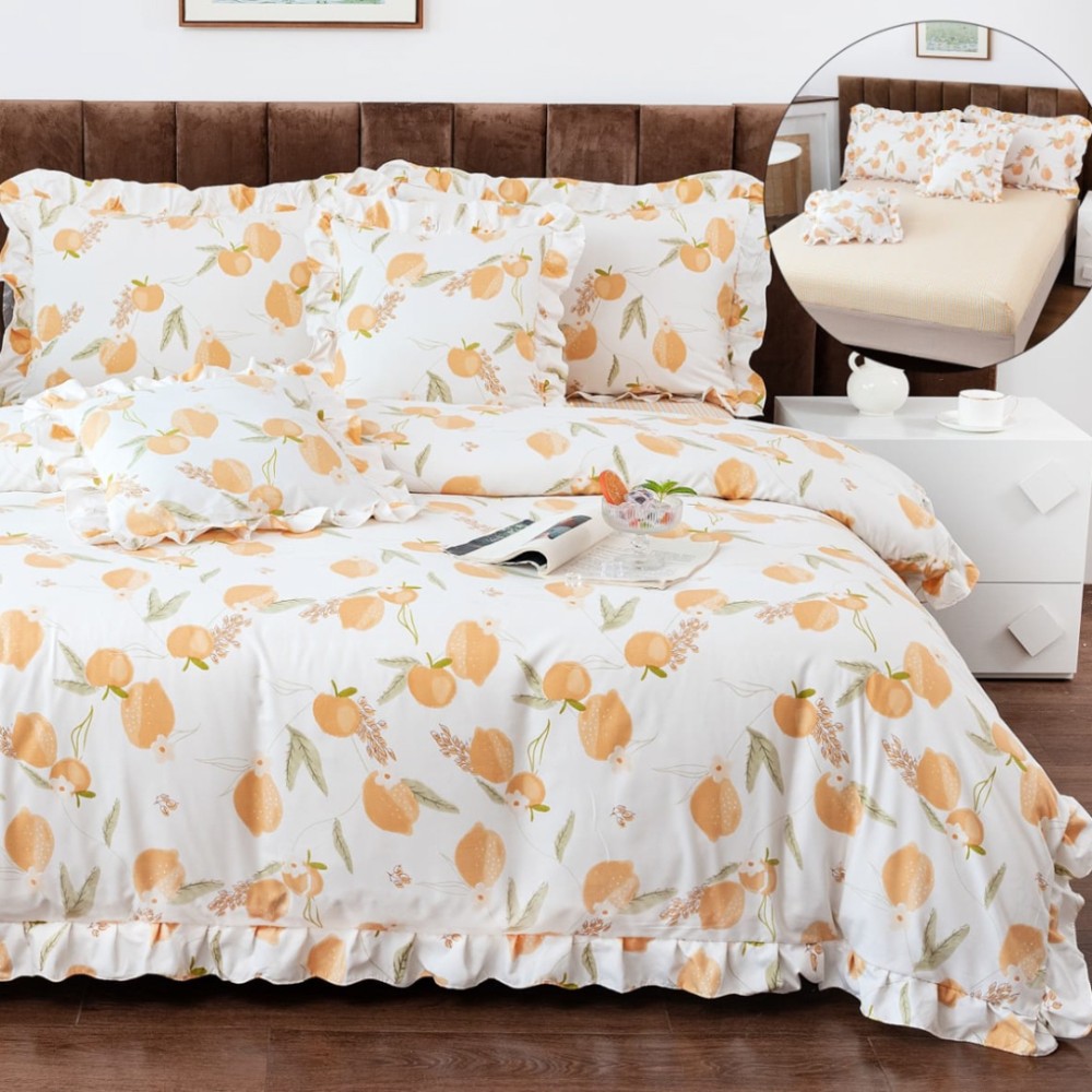 Lenjerie pat dublu, Finet cu Volanase, CEARSAF CU ELASTIC, 6 piese, Alb, Portocale, Casa Minunata, cod produs: INS-BFV12