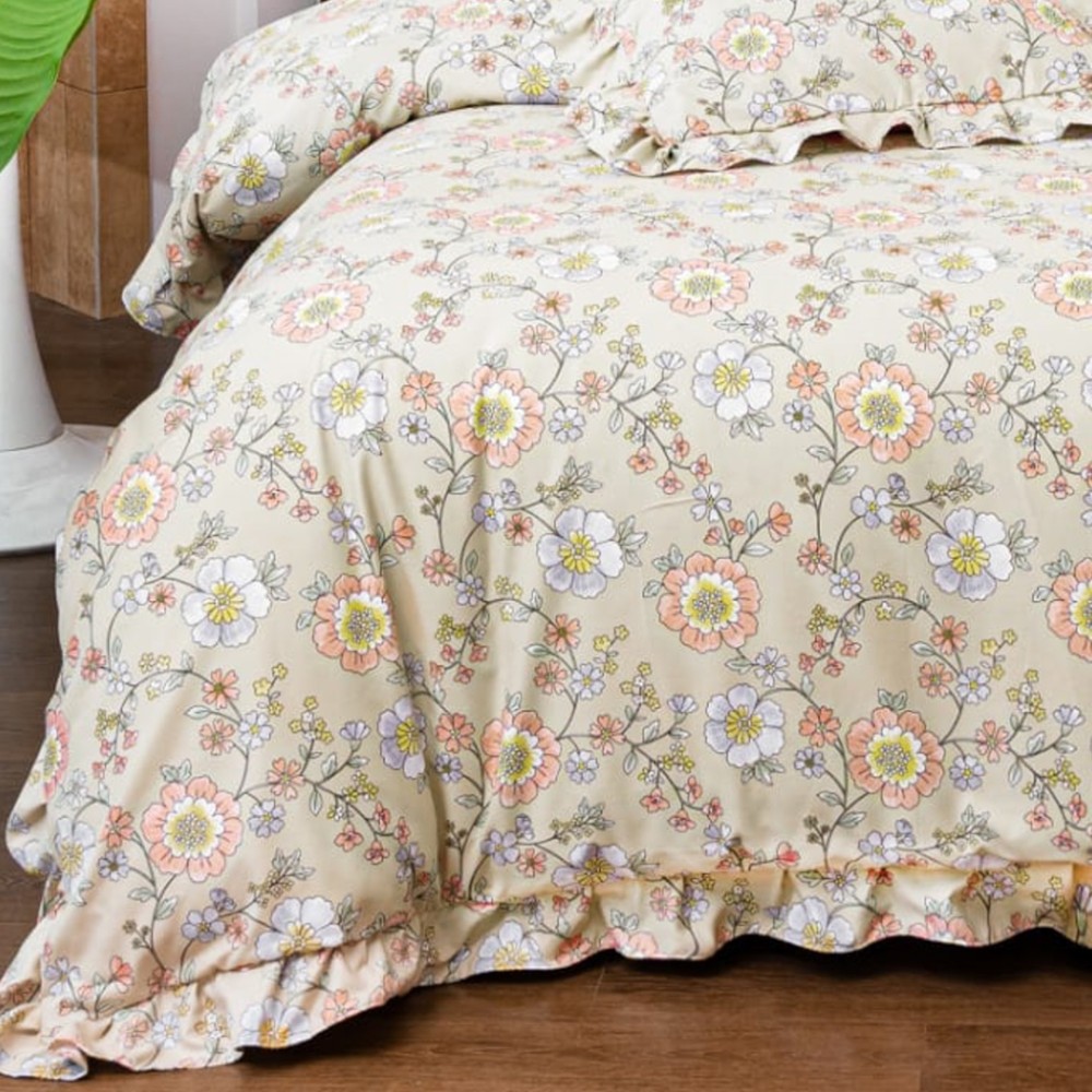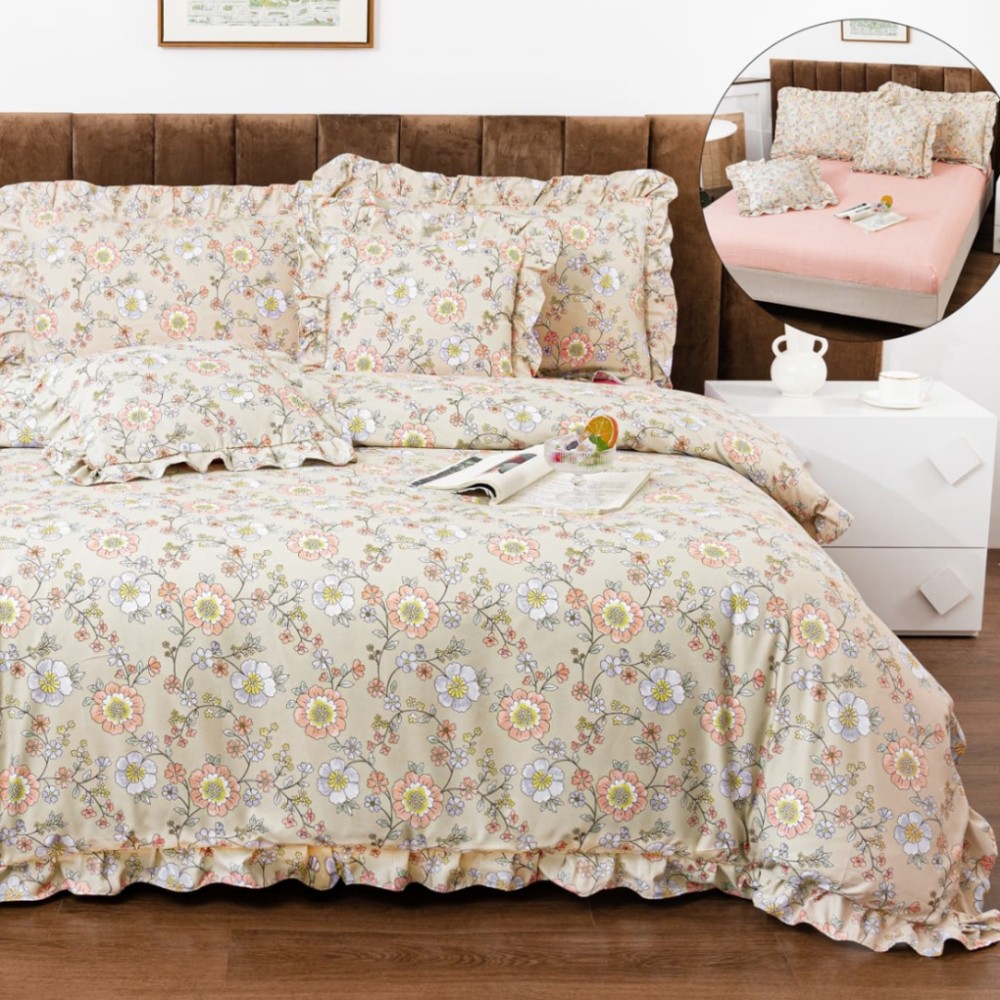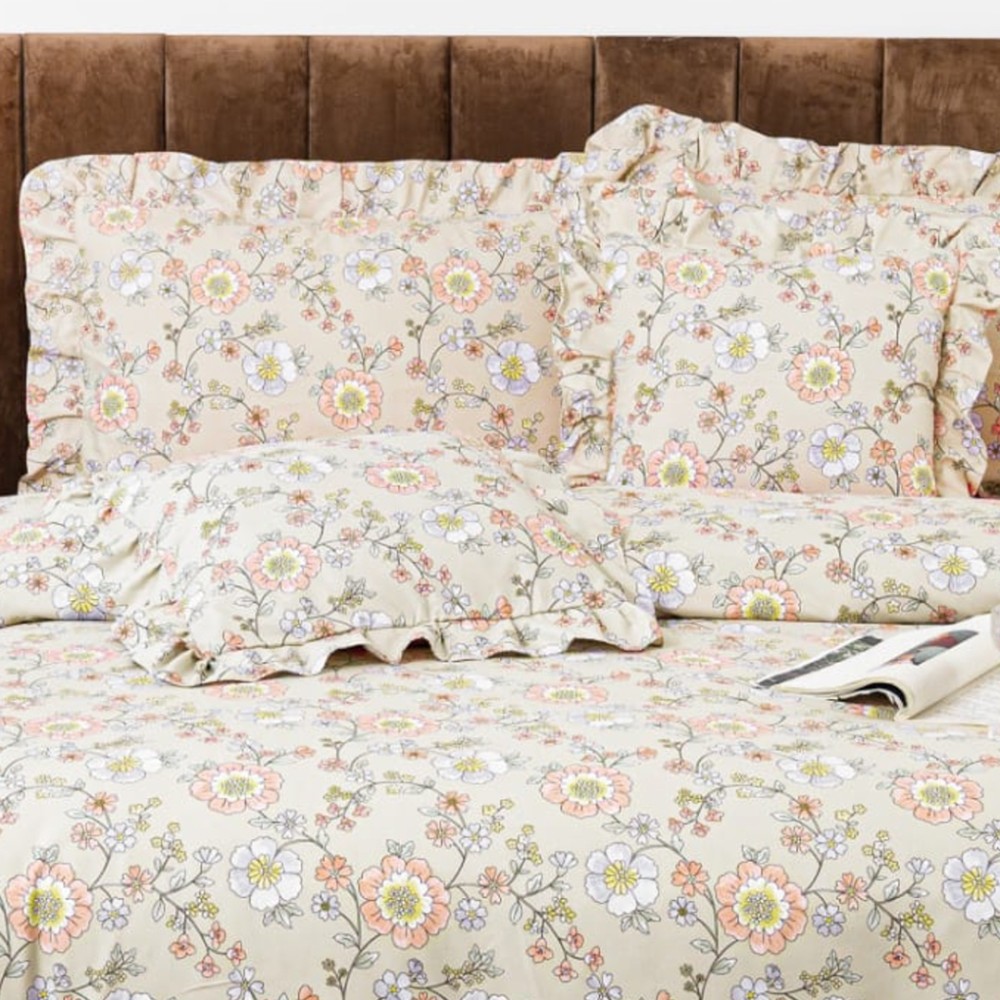 Lenjerie pat dublu, Finet cu Volanase, CEARSAF CU ELASTIC, 6 piese, Bej, Flori, Casa Minunata, cod produs: INS-BFV04