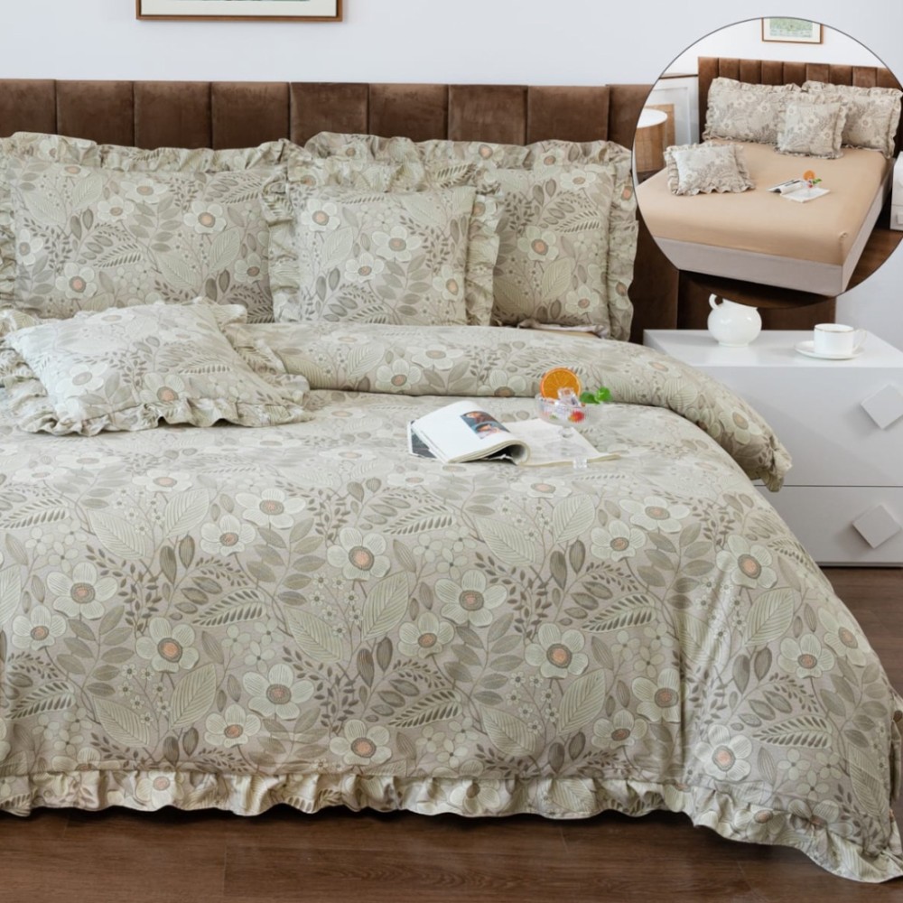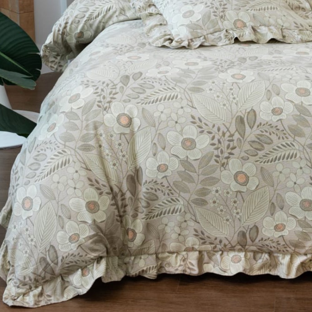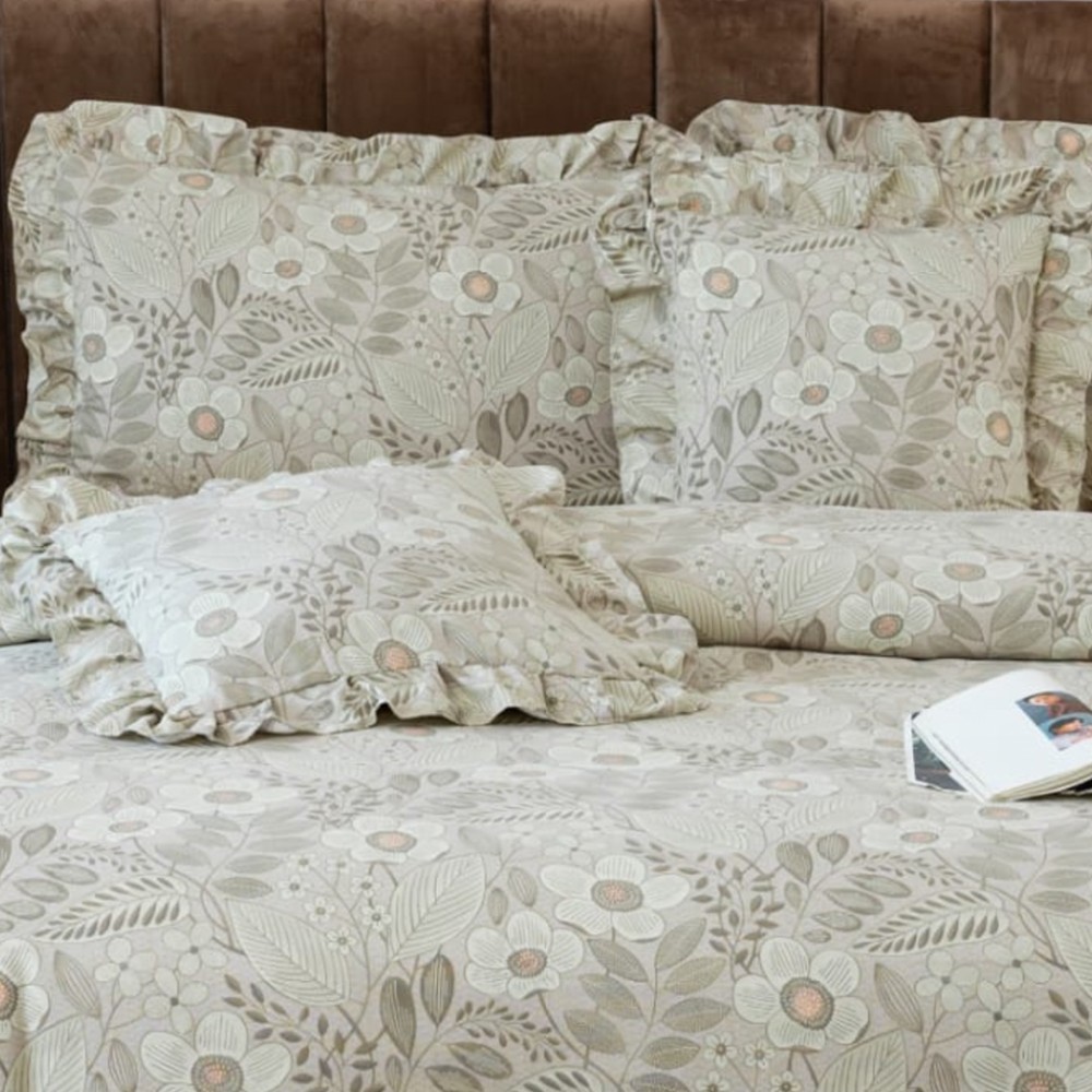 Cu volănașe fine și ușor încrețite pe cearșaful de pilotă și fețele de pernă, acest set transformă orice pat într-un spațiu sofisticat și primitor. Cearșaful de pat cu elastic se fixează perfect pe saltea, asigurând stabilitate și confort pe durata nopții.