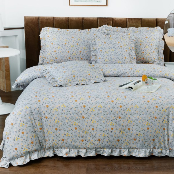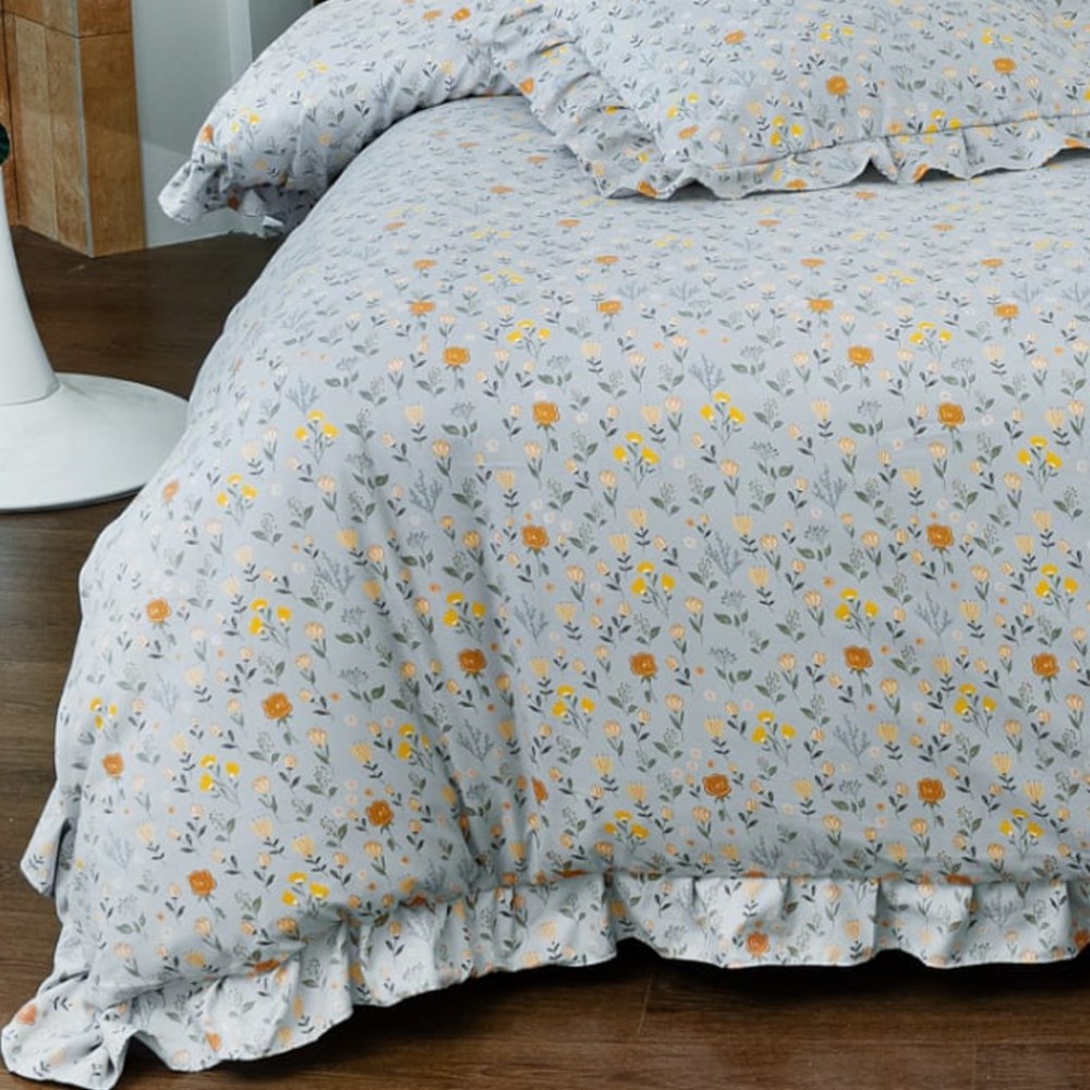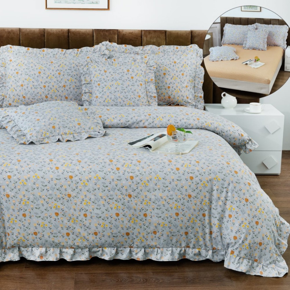 Lenjerie pat dublu, Finet cu Volanase, CEARSAF CU ELASTIC, 6 piese, Gri Albăstrui, Flori, Casa Minunata, cod produs: INS-BFV11